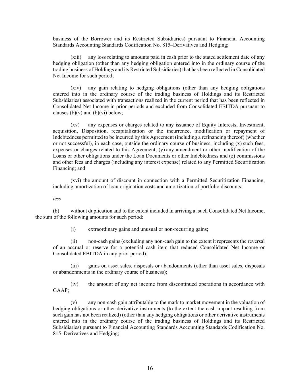 16 business of the Borrower and its Restricted Subsidiaries) pursuant to Financial Accounting Standards Accounting Standards Codification No. 815–Derivatives and Hedging; (xiii) any loss relating to amounts paid in cash prior to the stated settlement date of any hedging obligation (other than any hedging obligation entered into in the ordinary course of the trading business of Holdings and its Restricted Subsidiaries) that has been reflected in Consolidated Net Income for such period; (xiv) any gain relating to hedging obligations (other than any hedging obligations entered into in the ordinary course of the trading business of Holdings and its Restricted Subsidiaries) associated with transactions realized in the current period that has been reflected in Consolidated Net Income in prior periods and excluded from Consolidated EBITDA pursuant to clauses (b)(v) and (b)(vi) below; (xv) any expenses or charges related to any issuance of Equity Interests, Investment, acquisition, Disposition, recapitalization or the incurrence, modification or repayment of Indebtedness permitted to be incurred by this Agreement (including a refinancing thereof) (whether or not successful), in each case, outside the ordinary course of business, including (x) such fees, expenses or charges related to this Agreement, (y) any amendment or other modification of the Loans or other obligations under the Loan Documents or other Indebtedness and (z) commissions and other fees and charges (including any interest expense) related to any Permitted Securitization Financing; and (xvi) the amount of discount in connection with a Permitted Securitization Financing, including amortization of loan origination costs and amortization of portfolio discounts; less (b) without duplication and to the extent included in arriving at such Consolidated Net Income, the sum of the following amounts for such period: (i) extraordinary gains and unusual or non-recurring gains; (ii) non-cash gains (excluding any non-cash gain to the extent it represents the reversal of an accrual or reserve for a potential cash item that reduced Consolidated Net Income or Consolidated EBITDA in any prior period); (iii) gains on asset sales, disposals or abandonments (other than asset sales, disposals or abandonments in the ordinary course of business); (iv) the amount of any net income from discontinued operations in accordance with GAAP; (v) any non-cash gain attributable to the mark to market movement in the valuation of hedging obligations or other derivative instruments (to the extent the cash impact resulting from such gain has not been realized) (other than any hedging obligations or other derivative instruments entered into in the ordinary course of the trading business of Holdings and its Restricted Subsidiaries) pursuant to Financial Accounting Standards Accounting Standards Codification No. 815–Derivatives and Hedging;