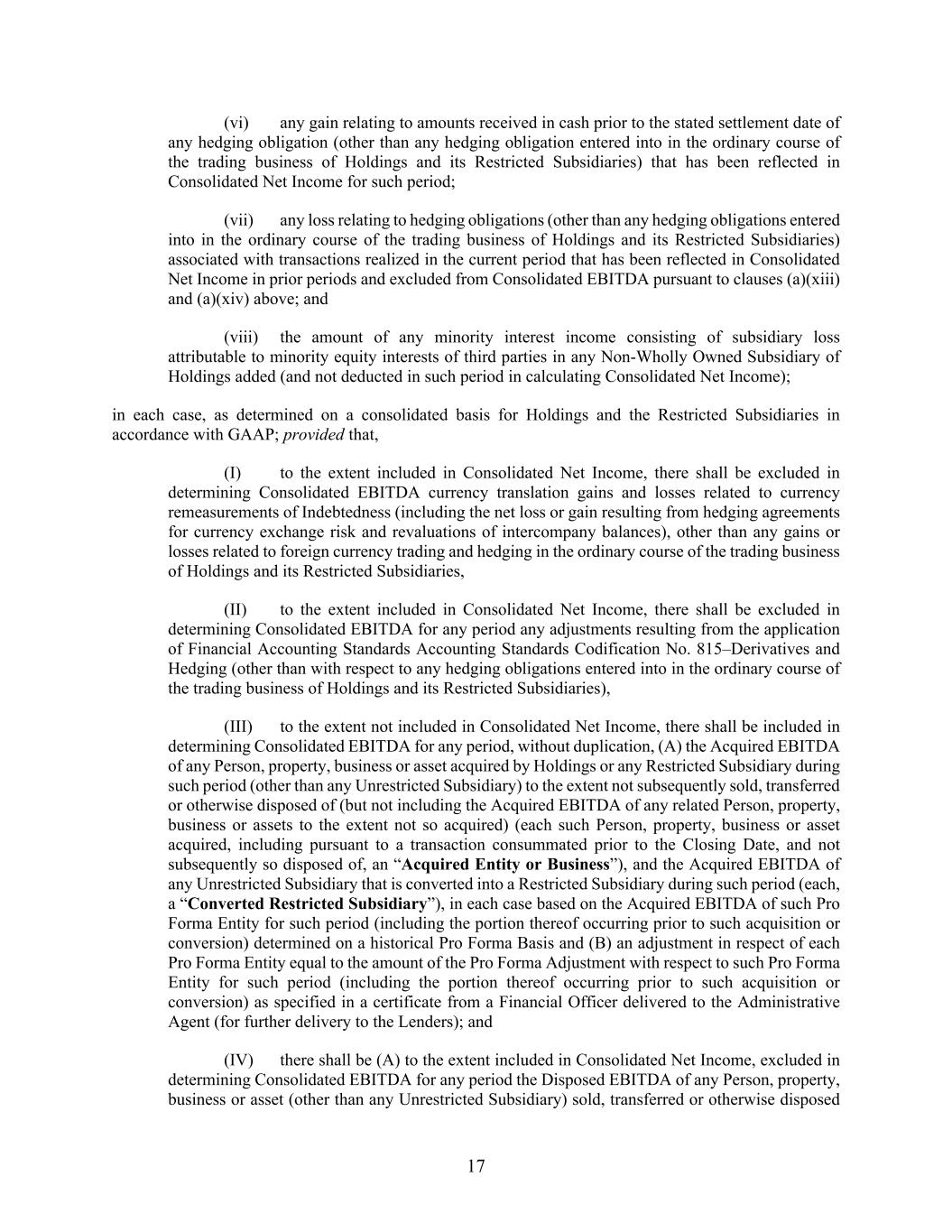 17 (vi) any gain relating to amounts received in cash prior to the stated settlement date of any hedging obligation (other than any hedging obligation entered into in the ordinary course of the trading business of Holdings and its Restricted Subsidiaries) that has been reflected in Consolidated Net Income for such period; (vii) any loss relating to hedging obligations (other than any hedging obligations entered into in the ordinary course of the trading business of Holdings and its Restricted Subsidiaries) associated with transactions realized in the current period that has been reflected in Consolidated Net Income in prior periods and excluded from Consolidated EBITDA pursuant to clauses (a)(xiii) and (a)(xiv) above; and (viii) the amount of any minority interest income consisting of subsidiary loss attributable to minority equity interests of third parties in any Non-Wholly Owned Subsidiary of Holdings added (and not deducted in such period in calculating Consolidated Net Income); in each case, as determined on a consolidated basis for Holdings and the Restricted Subsidiaries in accordance with GAAP; provided that, (I) to the extent included in Consolidated Net Income, there shall be excluded in determining Consolidated EBITDA currency translation gains and losses related to currency remeasurements of Indebtedness (including the net loss or gain resulting from hedging agreements for currency exchange risk and revaluations of intercompany balances), other than any gains or losses related to foreign currency trading and hedging in the ordinary course of the trading business of Holdings and its Restricted Subsidiaries, (II) to the extent included in Consolidated Net Income, there shall be excluded in determining Consolidated EBITDA for any period any adjustments resulting from the application of Financial Accounting Standards Accounting Standards Codification No. 815–Derivatives and Hedging (other than with respect to any hedging obligations entered into in the ordinary course of the trading business of Holdings and its Restricted Subsidiaries), (III) to the extent not included in Consolidated Net Income, there shall be included in determining Consolidated EBITDA for any period, without duplication, (A) the Acquired EBITDA of any Person, property, business or asset acquired by Holdings or any Restricted Subsidiary during such period (other than any Unrestricted Subsidiary) to the extent not subsequently sold, transferred or otherwise disposed of (but not including the Acquired EBITDA of any related Person, property, business or assets to the extent not so acquired) (each such Person, property, business or asset acquired, including pursuant to a transaction consummated prior to the Closing Date, and not subsequently so disposed of, an “Acquired Entity or Business”), and the Acquired EBITDA of any Unrestricted Subsidiary that is converted into a Restricted Subsidiary during such period (each, a “Converted Restricted Subsidiary”), in each case based on the Acquired EBITDA of such Pro Forma Entity for such period (including the portion thereof occurring prior to such acquisition or conversion) determined on a historical Pro Forma Basis and (B) an adjustment in respect of each Pro Forma Entity equal to the amount of the Pro Forma Adjustment with respect to such Pro Forma Entity for such period (including the portion thereof occurring prior to such acquisition or conversion) as specified in a certificate from a Financial Officer delivered to the Administrative Agent (for further delivery to the Lenders); and (IV) there shall be (A) to the extent included in Consolidated Net Income, excluded in determining Consolidated EBITDA for any period the Disposed EBITDA of any Person, property, business or asset (other than any Unrestricted Subsidiary) sold, transferred or otherwise disposed