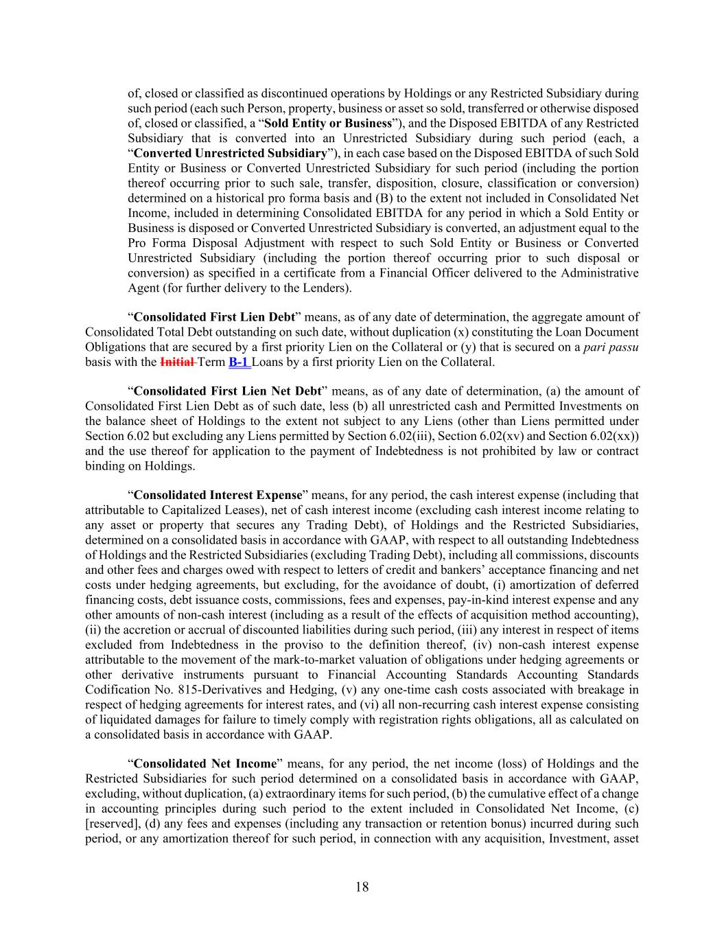 18 of, closed or classified as discontinued operations by Holdings or any Restricted Subsidiary during such period (each such Person, property, business or asset so sold, transferred or otherwise disposed of, closed or classified, a “Sold Entity or Business”), and the Disposed EBITDA of any Restricted Subsidiary that is converted into an Unrestricted Subsidiary during such period (each, a “Converted Unrestricted Subsidiary”), in each case based on the Disposed EBITDA of such Sold Entity or Business or Converted Unrestricted Subsidiary for such period (including the portion thereof occurring prior to such sale, transfer, disposition, closure, classification or conversion) determined on a historical pro forma basis and (B) to the extent not included in Consolidated Net Income, included in determining Consolidated EBITDA for any period in which a Sold Entity or Business is disposed or Converted Unrestricted Subsidiary is converted, an adjustment equal to the Pro Forma Disposal Adjustment with respect to such Sold Entity or Business or Converted Unrestricted Subsidiary (including the portion thereof occurring prior to such disposal or conversion) as specified in a certificate from a Financial Officer delivered to the Administrative Agent (for further delivery to the Lenders). “Consolidated First Lien Debt” means, as of any date of determination, the aggregate amount of Consolidated Total Debt outstanding on such date, without duplication (x) constituting the Loan Document Obligations that are secured by a first priority Lien on the Collateral or (y) that is secured on a pari passu basis with the Initial Term B-1 Loans by a first priority Lien on the Collateral. “Consolidated First Lien Net Debt” means, as of any date of determination, (a) the amount of Consolidated First Lien Debt as of such date, less (b) all unrestricted cash and Permitted Investments on the balance sheet of Holdings to the extent not subject to any Liens (other than Liens permitted under Section 6.02 but excluding any Liens permitted by Section 6.02(iii), Section 6.02(xv) and Section 6.02(xx)) and the use thereof for application to the payment of Indebtedness is not prohibited by law or contract binding on Holdings. “Consolidated Interest Expense” means, for any period, the cash interest expense (including that attributable to Capitalized Leases), net of cash interest income (excluding cash interest income relating to any asset or property that secures any Trading Debt), of Holdings and the Restricted Subsidiaries, determined on a consolidated basis in accordance with GAAP, with respect to all outstanding Indebtedness of Holdings and the Restricted Subsidiaries (excluding Trading Debt), including all commissions, discounts and other fees and charges owed with respect to letters of credit and bankers’ acceptance financing and net costs under hedging agreements, but excluding, for the avoidance of doubt, (i) amortization of deferred financing costs, debt issuance costs, commissions, fees and expenses, pay-in-kind interest expense and any other amounts of non-cash interest (including as a result of the effects of acquisition method accounting), (ii) the accretion or accrual of discounted liabilities during such period, (iii) any interest in respect of items excluded from Indebtedness in the proviso to the definition thereof, (iv) non-cash interest expense attributable to the movement of the mark-to-market valuation of obligations under hedging agreements or other derivative instruments pursuant to Financial Accounting Standards Accounting Standards Codification No. 815-Derivatives and Hedging, (v) any one-time cash costs associated with breakage in respect of hedging agreements for interest rates, and (vi) all non-recurring cash interest expense consisting of liquidated damages for failure to timely comply with registration rights obligations, all as calculated on a consolidated basis in accordance with GAAP. “Consolidated Net Income” means, for any period, the net income (loss) of Holdings and the Restricted Subsidiaries for such period determined on a consolidated basis in accordance with GAAP, excluding, without duplication, (a) extraordinary items for such period, (b) the cumulative effect of a change in accounting principles during such period to the extent included in Consolidated Net Income, (c) [reserved], (d) any fees and expenses (including any transaction or retention bonus) incurred during such period, or any amortization thereof for such period, in connection with any acquisition, Investment, asset