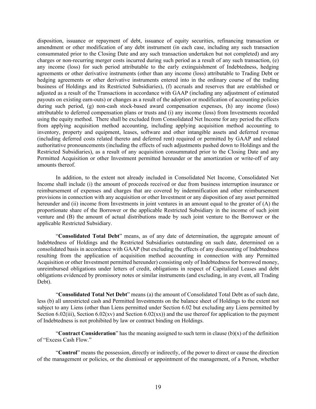 19 disposition, issuance or repayment of debt, issuance of equity securities, refinancing transaction or amendment or other modification of any debt instrument (in each case, including any such transaction consummated prior to the Closing Date and any such transaction undertaken but not completed) and any charges or non-recurring merger costs incurred during such period as a result of any such transaction, (e) any income (loss) for such period attributable to the early extinguishment of Indebtedness, hedging agreements or other derivative instruments (other than any income (loss) attributable to Trading Debt or hedging agreements or other derivative instruments entered into in the ordinary course of the trading business of Holdings and its Restricted Subsidiaries), (f) accruals and reserves that are established or adjusted as a result of the Transactions in accordance with GAAP (including any adjustment of estimated payouts on existing earn-outs) or changes as a result of the adoption or modification of accounting policies during such period, (g) non-cash stock-based award compensation expenses, (h) any income (loss) attributable to deferred compensation plans or trusts and (i) any income (loss) from Investments recorded using the equity method. There shall be excluded from Consolidated Net Income for any period the effects from applying acquisition method accounting, including applying acquisition method accounting to inventory, property and equipment, leases, software and other intangible assets and deferred revenue (including deferred costs related thereto and deferred rent) required or permitted by GAAP and related authoritative pronouncements (including the effects of such adjustments pushed down to Holdings and the Restricted Subsidiaries), as a result of any acquisition consummated prior to the Closing Date and any Permitted Acquisition or other Investment permitted hereunder or the amortization or write-off of any amounts thereof. In addition, to the extent not already included in Consolidated Net Income, Consolidated Net Income shall include (i) the amount of proceeds received or due from business interruption insurance or reimbursement of expenses and charges that are covered by indemnification and other reimbursement provisions in connection with any acquisition or other Investment or any disposition of any asset permitted hereunder and (ii) income from Investments in joint ventures in an amount equal to the greater of (A) the proportionate share of the Borrower or the applicable Restricted Subsidiary in the income of such joint venture and (B) the amount of actual distributions made by such joint venture to the Borrower or the applicable Restricted Subsidiary. “Consolidated Total Debt” means, as of any date of determination, the aggregate amount of Indebtedness of Holdings and the Restricted Subsidiaries outstanding on such date, determined on a consolidated basis in accordance with GAAP (but excluding the effects of any discounting of Indebtedness resulting from the application of acquisition method accounting in connection with any Permitted Acquisition or other Investment permitted hereunder) consisting only of Indebtedness for borrowed money, unreimbursed obligations under letters of credit, obligations in respect of Capitalized Leases and debt obligations evidenced by promissory notes or similar instruments (and excluding, in any event, all Trading Debt). “Consolidated Total Net Debt” means (a) the amount of Consolidated Total Debt as of such date, less (b) all unrestricted cash and Permitted Investments on the balance sheet of Holdings to the extent not subject to any Liens (other than Liens permitted under Section 6.02 but excluding any Liens permitted by Section 6.02(iii), Section 6.02(xv) and Section 6.02(xx)) and the use thereof for application to the payment of Indebtedness is not prohibited by law or contract binding on Holdings. “Contract Consideration” has the meaning assigned to such term in clause (b)(x) of the definition of “Excess Cash Flow.” “Control” means the possession, directly or indirectly, of the power to direct or cause the direction of the management or policies, or the dismissal or appointment of the management, of a Person, whether