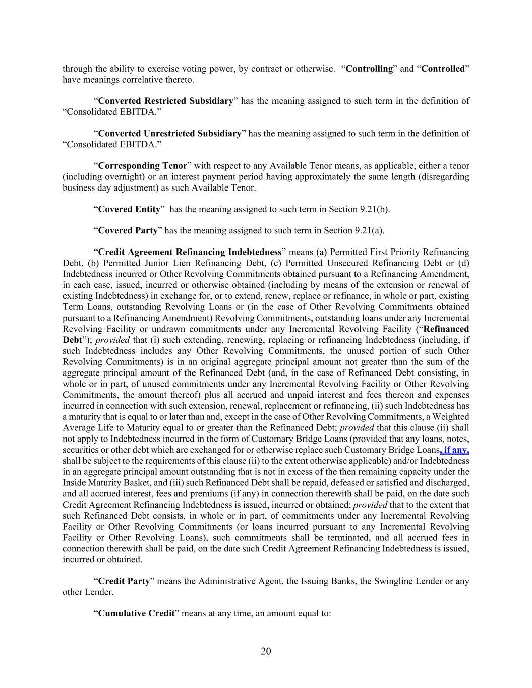 20 through the ability to exercise voting power, by contract or otherwise. “Controlling” and “Controlled” have meanings correlative thereto. “Converted Restricted Subsidiary” has the meaning assigned to such term in the definition of “Consolidated EBITDA.” “Converted Unrestricted Subsidiary” has the meaning assigned to such term in the definition of “Consolidated EBITDA.” “Corresponding Tenor” with respect to any Available Tenor means, as applicable, either a tenor (including overnight) or an interest payment period having approximately the same length (disregarding business day adjustment) as such Available Tenor. “Covered Entity” has the meaning assigned to such term in Section 9.21(b). “Covered Party” has the meaning assigned to such term in Section 9.21(a). “Credit Agreement Refinancing Indebtedness” means (a) Permitted First Priority Refinancing Debt, (b) Permitted Junior Lien Refinancing Debt, (c) Permitted Unsecured Refinancing Debt or (d) Indebtedness incurred or Other Revolving Commitments obtained pursuant to a Refinancing Amendment, in each case, issued, incurred or otherwise obtained (including by means of the extension or renewal of existing Indebtedness) in exchange for, or to extend, renew, replace or refinance, in whole or part, existing Term Loans, outstanding Revolving Loans or (in the case of Other Revolving Commitments obtained pursuant to a Refinancing Amendment) Revolving Commitments, outstanding loans under any Incremental Revolving Facility or undrawn commitments under any Incremental Revolving Facility (“Refinanced Debt”); provided that (i) such extending, renewing, replacing or refinancing Indebtedness (including, if such Indebtedness includes any Other Revolving Commitments, the unused portion of such Other Revolving Commitments) is in an original aggregate principal amount not greater than the sum of the aggregate principal amount of the Refinanced Debt (and, in the case of Refinanced Debt consisting, in whole or in part, of unused commitments under any Incremental Revolving Facility or Other Revolving Commitments, the amount thereof) plus all accrued and unpaid interest and fees thereon and expenses incurred in connection with such extension, renewal, replacement or refinancing, (ii) such Indebtedness has a maturity that is equal to or later than and, except in the case of Other Revolving Commitments, a Weighted Average Life to Maturity equal to or greater than the Refinanced Debt; provided that this clause (ii) shall not apply to Indebtedness incurred in the form of Customary Bridge Loans (provided that any loans, notes, securities or other debt which are exchanged for or otherwise replace such Customary Bridge Loans, if any, shall be subject to the requirements of this clause (ii) to the extent otherwise applicable) and/or Indebtedness in an aggregate principal amount outstanding that is not in excess of the then remaining capacity under the Inside Maturity Basket, and (iii) such Refinanced Debt shall be repaid, defeased or satisfied and discharged, and all accrued interest, fees and premiums (if any) in connection therewith shall be paid, on the date such Credit Agreement Refinancing Indebtedness is issued, incurred or obtained; provided that to the extent that such Refinanced Debt consists, in whole or in part, of commitments under any Incremental Revolving Facility or Other Revolving Commitments (or loans incurred pursuant to any Incremental Revolving Facility or Other Revolving Loans), such commitments shall be terminated, and all accrued fees in connection therewith shall be paid, on the date such Credit Agreement Refinancing Indebtedness is issued, incurred or obtained. “Credit Party” means the Administrative Agent, the Issuing Banks, the Swingline Lender or any other Lender. “Cumulative Credit” means at any time, an amount equal to: