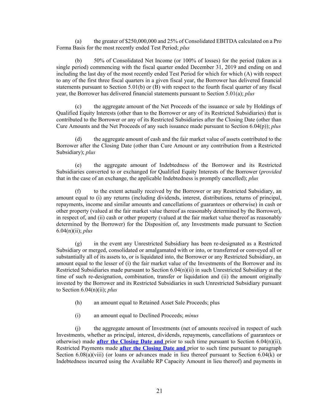 21 (a) the greater of $250,000,000 and 25% of Consolidated EBITDA calculated on a Pro Forma Basis for the most recently ended Test Period; plus (b) 50% of Consolidated Net Income (or 100% of losses) for the period (taken as a single period) commencing with the fiscal quarter ended December 31, 2019 and ending on and including the last day of the most recently ended Test Period for which for which (A) with respect to any of the first three fiscal quarters in a given fiscal year, the Borrower has delivered financial statements pursuant to Section 5.01(b) or (B) with respect to the fourth fiscal quarter of any fiscal year, the Borrower has delivered financial statements pursuant to Section 5.01(a); plus (c) the aggregate amount of the Net Proceeds of the issuance or sale by Holdings of Qualified Equity Interests (other than to the Borrower or any of its Restricted Subsidiaries) that is contributed to the Borrower or any of its Restricted Subsidiaries after the Closing Date (other than Cure Amounts and the Net Proceeds of any such issuance made pursuant to Section 6.04(p)); plus (d) the aggregate amount of cash and the fair market value of assets contributed to the Borrower after the Closing Date (other than Cure Amount or any contribution from a Restricted Subsidiary); plus (e) the aggregate amount of Indebtedness of the Borrower and its Restricted Subsidiaries converted to or exchanged for Qualified Equity Interests of the Borrower (provided that in the case of an exchange, the applicable Indebtedness is promptly cancelled); plus (f) to the extent actually received by the Borrower or any Restricted Subsidiary, an amount equal to (i) any returns (including dividends, interest, distributions, returns of principal, repayments, income and similar amounts and cancellations of guarantees or otherwise) in cash or other property (valued at the fair market value thereof as reasonably determined by the Borrower), in respect of, and (ii) cash or other property (valued at the fair market value thereof as reasonably determined by the Borrower) for the Disposition of, any Investments made pursuant to Section 6.04(n)(ii); plus (g) in the event any Unrestricted Subsidiary has been re-designated as a Restricted Subsidiary or merged, consolidated or amalgamated with or into, or transferred or conveyed all or substantially all of its assets to, or is liquidated into, the Borrower or any Restricted Subsidiary, an amount equal to the lesser of (i) the fair market value of the Investments of the Borrower and its Restricted Subsidiaries made pursuant to Section 6.04(n)(ii) in such Unrestricted Subsidiary at the time of such re-designation, combination, transfer or liquidation and (ii) the amount originally invested by the Borrower and its Restricted Subsidiaries in such Unrestricted Subsidiary pursuant to Section 6.04(n)(ii); plus (h) an amount equal to Retained Asset Sale Proceeds; plus (i) an amount equal to Declined Proceeds; minus (j) the aggregate amount of Investments (net of amounts received in respect of such Investments, whether as principal, interest, dividends, repayments, cancellations of guarantees or otherwise) made after the Closing Date and prior to such time pursuant to Section 6.04(n)(ii), Restricted Payments made after the Closing Date and prior to such time pursuant to paragraph Section 6.08(a)(viii) (or loans or advances made in lieu thereof pursuant to Section 6.04(k) or Indebtedness incurred using the Available RP Capacity Amount in lieu thereof) and payments in