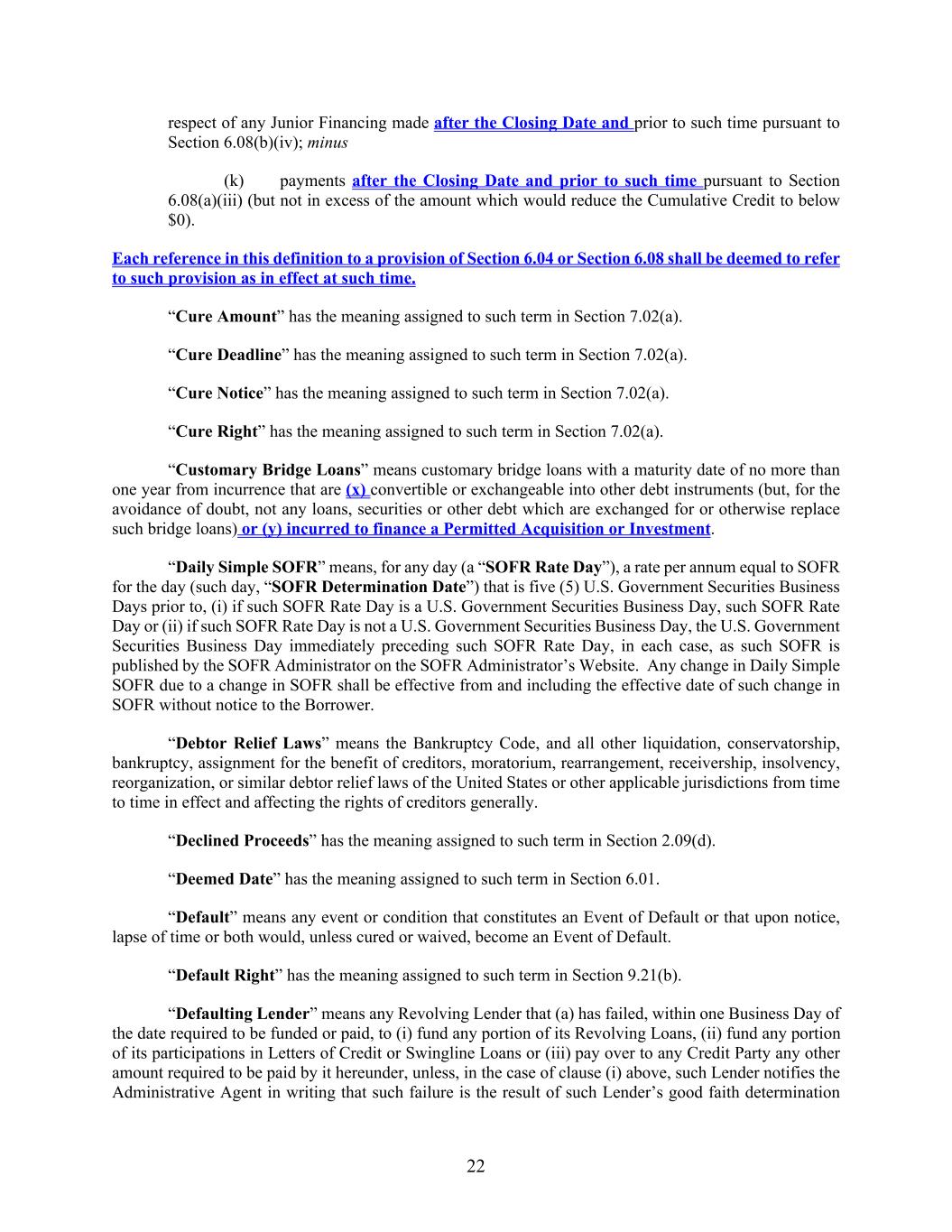 22 respect of any Junior Financing made after the Closing Date and prior to such time pursuant to Section 6.08(b)(iv); minus (k) payments after the Closing Date and prior to such time pursuant to Section 6.08(a)(iii) (but not in excess of the amount which would reduce the Cumulative Credit to below $0). Each reference in this definition to a provision of Section 6.04 or Section 6.08 shall be deemed to refer to such provision as in effect at such time. “Cure Amount” has the meaning assigned to such term in Section 7.02(a). “Cure Deadline” has the meaning assigned to such term in Section 7.02(a). “Cure Notice” has the meaning assigned to such term in Section 7.02(a). “Cure Right” has the meaning assigned to such term in Section 7.02(a). “Customary Bridge Loans” means customary bridge loans with a maturity date of no more than one year from incurrence that are (x) convertible or exchangeable into other debt instruments (but, for the avoidance of doubt, not any loans, securities or other debt which are exchanged for or otherwise replace such bridge loans) or (y) incurred to finance a Permitted Acquisition or Investment. “Daily Simple SOFR” means, for any day (a “SOFR Rate Day”), a rate per annum equal to SOFR for the day (such day, “SOFR Determination Date”) that is five (5) U.S. Government Securities Business Days prior to, (i) if such SOFR Rate Day is a U.S. Government Securities Business Day, such SOFR Rate Day or (ii) if such SOFR Rate Day is not a U.S. Government Securities Business Day, the U.S. Government Securities Business Day immediately preceding such SOFR Rate Day, in each case, as such SOFR is published by the SOFR Administrator on the SOFR Administrator’s Website. Any change in Daily Simple SOFR due to a change in SOFR shall be effective from and including the effective date of such change in SOFR without notice to the Borrower. “Debtor Relief Laws” means the Bankruptcy Code, and all other liquidation, conservatorship, bankruptcy, assignment for the benefit of creditors, moratorium, rearrangement, receivership, insolvency, reorganization, or similar debtor relief laws of the United States or other applicable jurisdictions from time to time in effect and affecting the rights of creditors generally. “Declined Proceeds” has the meaning assigned to such term in Section 2.09(d). “Deemed Date” has the meaning assigned to such term in Section 6.01. “Default” means any event or condition that constitutes an Event of Default or that upon notice, lapse of time or both would, unless cured or waived, become an Event of Default. “Default Right” has the meaning assigned to such term in Section 9.21(b). “Defaulting Lender” means any Revolving Lender that (a) has failed, within one Business Day of the date required to be funded or paid, to (i) fund any portion of its Revolving Loans, (ii) fund any portion of its participations in Letters of Credit or Swingline Loans or (iii) pay over to any Credit Party any other amount required to be paid by it hereunder, unless, in the case of clause (i) above, such Lender notifies the Administrative Agent in writing that such failure is the result of such Lender’s good faith determination