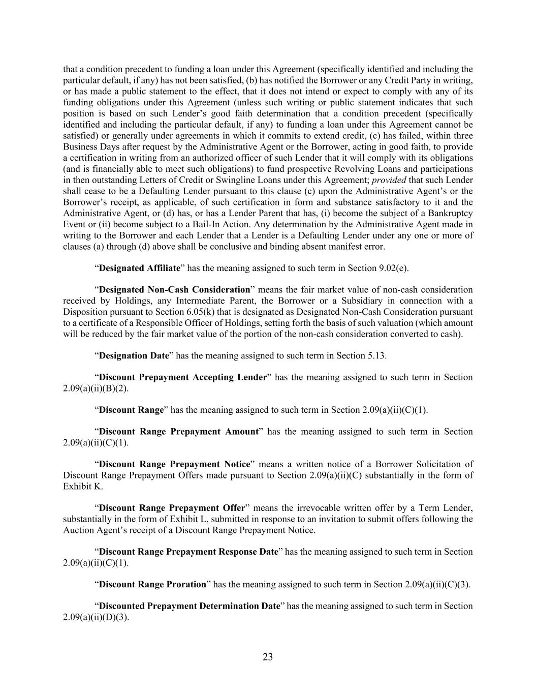 23 that a condition precedent to funding a loan under this Agreement (specifically identified and including the particular default, if any) has not been satisfied, (b) has notified the Borrower or any Credit Party in writing, or has made a public statement to the effect, that it does not intend or expect to comply with any of its funding obligations under this Agreement (unless such writing or public statement indicates that such position is based on such Lender’s good faith determination that a condition precedent (specifically identified and including the particular default, if any) to funding a loan under this Agreement cannot be satisfied) or generally under agreements in which it commits to extend credit, (c) has failed, within three Business Days after request by the Administrative Agent or the Borrower, acting in good faith, to provide a certification in writing from an authorized officer of such Lender that it will comply with its obligations (and is financially able to meet such obligations) to fund prospective Revolving Loans and participations in then outstanding Letters of Credit or Swingline Loans under this Agreement; provided that such Lender shall cease to be a Defaulting Lender pursuant to this clause (c) upon the Administrative Agent’s or the Borrower’s receipt, as applicable, of such certification in form and substance satisfactory to it and the Administrative Agent, or (d) has, or has a Lender Parent that has, (i) become the subject of a Bankruptcy Event or (ii) become subject to a Bail-In Action. Any determination by the Administrative Agent made in writing to the Borrower and each Lender that a Lender is a Defaulting Lender under any one or more of clauses (a) through (d) above shall be conclusive and binding absent manifest error. “Designated Affiliate” has the meaning assigned to such term in Section 9.02(e). “Designated Non-Cash Consideration” means the fair market value of non-cash consideration received by Holdings, any Intermediate Parent, the Borrower or a Subsidiary in connection with a Disposition pursuant to Section 6.05(k) that is designated as Designated Non-Cash Consideration pursuant to a certificate of a Responsible Officer of Holdings, setting forth the basis of such valuation (which amount will be reduced by the fair market value of the portion of the non-cash consideration converted to cash). “Designation Date” has the meaning assigned to such term in Section 5.13. “Discount Prepayment Accepting Lender” has the meaning assigned to such term in Section 2.09(a)(ii)(B)(2). “Discount Range” has the meaning assigned to such term in Section 2.09(a)(ii)(C)(1). “Discount Range Prepayment Amount” has the meaning assigned to such term in Section 2.09(a)(ii)(C)(1). “Discount Range Prepayment Notice” means a written notice of a Borrower Solicitation of Discount Range Prepayment Offers made pursuant to Section 2.09(a)(ii)(C) substantially in the form of Exhibit K. “Discount Range Prepayment Offer” means the irrevocable written offer by a Term Lender, substantially in the form of Exhibit L, submitted in response to an invitation to submit offers following the Auction Agent’s receipt of a Discount Range Prepayment Notice. “Discount Range Prepayment Response Date” has the meaning assigned to such term in Section 2.09(a)(ii)(C)(1). “Discount Range Proration” has the meaning assigned to such term in Section 2.09(a)(ii)(C)(3). “Discounted Prepayment Determination Date” has the meaning assigned to such term in Section 2.09(a)(ii)(D)(3).