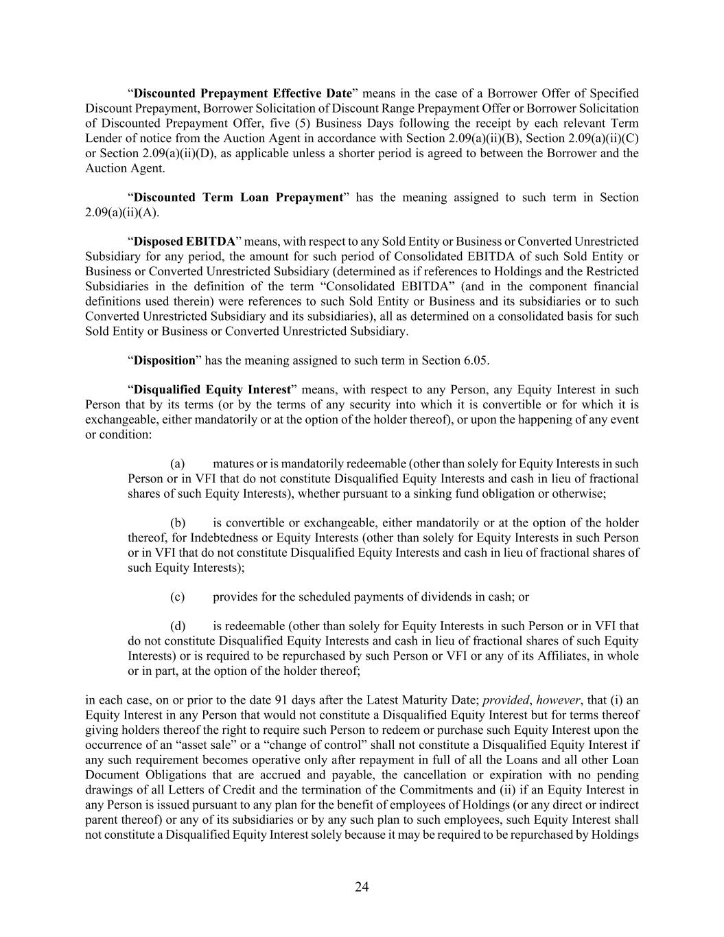 24 “Discounted Prepayment Effective Date” means in the case of a Borrower Offer of Specified Discount Prepayment, Borrower Solicitation of Discount Range Prepayment Offer or Borrower Solicitation of Discounted Prepayment Offer, five (5) Business Days following the receipt by each relevant Term Lender of notice from the Auction Agent in accordance with Section 2.09(a)(ii)(B), Section 2.09(a)(ii)(C) or Section 2.09(a)(ii)(D), as applicable unless a shorter period is agreed to between the Borrower and the Auction Agent. “Discounted Term Loan Prepayment” has the meaning assigned to such term in Section 2.09(a)(ii)(A). “Disposed EBITDA” means, with respect to any Sold Entity or Business or Converted Unrestricted Subsidiary for any period, the amount for such period of Consolidated EBITDA of such Sold Entity or Business or Converted Unrestricted Subsidiary (determined as if references to Holdings and the Restricted Subsidiaries in the definition of the term “Consolidated EBITDA” (and in the component financial definitions used therein) were references to such Sold Entity or Business and its subsidiaries or to such Converted Unrestricted Subsidiary and its subsidiaries), all as determined on a consolidated basis for such Sold Entity or Business or Converted Unrestricted Subsidiary. “Disposition” has the meaning assigned to such term in Section 6.05. “Disqualified Equity Interest” means, with respect to any Person, any Equity Interest in such Person that by its terms (or by the terms of any security into which it is convertible or for which it is exchangeable, either mandatorily or at the option of the holder thereof), or upon the happening of any event or condition: (a) matures or is mandatorily redeemable (other than solely for Equity Interests in such Person or in VFI that do not constitute Disqualified Equity Interests and cash in lieu of fractional shares of such Equity Interests), whether pursuant to a sinking fund obligation or otherwise; (b) is convertible or exchangeable, either mandatorily or at the option of the holder thereof, for Indebtedness or Equity Interests (other than solely for Equity Interests in such Person or in VFI that do not constitute Disqualified Equity Interests and cash in lieu of fractional shares of such Equity Interests); (c) provides for the scheduled payments of dividends in cash; or (d) is redeemable (other than solely for Equity Interests in such Person or in VFI that do not constitute Disqualified Equity Interests and cash in lieu of fractional shares of such Equity Interests) or is required to be repurchased by such Person or VFI or any of its Affiliates, in whole or in part, at the option of the holder thereof; in each case, on or prior to the date 91 days after the Latest Maturity Date; provided, however, that (i) an Equity Interest in any Person that would not constitute a Disqualified Equity Interest but for terms thereof giving holders thereof the right to require such Person to redeem or purchase such Equity Interest upon the occurrence of an “asset sale” or a “change of control” shall not constitute a Disqualified Equity Interest if any such requirement becomes operative only after repayment in full of all the Loans and all other Loan Document Obligations that are accrued and payable, the cancellation or expiration with no pending drawings of all Letters of Credit and the termination of the Commitments and (ii) if an Equity Interest in any Person is issued pursuant to any plan for the benefit of employees of Holdings (or any direct or indirect parent thereof) or any of its subsidiaries or by any such plan to such employees, such Equity Interest shall not constitute a Disqualified Equity Interest solely because it may be required to be repurchased by Holdings