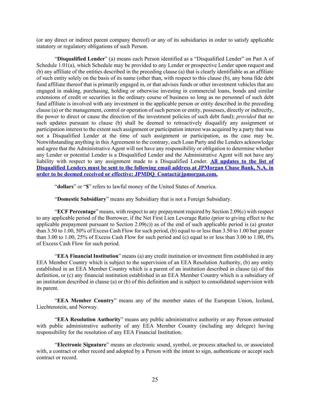 25 (or any direct or indirect parent company thereof) or any of its subsidiaries in order to satisfy applicable statutory or regulatory obligations of such Person. “Disqualified Lender” (a) means each Person identified as a “Disqualified Lender” on Part A of Schedule 1.01(a), which Schedule may be provided to any Lender or prospective Lender upon request and (b) any affiliate of the entities described in the preceding clause (a) that is clearly identifiable as an affiliate of such entity solely on the basis of its name (other than, with respect to this clause (b), any bona fide debt fund affiliate thereof that is primarily engaged in, or that advises funds or other investment vehicles that are engaged in making, purchasing, holding or otherwise investing in commercial loans, bonds and similar extensions of credit or securities in the ordinary course of business so long as no personnel of such debt fund affiliate is involved with any investment in the applicable person or entity described in the preceding clause (a) or the management, control or operation of such person or entity, possesses, directly or indirectly, the power to direct or cause the direction of the investment policies of such debt fund); provided that no such updates pursuant to clause (b) shall be deemed to retroactively disqualify any assignment or participation interest to the extent such assignment or participation interest was acquired by a party that was not a Disqualified Lender at the time of such assignment or participation, as the case may be. Notwithstanding anything in this Agreement to the contrary, each Loan Party and the Lenders acknowledge and agree that the Administrative Agent will not have any responsibility or obligation to determine whether any Lender or potential Lender is a Disqualified Lender and the Administrative Agent will not have any liability with respect to any assignment made to a Disqualified Lender. All updates to the list of Disqualified Lenders must be sent to the following email address at JPMorgan Chase Bank, N.A. in order to be deemed received or effective: JPMDQ_Contact@jpmorgan.com. “dollars” or “$” refers to lawful money of the United States of America. “Domestic Subsidiary” means any Subsidiary that is not a Foreign Subsidiary. “ECF Percentage” means, with respect to any prepayment required by Section 2.09(c) with respect to any applicable period of the Borrower, if the Net First Lien Leverage Ratio (prior to giving effect to the applicable prepayment pursuant to Section 2.09(c)) as of the end of such applicable period is (a) greater than 3.50 to 1.00, 50% of Excess Cash Flow for such period, (b) equal to or less than 3.50 to 1.00 but greater than 3.00 to 1.00, 25% of Excess Cash Flow for such period and (c) equal to or less than 3.00 to 1.00, 0% of Excess Cash Flow for such period. “EEA Financial Institution” means (a) any credit institution or investment firm established in any EEA Member Country which is subject to the supervision of an EEA Resolution Authority, (b) any entity established in an EEA Member Country which is a parent of an institution described in clause (a) of this definition, or (c) any financial institution established in an EEA Member Country which is a subsidiary of an institution described in clause (a) or (b) of this definition and is subject to consolidated supervision with its parent. “EEA Member Country” means any of the member states of the European Union, Iceland, Liechtenstein, and Norway. “EEA Resolution Authority” means any public administrative authority or any Person entrusted with public administrative authority of any EEA Member Country (including any delegee) having responsibility for the resolution of any EEA Financial Institution. “Electronic Signature” means an electronic sound, symbol, or process attached to, or associated with, a contract or other record and adopted by a Person with the intent to sign, authenticate or accept such contract or record.