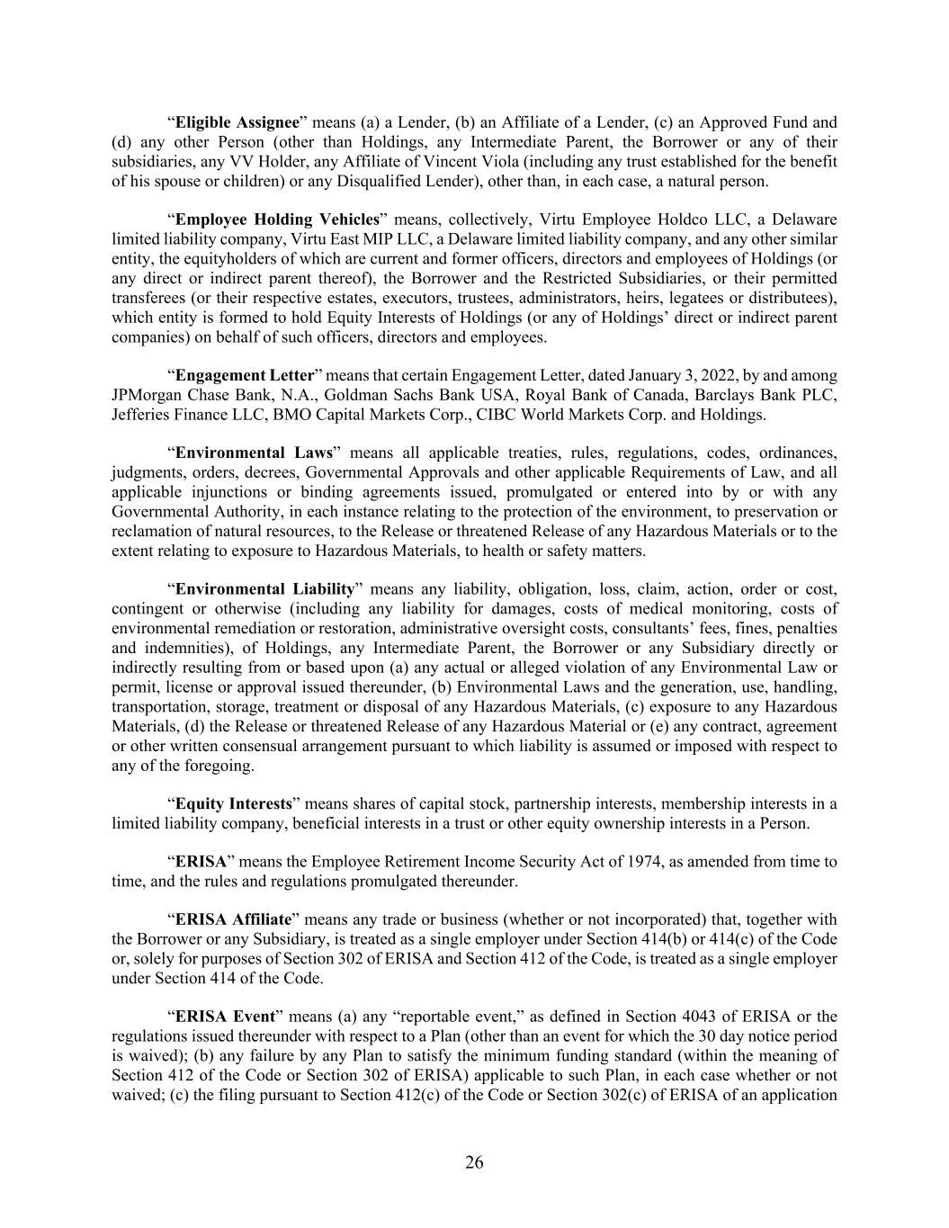 26 “Eligible Assignee” means (a) a Lender, (b) an Affiliate of a Lender, (c) an Approved Fund and (d) any other Person (other than Holdings, any Intermediate Parent, the Borrower or any of their subsidiaries, any VV Holder, any Affiliate of Vincent Viola (including any trust established for the benefit of his spouse or children) or any Disqualified Lender), other than, in each case, a natural person. “Employee Holding Vehicles” means, collectively, Virtu Employee Holdco LLC, a Delaware limited liability company, Virtu East MIP LLC, a Delaware limited liability company, and any other similar entity, the equityholders of which are current and former officers, directors and employees of Holdings (or any direct or indirect parent thereof), the Borrower and the Restricted Subsidiaries, or their permitted transferees (or their respective estates, executors, trustees, administrators, heirs, legatees or distributees), which entity is formed to hold Equity Interests of Holdings (or any of Holdings’ direct or indirect parent companies) on behalf of such officers, directors and employees. “Engagement Letter” means that certain Engagement Letter, dated January 3, 2022, by and among JPMorgan Chase Bank, N.A., Goldman Sachs Bank USA, Royal Bank of Canada, Barclays Bank PLC, Jefferies Finance LLC, BMO Capital Markets Corp., CIBC World Markets Corp. and Holdings. “Environmental Laws” means all applicable treaties, rules, regulations, codes, ordinances, judgments, orders, decrees, Governmental Approvals and other applicable Requirements of Law, and all applicable injunctions or binding agreements issued, promulgated or entered into by or with any Governmental Authority, in each instance relating to the protection of the environment, to preservation or reclamation of natural resources, to the Release or threatened Release of any Hazardous Materials or to the extent relating to exposure to Hazardous Materials, to health or safety matters. “Environmental Liability” means any liability, obligation, loss, claim, action, order or cost, contingent or otherwise (including any liability for damages, costs of medical monitoring, costs of environmental remediation or restoration, administrative oversight costs, consultants’ fees, fines, penalties and indemnities), of Holdings, any Intermediate Parent, the Borrower or any Subsidiary directly or indirectly resulting from or based upon (a) any actual or alleged violation of any Environmental Law or permit, license or approval issued thereunder, (b) Environmental Laws and the generation, use, handling, transportation, storage, treatment or disposal of any Hazardous Materials, (c) exposure to any Hazardous Materials, (d) the Release or threatened Release of any Hazardous Material or (e) any contract, agreement or other written consensual arrangement pursuant to which liability is assumed or imposed with respect to any of the foregoing. “Equity Interests” means shares of capital stock, partnership interests, membership interests in a limited liability company, beneficial interests in a trust or other equity ownership interests in a Person. “ERISA” means the Employee Retirement Income Security Act of 1974, as amended from time to time, and the rules and regulations promulgated thereunder. “ERISA Affiliate” means any trade or business (whether or not incorporated) that, together with the Borrower or any Subsidiary, is treated as a single employer under Section 414(b) or 414(c) of the Code or, solely for purposes of Section 302 of ERISA and Section 412 of the Code, is treated as a single employer under Section 414 of the Code. “ERISA Event” means (a) any “reportable event,” as defined in Section 4043 of ERISA or the regulations issued thereunder with respect to a Plan (other than an event for which the 30 day notice period is waived); (b) any failure by any Plan to satisfy the minimum funding standard (within the meaning of Section 412 of the Code or Section 302 of ERISA) applicable to such Plan, in each case whether or not waived; (c) the filing pursuant to Section 412(c) of the Code or Section 302(c) of ERISA of an application