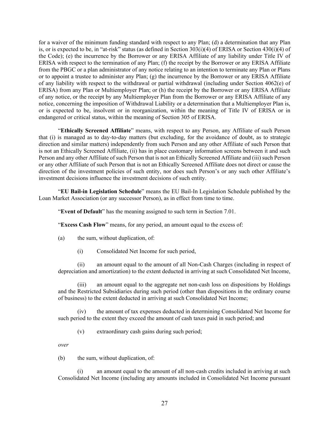27 for a waiver of the minimum funding standard with respect to any Plan; (d) a determination that any Plan is, or is expected to be, in “at-risk” status (as defined in Section 303(i)(4) of ERISA or Section 430(i)(4) of the Code); (e) the incurrence by the Borrower or any ERISA Affiliate of any liability under Title IV of ERISA with respect to the termination of any Plan; (f) the receipt by the Borrower or any ERISA Affiliate from the PBGC or a plan administrator of any notice relating to an intention to terminate any Plan or Plans or to appoint a trustee to administer any Plan; (g) the incurrence by the Borrower or any ERISA Affiliate of any liability with respect to the withdrawal or partial withdrawal (including under Section 4062(e) of ERISA) from any Plan or Multiemployer Plan; or (h) the receipt by the Borrower or any ERISA Affiliate of any notice, or the receipt by any Multiemployer Plan from the Borrower or any ERISA Affiliate of any notice, concerning the imposition of Withdrawal Liability or a determination that a Multiemployer Plan is, or is expected to be, insolvent or in reorganization, within the meaning of Title IV of ERISA or in endangered or critical status, within the meaning of Section 305 of ERISA. “Ethically Screened Affiliate” means, with respect to any Person, any Affiliate of such Person that (i) is managed as to day-to-day matters (but excluding, for the avoidance of doubt, as to strategic direction and similar matters) independently from such Person and any other Affiliate of such Person that is not an Ethically Screened Affiliate, (ii) has in place customary information screens between it and such Person and any other Affiliate of such Person that is not an Ethically Screened Affiliate and (iii) such Person or any other Affiliate of such Person that is not an Ethically Screened Affiliate does not direct or cause the direction of the investment policies of such entity, nor does such Person’s or any such other Affiliate’s investment decisions influence the investment decisions of such entity. “EU Bail-in Legislation Schedule” means the EU Bail-In Legislation Schedule published by the Loan Market Association (or any successor Person), as in effect from time to time. “Event of Default” has the meaning assigned to such term in Section 7.01. “Excess Cash Flow” means, for any period, an amount equal to the excess of: (a) the sum, without duplication, of: (i) Consolidated Net Income for such period, (ii) an amount equal to the amount of all Non-Cash Charges (including in respect of depreciation and amortization) to the extent deducted in arriving at such Consolidated Net Income, (iii) an amount equal to the aggregate net non-cash loss on dispositions by Holdings and the Restricted Subsidiaries during such period (other than dispositions in the ordinary course of business) to the extent deducted in arriving at such Consolidated Net Income; (iv) the amount of tax expenses deducted in determining Consolidated Net Income for such period to the extent they exceed the amount of cash taxes paid in such period; and (v) extraordinary cash gains during such period; over (b) the sum, without duplication, of: (i) an amount equal to the amount of all non-cash credits included in arriving at such Consolidated Net Income (including any amounts included in Consolidated Net Income pursuant