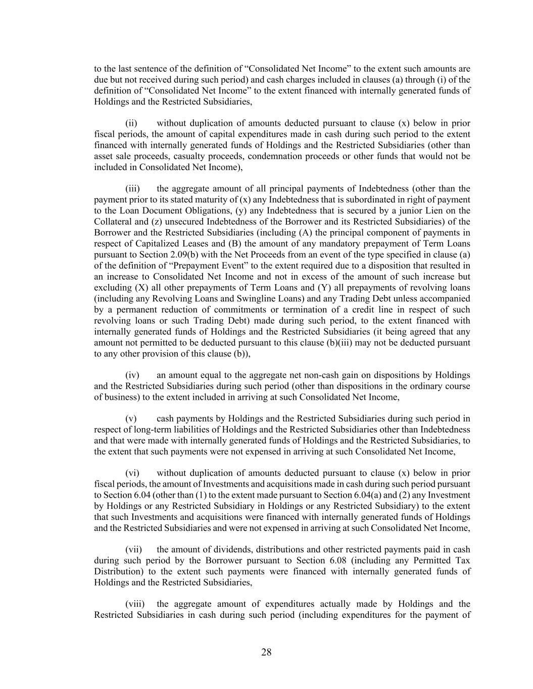 28 to the last sentence of the definition of “Consolidated Net Income” to the extent such amounts are due but not received during such period) and cash charges included in clauses (a) through (i) of the definition of “Consolidated Net Income” to the extent financed with internally generated funds of Holdings and the Restricted Subsidiaries, (ii) without duplication of amounts deducted pursuant to clause (x) below in prior fiscal periods, the amount of capital expenditures made in cash during such period to the extent financed with internally generated funds of Holdings and the Restricted Subsidiaries (other than asset sale proceeds, casualty proceeds, condemnation proceeds or other funds that would not be included in Consolidated Net Income), (iii) the aggregate amount of all principal payments of Indebtedness (other than the payment prior to its stated maturity of (x) any Indebtedness that is subordinated in right of payment to the Loan Document Obligations, (y) any Indebtedness that is secured by a junior Lien on the Collateral and (z) unsecured Indebtedness of the Borrower and its Restricted Subsidiaries) of the Borrower and the Restricted Subsidiaries (including (A) the principal component of payments in respect of Capitalized Leases and (B) the amount of any mandatory prepayment of Term Loans pursuant to Section 2.09(b) with the Net Proceeds from an event of the type specified in clause (a) of the definition of “Prepayment Event” to the extent required due to a disposition that resulted in an increase to Consolidated Net Income and not in excess of the amount of such increase but excluding (X) all other prepayments of Term Loans and (Y) all prepayments of revolving loans (including any Revolving Loans and Swingline Loans) and any Trading Debt unless accompanied by a permanent reduction of commitments or termination of a credit line in respect of such revolving loans or such Trading Debt) made during such period, to the extent financed with internally generated funds of Holdings and the Restricted Subsidiaries (it being agreed that any amount not permitted to be deducted pursuant to this clause (b)(iii) may not be deducted pursuant to any other provision of this clause (b)), (iv) an amount equal to the aggregate net non-cash gain on dispositions by Holdings and the Restricted Subsidiaries during such period (other than dispositions in the ordinary course of business) to the extent included in arriving at such Consolidated Net Income, (v) cash payments by Holdings and the Restricted Subsidiaries during such period in respect of long-term liabilities of Holdings and the Restricted Subsidiaries other than Indebtedness and that were made with internally generated funds of Holdings and the Restricted Subsidiaries, to the extent that such payments were not expensed in arriving at such Consolidated Net Income, (vi) without duplication of amounts deducted pursuant to clause (x) below in prior fiscal periods, the amount of Investments and acquisitions made in cash during such period pursuant to Section 6.04 (other than (1) to the extent made pursuant to Section 6.04(a) and (2) any Investment by Holdings or any Restricted Subsidiary in Holdings or any Restricted Subsidiary) to the extent that such Investments and acquisitions were financed with internally generated funds of Holdings and the Restricted Subsidiaries and were not expensed in arriving at such Consolidated Net Income, (vii) the amount of dividends, distributions and other restricted payments paid in cash during such period by the Borrower pursuant to Section 6.08 (including any Permitted Tax Distribution) to the extent such payments were financed with internally generated funds of Holdings and the Restricted Subsidiaries, (viii) the aggregate amount of expenditures actually made by Holdings and the Restricted Subsidiaries in cash during such period (including expenditures for the payment of
