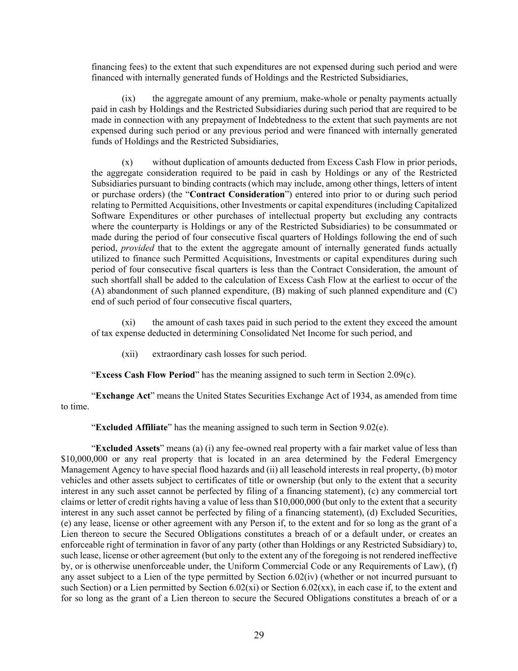29 financing fees) to the extent that such expenditures are not expensed during such period and were financed with internally generated funds of Holdings and the Restricted Subsidiaries, (ix) the aggregate amount of any premium, make-whole or penalty payments actually paid in cash by Holdings and the Restricted Subsidiaries during such period that are required to be made in connection with any prepayment of Indebtedness to the extent that such payments are not expensed during such period or any previous period and were financed with internally generated funds of Holdings and the Restricted Subsidiaries, (x) without duplication of amounts deducted from Excess Cash Flow in prior periods, the aggregate consideration required to be paid in cash by Holdings or any of the Restricted Subsidiaries pursuant to binding contracts (which may include, among other things, letters of intent or purchase orders) (the “Contract Consideration”) entered into prior to or during such period relating to Permitted Acquisitions, other Investments or capital expenditures (including Capitalized Software Expenditures or other purchases of intellectual property but excluding any contracts where the counterparty is Holdings or any of the Restricted Subsidiaries) to be consummated or made during the period of four consecutive fiscal quarters of Holdings following the end of such period, provided that to the extent the aggregate amount of internally generated funds actually utilized to finance such Permitted Acquisitions, Investments or capital expenditures during such period of four consecutive fiscal quarters is less than the Contract Consideration, the amount of such shortfall shall be added to the calculation of Excess Cash Flow at the earliest to occur of the (A) abandonment of such planned expenditure, (B) making of such planned expenditure and (C) end of such period of four consecutive fiscal quarters, (xi) the amount of cash taxes paid in such period to the extent they exceed the amount of tax expense deducted in determining Consolidated Net Income for such period, and (xii) extraordinary cash losses for such period. “Excess Cash Flow Period” has the meaning assigned to such term in Section 2.09(c). “Exchange Act” means the United States Securities Exchange Act of 1934, as amended from time to time. “Excluded Affiliate” has the meaning assigned to such term in Section 9.02(e). “Excluded Assets” means (a) (i) any fee-owned real property with a fair market value of less than $10,000,000 or any real property that is located in an area determined by the Federal Emergency Management Agency to have special flood hazards and (ii) all leasehold interests in real property, (b) motor vehicles and other assets subject to certificates of title or ownership (but only to the extent that a security interest in any such asset cannot be perfected by filing of a financing statement), (c) any commercial tort claims or letter of credit rights having a value of less than $10,000,000 (but only to the extent that a security interest in any such asset cannot be perfected by filing of a financing statement), (d) Excluded Securities, (e) any lease, license or other agreement with any Person if, to the extent and for so long as the grant of a Lien thereon to secure the Secured Obligations constitutes a breach of or a default under, or creates an enforceable right of termination in favor of any party (other than Holdings or any Restricted Subsidiary) to, such lease, license or other agreement (but only to the extent any of the foregoing is not rendered ineffective by, or is otherwise unenforceable under, the Uniform Commercial Code or any Requirements of Law), (f) any asset subject to a Lien of the type permitted by Section 6.02(iv) (whether or not incurred pursuant to such Section) or a Lien permitted by Section 6.02(xi) or Section 6.02(xx), in each case if, to the extent and for so long as the grant of a Lien thereon to secure the Secured Obligations constitutes a breach of or a