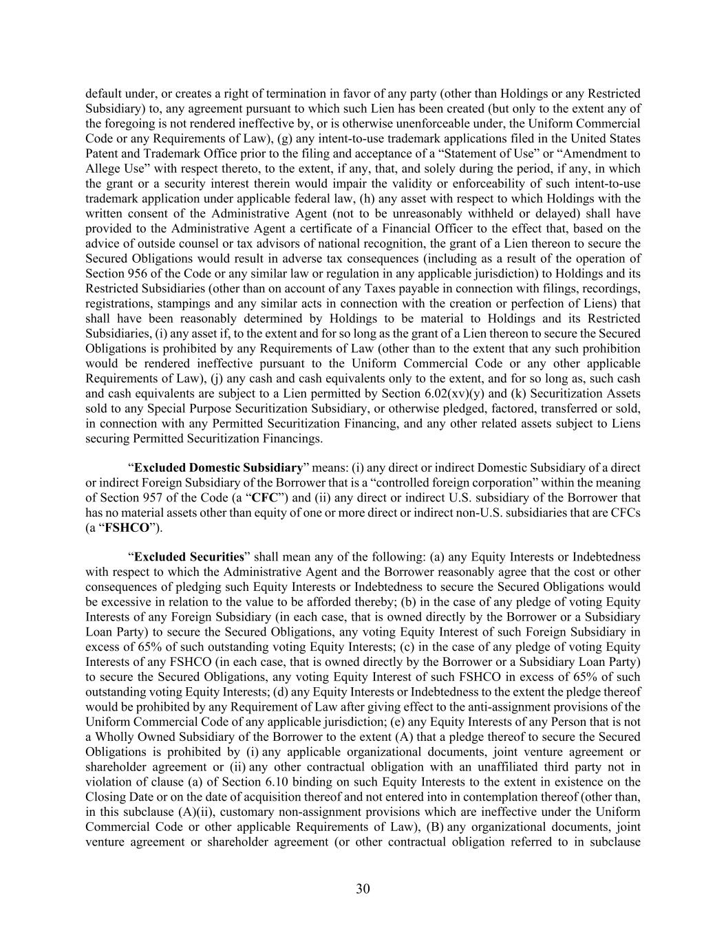 30 default under, or creates a right of termination in favor of any party (other than Holdings or any Restricted Subsidiary) to, any agreement pursuant to which such Lien has been created (but only to the extent any of the foregoing is not rendered ineffective by, or is otherwise unenforceable under, the Uniform Commercial Code or any Requirements of Law), (g) any intent-to-use trademark applications filed in the United States Patent and Trademark Office prior to the filing and acceptance of a “Statement of Use” or “Amendment to Allege Use” with respect thereto, to the extent, if any, that, and solely during the period, if any, in which the grant or a security interest therein would impair the validity or enforceability of such intent-to-use trademark application under applicable federal law, (h) any asset with respect to which Holdings with the written consent of the Administrative Agent (not to be unreasonably withheld or delayed) shall have provided to the Administrative Agent a certificate of a Financial Officer to the effect that, based on the advice of outside counsel or tax advisors of national recognition, the grant of a Lien thereon to secure the Secured Obligations would result in adverse tax consequences (including as a result of the operation of Section 956 of the Code or any similar law or regulation in any applicable jurisdiction) to Holdings and its Restricted Subsidiaries (other than on account of any Taxes payable in connection with filings, recordings, registrations, stampings and any similar acts in connection with the creation or perfection of Liens) that shall have been reasonably determined by Holdings to be material to Holdings and its Restricted Subsidiaries, (i) any asset if, to the extent and for so long as the grant of a Lien thereon to secure the Secured Obligations is prohibited by any Requirements of Law (other than to the extent that any such prohibition would be rendered ineffective pursuant to the Uniform Commercial Code or any other applicable Requirements of Law), (j) any cash and cash equivalents only to the extent, and for so long as, such cash and cash equivalents are subject to a Lien permitted by Section 6.02(xv)(y) and (k) Securitization Assets sold to any Special Purpose Securitization Subsidiary, or otherwise pledged, factored, transferred or sold, in connection with any Permitted Securitization Financing, and any other related assets subject to Liens securing Permitted Securitization Financings. “Excluded Domestic Subsidiary” means: (i) any direct or indirect Domestic Subsidiary of a direct or indirect Foreign Subsidiary of the Borrower that is a “controlled foreign corporation” within the meaning of Section 957 of the Code (a “CFC”) and (ii) any direct or indirect U.S. subsidiary of the Borrower that has no material assets other than equity of one or more direct or indirect non-U.S. subsidiaries that are CFCs (a “FSHCO”). “Excluded Securities” shall mean any of the following: (a) any Equity Interests or Indebtedness with respect to which the Administrative Agent and the Borrower reasonably agree that the cost or other consequences of pledging such Equity Interests or Indebtedness to secure the Secured Obligations would be excessive in relation to the value to be afforded thereby; (b) in the case of any pledge of voting Equity Interests of any Foreign Subsidiary (in each case, that is owned directly by the Borrower or a Subsidiary Loan Party) to secure the Secured Obligations, any voting Equity Interest of such Foreign Subsidiary in excess of 65% of such outstanding voting Equity Interests; (c) in the case of any pledge of voting Equity Interests of any FSHCO (in each case, that is owned directly by the Borrower or a Subsidiary Loan Party) to secure the Secured Obligations, any voting Equity Interest of such FSHCO in excess of 65% of such outstanding voting Equity Interests; (d) any Equity Interests or Indebtedness to the extent the pledge thereof would be prohibited by any Requirement of Law after giving effect to the anti-assignment provisions of the Uniform Commercial Code of any applicable jurisdiction; (e) any Equity Interests of any Person that is not a Wholly Owned Subsidiary of the Borrower to the extent (A) that a pledge thereof to secure the Secured Obligations is prohibited by (i) any applicable organizational documents, joint venture agreement or shareholder agreement or (ii) any other contractual obligation with an unaffiliated third party not in violation of clause (a) of Section 6.10 binding on such Equity Interests to the extent in existence on the Closing Date or on the date of acquisition thereof and not entered into in contemplation thereof (other than, in this subclause (A)(ii), customary non-assignment provisions which are ineffective under the Uniform Commercial Code or other applicable Requirements of Law), (B) any organizational documents, joint venture agreement or shareholder agreement (or other contractual obligation referred to in subclause