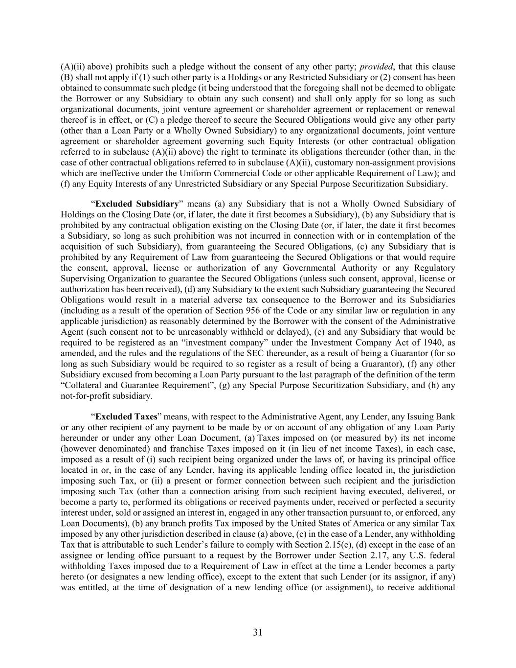 31 (A)(ii) above) prohibits such a pledge without the consent of any other party; provided, that this clause (B) shall not apply if (1) such other party is a Holdings or any Restricted Subsidiary or (2) consent has been obtained to consummate such pledge (it being understood that the foregoing shall not be deemed to obligate the Borrower or any Subsidiary to obtain any such consent) and shall only apply for so long as such organizational documents, joint venture agreement or shareholder agreement or replacement or renewal thereof is in effect, or (C) a pledge thereof to secure the Secured Obligations would give any other party (other than a Loan Party or a Wholly Owned Subsidiary) to any organizational documents, joint venture agreement or shareholder agreement governing such Equity Interests (or other contractual obligation referred to in subclause (A)(ii) above) the right to terminate its obligations thereunder (other than, in the case of other contractual obligations referred to in subclause (A)(ii), customary non-assignment provisions which are ineffective under the Uniform Commercial Code or other applicable Requirement of Law); and (f) any Equity Interests of any Unrestricted Subsidiary or any Special Purpose Securitization Subsidiary. “Excluded Subsidiary” means (a) any Subsidiary that is not a Wholly Owned Subsidiary of Holdings on the Closing Date (or, if later, the date it first becomes a Subsidiary), (b) any Subsidiary that is prohibited by any contractual obligation existing on the Closing Date (or, if later, the date it first becomes a Subsidiary, so long as such prohibition was not incurred in connection with or in contemplation of the acquisition of such Subsidiary), from guaranteeing the Secured Obligations, (c) any Subsidiary that is prohibited by any Requirement of Law from guaranteeing the Secured Obligations or that would require the consent, approval, license or authorization of any Governmental Authority or any Regulatory Supervising Organization to guarantee the Secured Obligations (unless such consent, approval, license or authorization has been received), (d) any Subsidiary to the extent such Subsidiary guaranteeing the Secured Obligations would result in a material adverse tax consequence to the Borrower and its Subsidiaries (including as a result of the operation of Section 956 of the Code or any similar law or regulation in any applicable jurisdiction) as reasonably determined by the Borrower with the consent of the Administrative Agent (such consent not to be unreasonably withheld or delayed), (e) and any Subsidiary that would be required to be registered as an “investment company” under the Investment Company Act of 1940, as amended, and the rules and the regulations of the SEC thereunder, as a result of being a Guarantor (for so long as such Subsidiary would be required to so register as a result of being a Guarantor), (f) any other Subsidiary excused from becoming a Loan Party pursuant to the last paragraph of the definition of the term “Collateral and Guarantee Requirement”, (g) any Special Purpose Securitization Subsidiary, and (h) any not-for-profit subsidiary. “Excluded Taxes” means, with respect to the Administrative Agent, any Lender, any Issuing Bank or any other recipient of any payment to be made by or on account of any obligation of any Loan Party hereunder or under any other Loan Document, (a) Taxes imposed on (or measured by) its net income (however denominated) and franchise Taxes imposed on it (in lieu of net income Taxes), in each case, imposed as a result of (i) such recipient being organized under the laws of, or having its principal office located in or, in the case of any Lender, having its applicable lending office located in, the jurisdiction imposing such Tax, or (ii) a present or former connection between such recipient and the jurisdiction imposing such Tax (other than a connection arising from such recipient having executed, delivered, or become a party to, performed its obligations or received payments under, received or perfected a security interest under, sold or assigned an interest in, engaged in any other transaction pursuant to, or enforced, any Loan Documents), (b) any branch profits Tax imposed by the United States of America or any similar Tax imposed by any other jurisdiction described in clause (a) above, (c) in the case of a Lender, any withholding Tax that is attributable to such Lender’s failure to comply with Section 2.15(e), (d) except in the case of an assignee or lending office pursuant to a request by the Borrower under Section 2.17, any U.S. federal withholding Taxes imposed due to a Requirement of Law in effect at the time a Lender becomes a party hereto (or designates a new lending office), except to the extent that such Lender (or its assignor, if any) was entitled, at the time of designation of a new lending office (or assignment), to receive additional