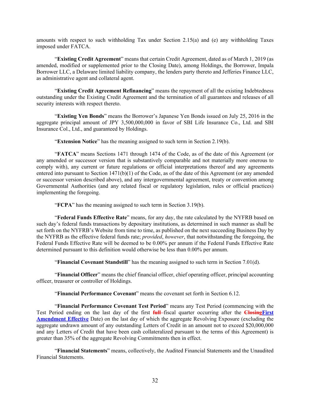 32 amounts with respect to such withholding Tax under Section 2.15(a) and (e) any withholding Taxes imposed under FATCA. “Existing Credit Agreement” means that certain Credit Agreement, dated as of March 1, 2019 (as amended, modified or supplemented prior to the Closing Date), among Holdings, the Borrower, Impala Borrower LLC, a Delaware limited liability company, the lenders party thereto and Jefferies Finance LLC, as administrative agent and collateral agent. “Existing Credit Agreement Refinancing” means the repayment of all the existing Indebtedness outstanding under the Existing Credit Agreement and the termination of all guarantees and releases of all security interests with respect thereto. “Existing Yen Bonds” means the Borrower’s Japanese Yen Bonds issued on July 25, 2016 in the aggregate principal amount of JPY 3,500,000,000 in favor of SBI Life Insurance Co., Ltd. and SBI Insurance Col., Ltd., and guaranteed by Holdings. “Extension Notice” has the meaning assigned to such term in Section 2.19(b). “FATCA” means Sections 1471 through 1474 of the Code, as of the date of this Agreement (or any amended or successor version that is substantively comparable and not materially more onerous to comply with), any current or future regulations or official interpretations thereof and any agreements entered into pursuant to Section 1471(b)(1) of the Code, as of the date of this Agreement (or any amended or successor version described above), and any intergovernmental agreement, treaty or convention among Governmental Authorities (and any related fiscal or regulatory legislation, rules or official practices) implementing the foregoing. “FCPA” has the meaning assigned to such term in Section 3.19(b). “Federal Funds Effective Rate” means, for any day, the rate calculated by the NYFRB based on such day’s federal funds transactions by depositary institutions, as determined in such manner as shall be set forth on the NYFRB’s Website from time to time, as published on the next succeeding Business Day by the NYFRB as the effective federal funds rate; provided, however, that notwithstanding the foregoing, the Federal Funds Effective Rate will be deemed to be 0.00% per annum if the Federal Funds Effective Rate determined pursuant to this definition would otherwise be less than 0.00% per annum. “Financial Covenant Standstill” has the meaning assigned to such term in Section 7.01(d). “Financial Officer” means the chief financial officer, chief operating officer, principal accounting officer, treasurer or controller of Holdings. “Financial Performance Covenant” means the covenant set forth in Section 6.12. “Financial Performance Covenant Test Period” means any Test Period (commencing with the Test Period ending on the last day of the first full fiscal quarter occurring after the ClosingFirst Amendment Effective Date) on the last day of which the aggregate Revolving Exposure (excluding the aggregate undrawn amount of any outstanding Letters of Credit in an amount not to exceed $20,000,000 and any Letters of Credit that have been cash collateralized pursuant to the terms of this Agreement) is greater than 35% of the aggregate Revolving Commitments then in effect. “Financial Statements” means, collectively, the Audited Financial Statements and the Unaudited Financial Statements.