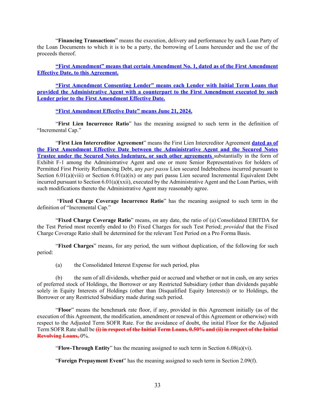 33 “Financing Transactions” means the execution, delivery and performance by each Loan Party of the Loan Documents to which it is to be a party, the borrowing of Loans hereunder and the use of the proceeds thereof. “First Amendment” means that certain Amendment No. 1, dated as of the First Amendment Effective Date, to this Agreement. “First Amendment Consenting Lender” means each Lender with Initial Term Loans that provided the Administrative Agent with a counterpart to the First Amendment executed by such Lender prior to the First Amendment Effective Date. “First Amendment Effective Date” means June 21, 2024. “First Lien Incurrence Ratio” has the meaning assigned to such term in the definition of “Incremental Cap.” “First Lien Intercreditor Agreement” means the First Lien Intercreditor Agreement dated as of the First Amendment Effective Date between the Administrative Agent and the Secured Notes Trustee under the Secured Notes Indenture, or such other agreements substantially in the form of Exhibit F-1 among the Administrative Agent and one or more Senior Representatives for holders of Permitted First Priority Refinancing Debt, any pari passu Lien secured Indebtedness incurred pursuant to Section 6.01(a)(viii) or Section 6.01(a)(ix) or any pari passu Lien secured Incremental Equivalent Debt incurred pursuant to Section 6.01(a)(xxii), executed by the Administrative Agent and the Loan Parties, with such modifications thereto the Administrative Agent may reasonably agree. “Fixed Charge Coverage Incurrence Ratio” has the meaning assigned to such term in the definition of “Incremental Cap.” “Fixed Charge Coverage Ratio” means, on any date, the ratio of (a) Consolidated EBITDA for the Test Period most recently ended to (b) Fixed Charges for such Test Period; provided that the Fixed Charge Coverage Ratio shall be determined for the relevant Test Period on a Pro Forma Basis. “Fixed Charges” means, for any period, the sum without duplication, of the following for such period: (a) the Consolidated Interest Expense for such period, plus (b) the sum of all dividends, whether paid or accrued and whether or not in cash, on any series of preferred stock of Holdings, the Borrower or any Restricted Subsidiary (other than dividends payable solely in Equity Interests of Holdings (other than Disqualified Equity Interests)) or to Holdings, the Borrower or any Restricted Subsidiary made during such period. “Floor” means the benchmark rate floor, if any, provided in this Agreement initially (as of the execution of this Agreement, the modification, amendment or renewal of this Agreement or otherwise) with respect to the Adjusted Term SOFR Rate. For the avoidance of doubt, the initial Floor for the Adjusted Term SOFR Rate shall be (i) in respect of the Initial Term Loans, 0.50% and (ii) in respect of the Initial Revolving Loans, 0%. “Flow-Through Entity” has the meaning assigned to such term in Section 6.08(a)(vi). “Foreign Prepayment Event” has the meaning assigned to such term in Section 2.09(f).