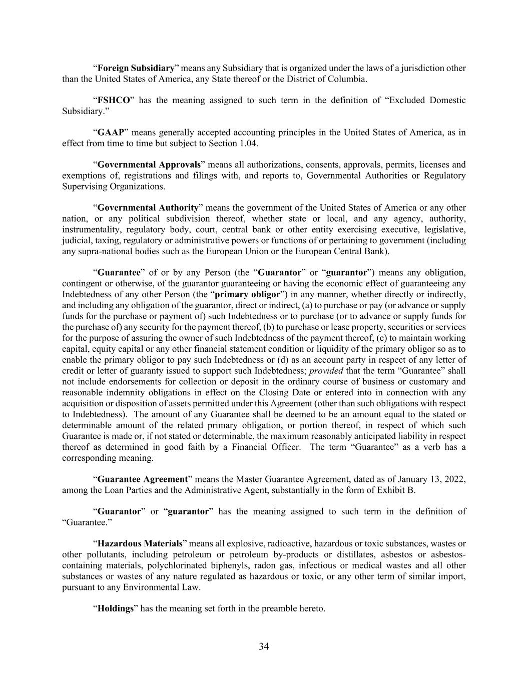 34 “Foreign Subsidiary” means any Subsidiary that is organized under the laws of a jurisdiction other than the United States of America, any State thereof or the District of Columbia. “FSHCO” has the meaning assigned to such term in the definition of “Excluded Domestic Subsidiary.” “GAAP” means generally accepted accounting principles in the United States of America, as in effect from time to time but subject to Section 1.04. “Governmental Approvals” means all authorizations, consents, approvals, permits, licenses and exemptions of, registrations and filings with, and reports to, Governmental Authorities or Regulatory Supervising Organizations. “Governmental Authority” means the government of the United States of America or any other nation, or any political subdivision thereof, whether state or local, and any agency, authority, instrumentality, regulatory body, court, central bank or other entity exercising executive, legislative, judicial, taxing, regulatory or administrative powers or functions of or pertaining to government (including any supra-national bodies such as the European Union or the European Central Bank). “Guarantee” of or by any Person (the “Guarantor” or “guarantor”) means any obligation, contingent or otherwise, of the guarantor guaranteeing or having the economic effect of guaranteeing any Indebtedness of any other Person (the “primary obligor”) in any manner, whether directly or indirectly, and including any obligation of the guarantor, direct or indirect, (a) to purchase or pay (or advance or supply funds for the purchase or payment of) such Indebtedness or to purchase (or to advance or supply funds for the purchase of) any security for the payment thereof, (b) to purchase or lease property, securities or services for the purpose of assuring the owner of such Indebtedness of the payment thereof, (c) to maintain working capital, equity capital or any other financial statement condition or liquidity of the primary obligor so as to enable the primary obligor to pay such Indebtedness or (d) as an account party in respect of any letter of credit or letter of guaranty issued to support such Indebtedness; provided that the term “Guarantee” shall not include endorsements for collection or deposit in the ordinary course of business or customary and reasonable indemnity obligations in effect on the Closing Date or entered into in connection with any acquisition or disposition of assets permitted under this Agreement (other than such obligations with respect to Indebtedness). The amount of any Guarantee shall be deemed to be an amount equal to the stated or determinable amount of the related primary obligation, or portion thereof, in respect of which such Guarantee is made or, if not stated or determinable, the maximum reasonably anticipated liability in respect thereof as determined in good faith by a Financial Officer. The term “Guarantee” as a verb has a corresponding meaning. “Guarantee Agreement” means the Master Guarantee Agreement, dated as of January 13, 2022, among the Loan Parties and the Administrative Agent, substantially in the form of Exhibit B. “Guarantor” or “guarantor” has the meaning assigned to such term in the definition of “Guarantee.” “Hazardous Materials” means all explosive, radioactive, hazardous or toxic substances, wastes or other pollutants, including petroleum or petroleum by-products or distillates, asbestos or asbestos- containing materials, polychlorinated biphenyls, radon gas, infectious or medical wastes and all other substances or wastes of any nature regulated as hazardous or toxic, or any other term of similar import, pursuant to any Environmental Law. “Holdings” has the meaning set forth in the preamble hereto.