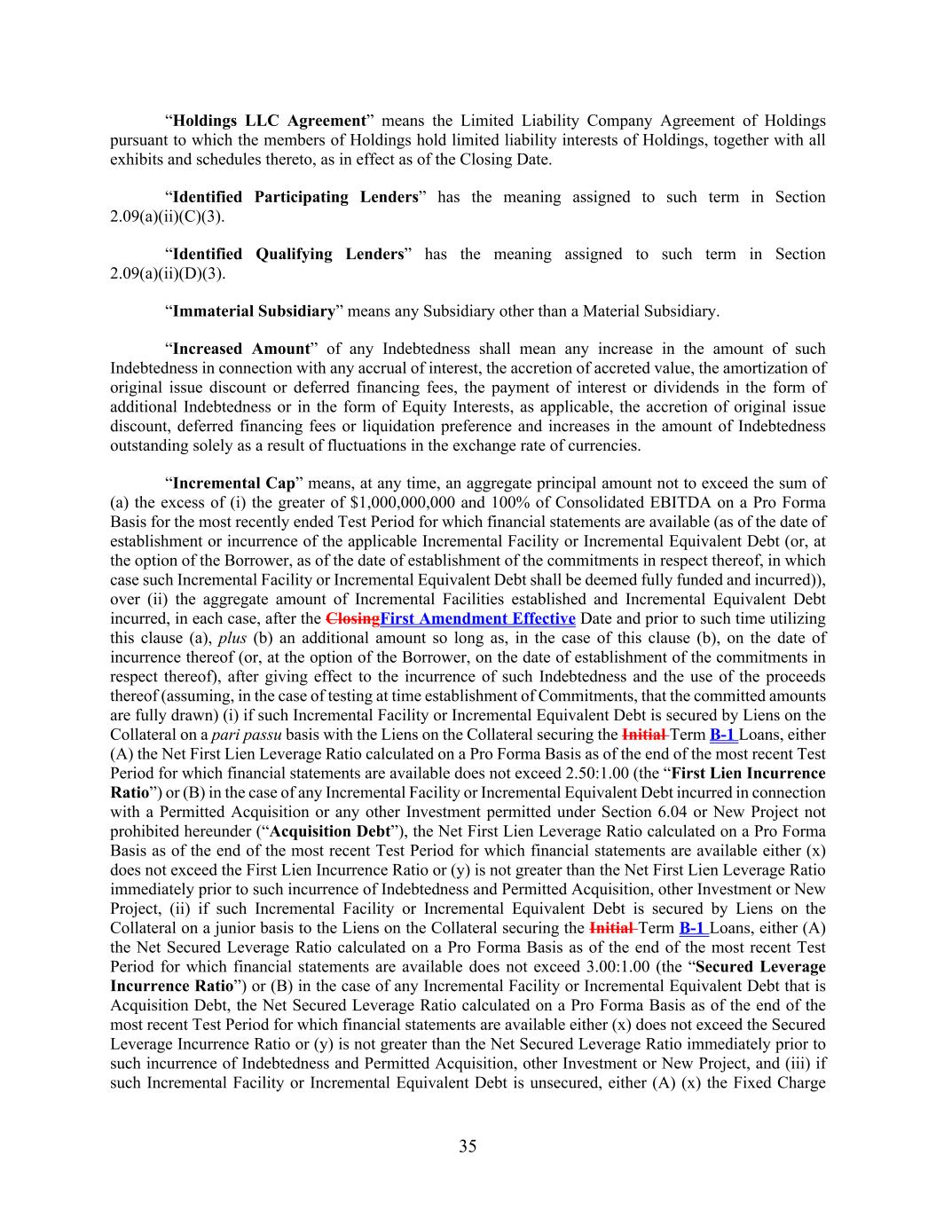35 “Holdings LLC Agreement” means the Limited Liability Company Agreement of Holdings pursuant to which the members of Holdings hold limited liability interests of Holdings, together with all exhibits and schedules thereto, as in effect as of the Closing Date. “Identified Participating Lenders” has the meaning assigned to such term in Section 2.09(a)(ii)(C)(3). “Identified Qualifying Lenders” has the meaning assigned to such term in Section 2.09(a)(ii)(D)(3). “Immaterial Subsidiary” means any Subsidiary other than a Material Subsidiary. “Increased Amount” of any Indebtedness shall mean any increase in the amount of such Indebtedness in connection with any accrual of interest, the accretion of accreted value, the amortization of original issue discount or deferred financing fees, the payment of interest or dividends in the form of additional Indebtedness or in the form of Equity Interests, as applicable, the accretion of original issue discount, deferred financing fees or liquidation preference and increases in the amount of Indebtedness outstanding solely as a result of fluctuations in the exchange rate of currencies. “Incremental Cap” means, at any time, an aggregate principal amount not to exceed the sum of (a) the excess of (i) the greater of $1,000,000,000 and 100% of Consolidated EBITDA on a Pro Forma Basis for the most recently ended Test Period for which financial statements are available (as of the date of establishment or incurrence of the applicable Incremental Facility or Incremental Equivalent Debt (or, at the option of the Borrower, as of the date of establishment of the commitments in respect thereof, in which case such Incremental Facility or Incremental Equivalent Debt shall be deemed fully funded and incurred)), over (ii) the aggregate amount of Incremental Facilities established and Incremental Equivalent Debt incurred, in each case, after the ClosingFirst Amendment Effective Date and prior to such time utilizing this clause (a), plus (b) an additional amount so long as, in the case of this clause (b), on the date of incurrence thereof (or, at the option of the Borrower, on the date of establishment of the commitments in respect thereof), after giving effect to the incurrence of such Indebtedness and the use of the proceeds thereof (assuming, in the case of testing at time establishment of Commitments, that the committed amounts are fully drawn) (i) if such Incremental Facility or Incremental Equivalent Debt is secured by Liens on the Collateral on a pari passu basis with the Liens on the Collateral securing the Initial Term B-1 Loans, either (A) the Net First Lien Leverage Ratio calculated on a Pro Forma Basis as of the end of the most recent Test Period for which financial statements are available does not exceed 2.50:1.00 (the “First Lien Incurrence Ratio”) or (B) in the case of any Incremental Facility or Incremental Equivalent Debt incurred in connection with a Permitted Acquisition or any other Investment permitted under Section 6.04 or New Project not prohibited hereunder (“Acquisition Debt”), the Net First Lien Leverage Ratio calculated on a Pro Forma Basis as of the end of the most recent Test Period for which financial statements are available either (x) does not exceed the First Lien Incurrence Ratio or (y) is not greater than the Net First Lien Leverage Ratio immediately prior to such incurrence of Indebtedness and Permitted Acquisition, other Investment or New Project, (ii) if such Incremental Facility or Incremental Equivalent Debt is secured by Liens on the Collateral on a junior basis to the Liens on the Collateral securing the Initial Term B-1 Loans, either (A) the Net Secured Leverage Ratio calculated on a Pro Forma Basis as of the end of the most recent Test Period for which financial statements are available does not exceed 3.00:1.00 (the “Secured Leverage Incurrence Ratio”) or (B) in the case of any Incremental Facility or Incremental Equivalent Debt that is Acquisition Debt, the Net Secured Leverage Ratio calculated on a Pro Forma Basis as of the end of the most recent Test Period for which financial statements are available either (x) does not exceed the Secured Leverage Incurrence Ratio or (y) is not greater than the Net Secured Leverage Ratio immediately prior to such incurrence of Indebtedness and Permitted Acquisition, other Investment or New Project, and (iii) if such Incremental Facility or Incremental Equivalent Debt is unsecured, either (A) (x) the Fixed Charge