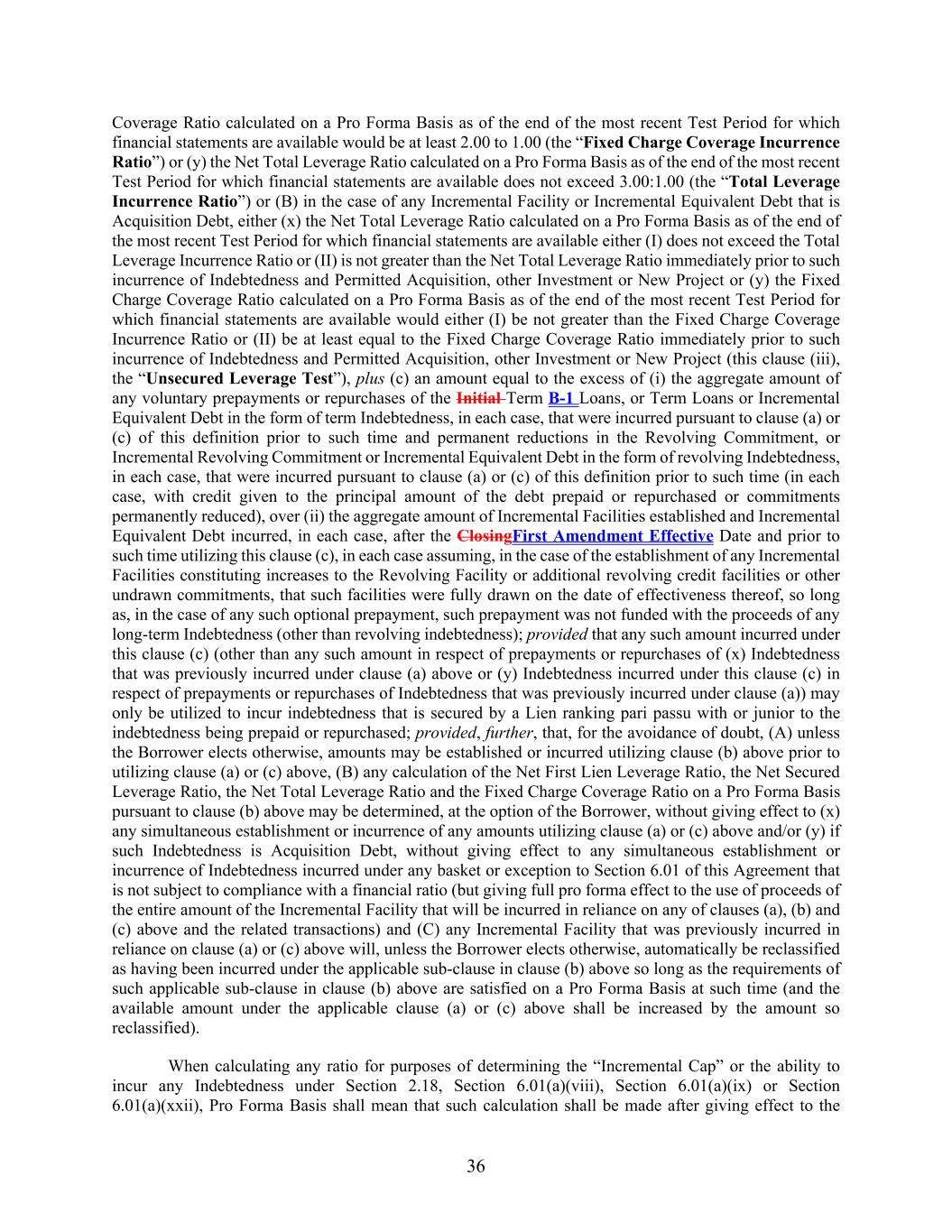 36 Coverage Ratio calculated on a Pro Forma Basis as of the end of the most recent Test Period for which financial statements are available would be at least 2.00 to 1.00 (the “Fixed Charge Coverage Incurrence Ratio”) or (y) the Net Total Leverage Ratio calculated on a Pro Forma Basis as of the end of the most recent Test Period for which financial statements are available does not exceed 3.00:1.00 (the “Total Leverage Incurrence Ratio”) or (B) in the case of any Incremental Facility or Incremental Equivalent Debt that is Acquisition Debt, either (x) the Net Total Leverage Ratio calculated on a Pro Forma Basis as of the end of the most recent Test Period for which financial statements are available either (I) does not exceed the Total Leverage Incurrence Ratio or (II) is not greater than the Net Total Leverage Ratio immediately prior to such incurrence of Indebtedness and Permitted Acquisition, other Investment or New Project or (y) the Fixed Charge Coverage Ratio calculated on a Pro Forma Basis as of the end of the most recent Test Period for which financial statements are available would either (I) be not greater than the Fixed Charge Coverage Incurrence Ratio or (II) be at least equal to the Fixed Charge Coverage Ratio immediately prior to such incurrence of Indebtedness and Permitted Acquisition, other Investment or New Project (this clause (iii), the “Unsecured Leverage Test”), plus (c) an amount equal to the excess of (i) the aggregate amount of any voluntary prepayments or repurchases of the Initial Term B-1 Loans, or Term Loans or Incremental Equivalent Debt in the form of term Indebtedness, in each case, that were incurred pursuant to clause (a) or (c) of this definition prior to such time and permanent reductions in the Revolving Commitment, or Incremental Revolving Commitment or Incremental Equivalent Debt in the form of revolving Indebtedness, in each case, that were incurred pursuant to clause (a) or (c) of this definition prior to such time (in each case, with credit given to the principal amount of the debt prepaid or repurchased or commitments permanently reduced), over (ii) the aggregate amount of Incremental Facilities established and Incremental Equivalent Debt incurred, in each case, after the ClosingFirst Amendment Effective Date and prior to such time utilizing this clause (c), in each case assuming, in the case of the establishment of any Incremental Facilities constituting increases to the Revolving Facility or additional revolving credit facilities or other undrawn commitments, that such facilities were fully drawn on the date of effectiveness thereof, so long as, in the case of any such optional prepayment, such prepayment was not funded with the proceeds of any long-term Indebtedness (other than revolving indebtedness); provided that any such amount incurred under this clause (c) (other than any such amount in respect of prepayments or repurchases of (x) Indebtedness that was previously incurred under clause (a) above or (y) Indebtedness incurred under this clause (c) in respect of prepayments or repurchases of Indebtedness that was previously incurred under clause (a)) may only be utilized to incur indebtedness that is secured by a Lien ranking pari passu with or junior to the indebtedness being prepaid or repurchased; provided, further, that, for the avoidance of doubt, (A) unless the Borrower elects otherwise, amounts may be established or incurred utilizing clause (b) above prior to utilizing clause (a) or (c) above, (B) any calculation of the Net First Lien Leverage Ratio, the Net Secured Leverage Ratio, the Net Total Leverage Ratio and the Fixed Charge Coverage Ratio on a Pro Forma Basis pursuant to clause (b) above may be determined, at the option of the Borrower, without giving effect to (x) any simultaneous establishment or incurrence of any amounts utilizing clause (a) or (c) above and/or (y) if such Indebtedness is Acquisition Debt, without giving effect to any simultaneous establishment or incurrence of Indebtedness incurred under any basket or exception to Section 6.01 of this Agreement that is not subject to compliance with a financial ratio (but giving full pro forma effect to the use of proceeds of the entire amount of the Incremental Facility that will be incurred in reliance on any of clauses (a), (b) and (c) above and the related transactions) and (C) any Incremental Facility that was previously incurred in reliance on clause (a) or (c) above will, unless the Borrower elects otherwise, automatically be reclassified as having been incurred under the applicable sub-clause in clause (b) above so long as the requirements of such applicable sub-clause in clause (b) above are satisfied on a Pro Forma Basis at such time (and the available amount under the applicable clause (a) or (c) above shall be increased by the amount so reclassified). When calculating any ratio for purposes of determining the “Incremental Cap” or the ability to incur any Indebtedness under Section 2.18, Section 6.01(a)(viii), Section 6.01(a)(ix) or Section 6.01(a)(xxii), Pro Forma Basis shall mean that such calculation shall be made after giving effect to the