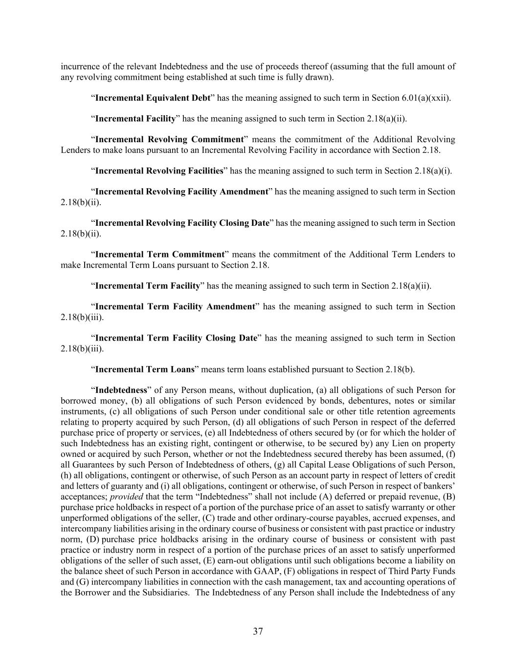 37 incurrence of the relevant Indebtedness and the use of proceeds thereof (assuming that the full amount of any revolving commitment being established at such time is fully drawn). “Incremental Equivalent Debt” has the meaning assigned to such term in Section 6.01(a)(xxii). “Incremental Facility” has the meaning assigned to such term in Section 2.18(a)(ii). “Incremental Revolving Commitment” means the commitment of the Additional Revolving Lenders to make loans pursuant to an Incremental Revolving Facility in accordance with Section 2.18. “Incremental Revolving Facilities” has the meaning assigned to such term in Section 2.18(a)(i). “Incremental Revolving Facility Amendment” has the meaning assigned to such term in Section 2.18(b)(ii). “Incremental Revolving Facility Closing Date” has the meaning assigned to such term in Section 2.18(b)(ii). “Incremental Term Commitment” means the commitment of the Additional Term Lenders to make Incremental Term Loans pursuant to Section 2.18. “Incremental Term Facility” has the meaning assigned to such term in Section 2.18(a)(ii). “Incremental Term Facility Amendment” has the meaning assigned to such term in Section 2.18(b)(iii). “Incremental Term Facility Closing Date” has the meaning assigned to such term in Section 2.18(b)(iii). “Incremental Term Loans” means term loans established pursuant to Section 2.18(b). “Indebtedness” of any Person means, without duplication, (a) all obligations of such Person for borrowed money, (b) all obligations of such Person evidenced by bonds, debentures, notes or similar instruments, (c) all obligations of such Person under conditional sale or other title retention agreements relating to property acquired by such Person, (d) all obligations of such Person in respect of the deferred purchase price of property or services, (e) all Indebtedness of others secured by (or for which the holder of such Indebtedness has an existing right, contingent or otherwise, to be secured by) any Lien on property owned or acquired by such Person, whether or not the Indebtedness secured thereby has been assumed, (f) all Guarantees by such Person of Indebtedness of others, (g) all Capital Lease Obligations of such Person, (h) all obligations, contingent or otherwise, of such Person as an account party in respect of letters of credit and letters of guaranty and (i) all obligations, contingent or otherwise, of such Person in respect of bankers’ acceptances; provided that the term “Indebtedness” shall not include (A) deferred or prepaid revenue, (B) purchase price holdbacks in respect of a portion of the purchase price of an asset to satisfy warranty or other unperformed obligations of the seller, (C) trade and other ordinary-course payables, accrued expenses, and intercompany liabilities arising in the ordinary course of business or consistent with past practice or industry norm, (D) purchase price holdbacks arising in the ordinary course of business or consistent with past practice or industry norm in respect of a portion of the purchase prices of an asset to satisfy unperformed obligations of the seller of such asset, (E) earn-out obligations until such obligations become a liability on the balance sheet of such Person in accordance with GAAP, (F) obligations in respect of Third Party Funds and (G) intercompany liabilities in connection with the cash management, tax and accounting operations of the Borrower and the Subsidiaries. The Indebtedness of any Person shall include the Indebtedness of any