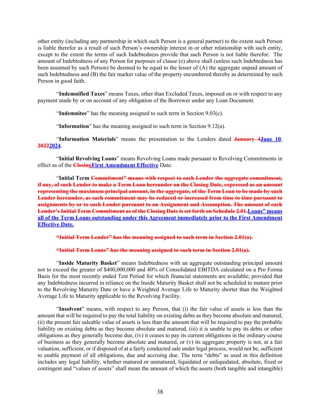 38 other entity (including any partnership in which such Person is a general partner) to the extent such Person is liable therefor as a result of such Person’s ownership interest in or other relationship with such entity, except to the extent the terms of such Indebtedness provide that such Person is not liable therefor. The amount of Indebtedness of any Person for purposes of clause (e) above shall (unless such Indebtedness has been assumed by such Person) be deemed to be equal to the lesser of (A) the aggregate unpaid amount of such Indebtedness and (B) the fair market value of the property encumbered thereby as determined by such Person in good faith. “Indemnified Taxes” means Taxes, other than Excluded Taxes, imposed on or with respect to any payment made by or on account of any obligation of the Borrower under any Loan Document. “Indemnitee” has the meaning assigned to such term in Section 9.03(c). “Information” has the meaning assigned to such term in Section 9.12(a). “Information Materials” means the presentation to the Lenders dated January 4June 10, 20222024. “Initial Revolving Loans” means Revolving Loans made pursuant to Revolving Commitments in effect as of the ClosingFirst Amendment Effective Date. “Initial Term Commitment” means with respect to each Lender the aggregate commitment, if any, of such Lender to make a Term Loan hereunder on the Closing Date, expressed as an amount representing the maximum principal amount, in the aggregate, of the Term Loan to be made by such Lender hereunder, as such commitment may be reduced or increased from time to time pursuant to assignments by or to such Lender pursuant to an Assignment and Assumption. The amount of each Lender’s Initial Term Commitment as of the Closing Date is set forth on Schedule 2.01.Loans” means all of the Term Loans outstanding under this Agreement immediately prior to the First Amendment Effective Date. “Initial Term Lender” has the meaning assigned to such term in Section 2.01(a). “Initial Term Loans” has the meaning assigned to such term in Section 2.01(a). “Inside Maturity Basket” means Indebtedness with an aggregate outstanding principal amount not to exceed the greater of $400,000,000 and 40% of Consolidated EBITDA calculated on a Pro Forma Basis for the most recently ended Test Period for which financial statements are available; provided that any Indebtedness incurred in reliance on the Inside Maturity Basket shall not be scheduled to mature prior to the Revolving Maturity Date or have a Weighted Average Life to Maturity shorter than the Weighted Average Life to Maturity applicable to the Revolving Facility. “Insolvent” means, with respect to any Person, that (i) the fair value of assets is less than the amount that will be required to pay the total liability on existing debts as they become absolute and matured, (ii) the present fair saleable value of assets is less than the amount that will be required to pay the probable liability on existing debts as they become absolute and matured, (iii) it is unable to pay its debts or other obligations as they generally become due, (iv) it ceases to pay its current obligations in the ordinary course of business as they generally become absolute and matured, or (v) its aggregate property is not, at a fair valuation, sufficient, or if disposed of at a fairly conducted sale under legal process, would not be, sufficient to enable payment of all obligations, due and accruing due. The term “debts” as used in this definition includes any legal liability, whether matured or unmatured, liquidated or unliquidated, absolute, fixed or contingent and “values of assets” shall mean the amount of which the assets (both tangible and intangible)