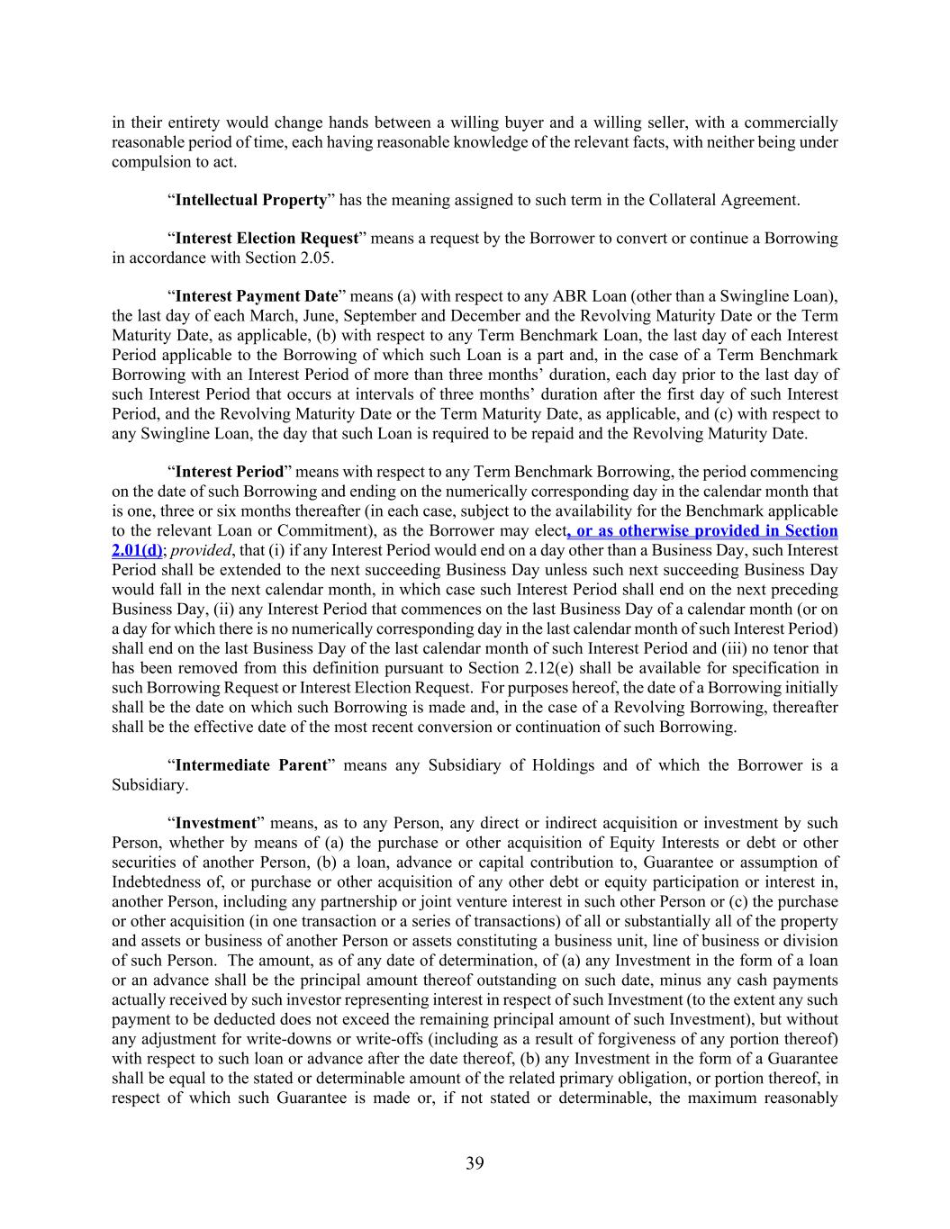 39 in their entirety would change hands between a willing buyer and a willing seller, with a commercially reasonable period of time, each having reasonable knowledge of the relevant facts, with neither being under compulsion to act. “Intellectual Property” has the meaning assigned to such term in the Collateral Agreement. “Interest Election Request” means a request by the Borrower to convert or continue a Borrowing in accordance with Section 2.05. “Interest Payment Date” means (a) with respect to any ABR Loan (other than a Swingline Loan), the last day of each March, June, September and December and the Revolving Maturity Date or the Term Maturity Date, as applicable, (b) with respect to any Term Benchmark Loan, the last day of each Interest Period applicable to the Borrowing of which such Loan is a part and, in the case of a Term Benchmark Borrowing with an Interest Period of more than three months’ duration, each day prior to the last day of such Interest Period that occurs at intervals of three months’ duration after the first day of such Interest Period, and the Revolving Maturity Date or the Term Maturity Date, as applicable, and (c) with respect to any Swingline Loan, the day that such Loan is required to be repaid and the Revolving Maturity Date. “Interest Period” means with respect to any Term Benchmark Borrowing, the period commencing on the date of such Borrowing and ending on the numerically corresponding day in the calendar month that is one, three or six months thereafter (in each case, subject to the availability for the Benchmark applicable to the relevant Loan or Commitment), as the Borrower may elect, or as otherwise provided in Section 2.01(d); provided, that (i) if any Interest Period would end on a day other than a Business Day, such Interest Period shall be extended to the next succeeding Business Day unless such next succeeding Business Day would fall in the next calendar month, in which case such Interest Period shall end on the next preceding Business Day, (ii) any Interest Period that commences on the last Business Day of a calendar month (or on a day for which there is no numerically corresponding day in the last calendar month of such Interest Period) shall end on the last Business Day of the last calendar month of such Interest Period and (iii) no tenor that has been removed from this definition pursuant to Section 2.12(e) shall be available for specification in such Borrowing Request or Interest Election Request. For purposes hereof, the date of a Borrowing initially shall be the date on which such Borrowing is made and, in the case of a Revolving Borrowing, thereafter shall be the effective date of the most recent conversion or continuation of such Borrowing. “Intermediate Parent” means any Subsidiary of Holdings and of which the Borrower is a Subsidiary. “Investment” means, as to any Person, any direct or indirect acquisition or investment by such Person, whether by means of (a) the purchase or other acquisition of Equity Interests or debt or other securities of another Person, (b) a loan, advance or capital contribution to, Guarantee or assumption of Indebtedness of, or purchase or other acquisition of any other debt or equity participation or interest in, another Person, including any partnership or joint venture interest in such other Person or (c) the purchase or other acquisition (in one transaction or a series of transactions) of all or substantially all of the property and assets or business of another Person or assets constituting a business unit, line of business or division of such Person. The amount, as of any date of determination, of (a) any Investment in the form of a loan or an advance shall be the principal amount thereof outstanding on such date, minus any cash payments actually received by such investor representing interest in respect of such Investment (to the extent any such payment to be deducted does not exceed the remaining principal amount of such Investment), but without any adjustment for write-downs or write-offs (including as a result of forgiveness of any portion thereof) with respect to such loan or advance after the date thereof, (b) any Investment in the form of a Guarantee shall be equal to the stated or determinable amount of the related primary obligation, or portion thereof, in respect of which such Guarantee is made or, if not stated or determinable, the maximum reasonably