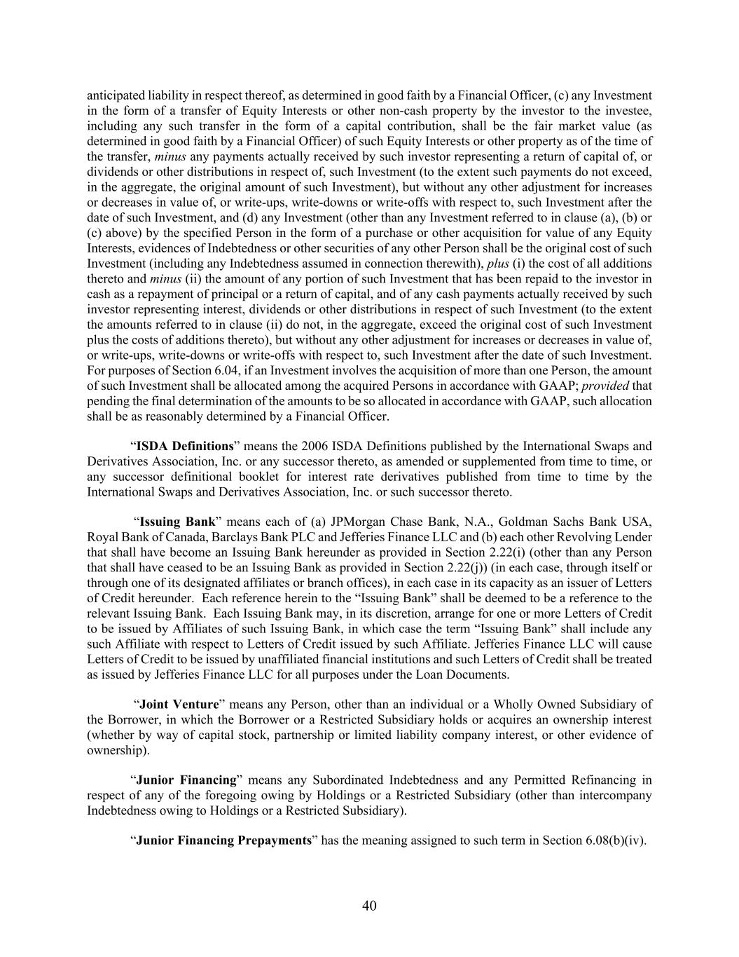 40 anticipated liability in respect thereof, as determined in good faith by a Financial Officer, (c) any Investment in the form of a transfer of Equity Interests or other non-cash property by the investor to the investee, including any such transfer in the form of a capital contribution, shall be the fair market value (as determined in good faith by a Financial Officer) of such Equity Interests or other property as of the time of the transfer, minus any payments actually received by such investor representing a return of capital of, or dividends or other distributions in respect of, such Investment (to the extent such payments do not exceed, in the aggregate, the original amount of such Investment), but without any other adjustment for increases or decreases in value of, or write-ups, write-downs or write-offs with respect to, such Investment after the date of such Investment, and (d) any Investment (other than any Investment referred to in clause (a), (b) or (c) above) by the specified Person in the form of a purchase or other acquisition for value of any Equity Interests, evidences of Indebtedness or other securities of any other Person shall be the original cost of such Investment (including any Indebtedness assumed in connection therewith), plus (i) the cost of all additions thereto and minus (ii) the amount of any portion of such Investment that has been repaid to the investor in cash as a repayment of principal or a return of capital, and of any cash payments actually received by such investor representing interest, dividends or other distributions in respect of such Investment (to the extent the amounts referred to in clause (ii) do not, in the aggregate, exceed the original cost of such Investment plus the costs of additions thereto), but without any other adjustment for increases or decreases in value of, or write-ups, write-downs or write-offs with respect to, such Investment after the date of such Investment. For purposes of Section 6.04, if an Investment involves the acquisition of more than one Person, the amount of such Investment shall be allocated among the acquired Persons in accordance with GAAP; provided that pending the final determination of the amounts to be so allocated in accordance with GAAP, such allocation shall be as reasonably determined by a Financial Officer. “ISDA Definitions” means the 2006 ISDA Definitions published by the International Swaps and Derivatives Association, Inc. or any successor thereto, as amended or supplemented from time to time, or any successor definitional booklet for interest rate derivatives published from time to time by the International Swaps and Derivatives Association, Inc. or such successor thereto. “Issuing Bank” means each of (a) JPMorgan Chase Bank, N.A., Goldman Sachs Bank USA, Royal Bank of Canada, Barclays Bank PLC and Jefferies Finance LLC and (b) each other Revolving Lender that shall have become an Issuing Bank hereunder as provided in Section 2.22(i) (other than any Person that shall have ceased to be an Issuing Bank as provided in Section 2.22(j)) (in each case, through itself or through one of its designated affiliates or branch offices), in each case in its capacity as an issuer of Letters of Credit hereunder. Each reference herein to the “Issuing Bank” shall be deemed to be a reference to the relevant Issuing Bank. Each Issuing Bank may, in its discretion, arrange for one or more Letters of Credit to be issued by Affiliates of such Issuing Bank, in which case the term “Issuing Bank” shall include any such Affiliate with respect to Letters of Credit issued by such Affiliate. Jefferies Finance LLC will cause Letters of Credit to be issued by unaffiliated financial institutions and such Letters of Credit shall be treated as issued by Jefferies Finance LLC for all purposes under the Loan Documents. “Joint Venture” means any Person, other than an individual or a Wholly Owned Subsidiary of the Borrower, in which the Borrower or a Restricted Subsidiary holds or acquires an ownership interest (whether by way of capital stock, partnership or limited liability company interest, or other evidence of ownership). “Junior Financing” means any Subordinated Indebtedness and any Permitted Refinancing in respect of any of the foregoing owing by Holdings or a Restricted Subsidiary (other than intercompany Indebtedness owing to Holdings or a Restricted Subsidiary). “Junior Financing Prepayments” has the meaning assigned to such term in Section 6.08(b)(iv).