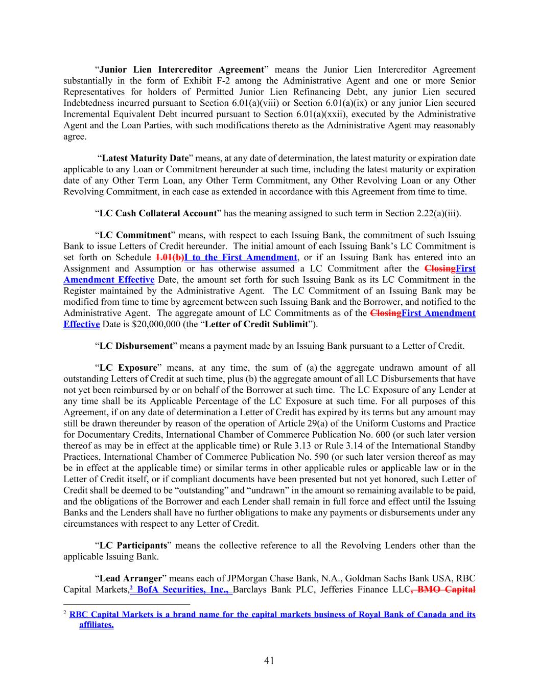 41 “Junior Lien Intercreditor Agreement” means the Junior Lien Intercreditor Agreement substantially in the form of Exhibit F-2 among the Administrative Agent and one or more Senior Representatives for holders of Permitted Junior Lien Refinancing Debt, any junior Lien secured Indebtedness incurred pursuant to Section 6.01(a)(viii) or Section 6.01(a)(ix) or any junior Lien secured Incremental Equivalent Debt incurred pursuant to Section 6.01(a)(xxii), executed by the Administrative Agent and the Loan Parties, with such modifications thereto as the Administrative Agent may reasonably agree. “Latest Maturity Date” means, at any date of determination, the latest maturity or expiration date applicable to any Loan or Commitment hereunder at such time, including the latest maturity or expiration date of any Other Term Loan, any Other Term Commitment, any Other Revolving Loan or any Other Revolving Commitment, in each case as extended in accordance with this Agreement from time to time. “LC Cash Collateral Account” has the meaning assigned to such term in Section 2.22(a)(iii). “LC Commitment” means, with respect to each Issuing Bank, the commitment of such Issuing Bank to issue Letters of Credit hereunder. The initial amount of each Issuing Bank’s LC Commitment is set forth on Schedule 1.01(b)I to the First Amendment, or if an Issuing Bank has entered into an Assignment and Assumption or has otherwise assumed a LC Commitment after the ClosingFirst Amendment Effective Date, the amount set forth for such Issuing Bank as its LC Commitment in the Register maintained by the Administrative Agent. The LC Commitment of an Issuing Bank may be modified from time to time by agreement between such Issuing Bank and the Borrower, and notified to the Administrative Agent. The aggregate amount of LC Commitments as of the ClosingFirst Amendment Effective Date is $20,000,000 (the “Letter of Credit Sublimit”). “LC Disbursement” means a payment made by an Issuing Bank pursuant to a Letter of Credit. “LC Exposure” means, at any time, the sum of (a) the aggregate undrawn amount of all outstanding Letters of Credit at such time, plus (b) the aggregate amount of all LC Disbursements that have not yet been reimbursed by or on behalf of the Borrower at such time. The LC Exposure of any Lender at any time shall be its Applicable Percentage of the LC Exposure at such time. For all purposes of this Agreement, if on any date of determination a Letter of Credit has expired by its terms but any amount may still be drawn thereunder by reason of the operation of Article 29(a) of the Uniform Customs and Practice for Documentary Credits, International Chamber of Commerce Publication No. 600 (or such later version thereof as may be in effect at the applicable time) or Rule 3.13 or Rule 3.14 of the International Standby Practices, International Chamber of Commerce Publication No. 590 (or such later version thereof as may be in effect at the applicable time) or similar terms in other applicable rules or applicable law or in the Letter of Credit itself, or if compliant documents have been presented but not yet honored, such Letter of Credit shall be deemed to be “outstanding” and “undrawn” in the amount so remaining available to be paid, and the obligations of the Borrower and each Lender shall remain in full force and effect until the Issuing Banks and the Lenders shall have no further obligations to make any payments or disbursements under any circumstances with respect to any Letter of Credit. “LC Participants” means the collective reference to all the Revolving Lenders other than the applicable Issuing Bank. “Lead Arranger” means each of JPMorgan Chase Bank, N.A., Goldman Sachs Bank USA, RBC Capital Markets,2 BofA Securities, Inc., Barclays Bank PLC, Jefferies Finance LLC, BMO Capital 2 RBC Capital Markets is a brand name for the capital markets business of Royal Bank of Canada and its affiliates.