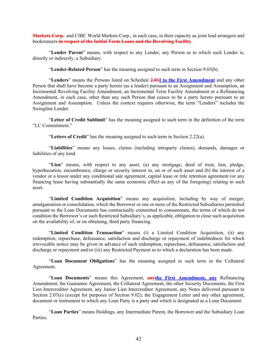 42 Markets Corp. and CIBC World Markets Corp., in each case, in their capacity as joint lead arrangers and bookrunners in respect of the Initial Term Loans and the Revolving Facility. “Lender Parent” means, with respect to any Lender, any Person as to which such Lender is, directly or indirectly, a Subsidiary. “Lender-Related Person” has the meaning assigned to such term in Section 9.03(b). “Lenders” means the Persons listed on Schedule 2.01I to the First Amendment and any other Person that shall have become a party hereto (as a lender) pursuant to an Assignment and Assumption, an Incremental Revolving Facility Amendment, an Incremental Term Facility Amendment or a Refinancing Amendment, in each case, other than any such Person that ceases to be a party hereto pursuant to an Assignment and Assumption. Unless the context requires otherwise, the term “Lenders” includes the Swingline Lender. “Letter of Credit Sublimit” has the meaning assigned to such term in the definition of the term “LC Commitment.” “Letters of Credit” has the meaning assigned to such term in Section 2.22(a). “Liabilities” means any losses, claims (including intraparty claims), demands, damages or liabilities of any kind. “Lien” means, with respect to any asset, (a) any mortgage, deed of trust, lien, pledge, hypothecation, encumbrance, charge or security interest in, on or of such asset and (b) the interest of a vendor or a lessor under any conditional sale agreement, capital lease or title retention agreement (or any financing lease having substantially the same economic effect as any of the foregoing) relating to such asset. “Limited Condition Acquisition” means any acquisition, including by way of merger, amalgamation or consolidation, which the Borrower or one or more of the Restricted Subsidiaries permitted pursuant to the Loan Documents has contractually committed to consummate, the terms of which do not condition the Borrower’s or such Restricted Subsidiary’s, as applicable, obligation to close such acquisition on the availability of, or on obtaining, third party financing. “Limited Condition Transaction” means (i) a Limited Condition Acquisition, (ii) any redemption, repurchase, defeasance, satisfaction and discharge or repayment of indebtedness for which irrevocable notice may be given in advance of such redemption, repurchase, defeasance, satisfaction and discharge or repayment and/or (iii) any Restricted Payment as to which a declaration has been made. “Loan Document Obligations” has the meaning assigned to such term in the Collateral Agreement. “Loan Documents” means this Agreement, anythe First Amendment, any Refinancing Amendment, the Guarantee Agreement, the Collateral Agreement, the other Security Documents, the First Lien Intercreditor Agreement, any Junior Lien Intercreditor Agreement, any Notes delivered pursuant to Section 2.07(e) (except for purposes of Section 9.02), the Engagement Letter and any other agreement, document or instrument to which any Loan Party is a party and which is designated as a Loan Document. “Loan Parties” means Holdings, any Intermediate Parent, the Borrower and the Subsidiary Loan Parties.