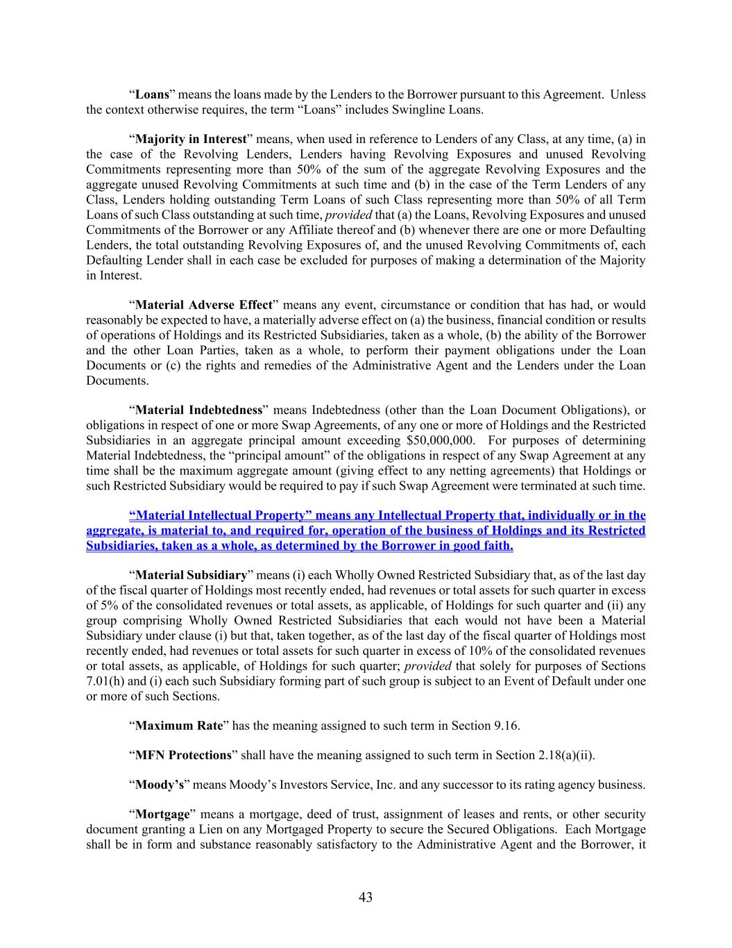 43 “Loans” means the loans made by the Lenders to the Borrower pursuant to this Agreement. Unless the context otherwise requires, the term “Loans” includes Swingline Loans. “Majority in Interest” means, when used in reference to Lenders of any Class, at any time, (a) in the case of the Revolving Lenders, Lenders having Revolving Exposures and unused Revolving Commitments representing more than 50% of the sum of the aggregate Revolving Exposures and the aggregate unused Revolving Commitments at such time and (b) in the case of the Term Lenders of any Class, Lenders holding outstanding Term Loans of such Class representing more than 50% of all Term Loans of such Class outstanding at such time, provided that (a) the Loans, Revolving Exposures and unused Commitments of the Borrower or any Affiliate thereof and (b) whenever there are one or more Defaulting Lenders, the total outstanding Revolving Exposures of, and the unused Revolving Commitments of, each Defaulting Lender shall in each case be excluded for purposes of making a determination of the Majority in Interest. “Material Adverse Effect” means any event, circumstance or condition that has had, or would reasonably be expected to have, a materially adverse effect on (a) the business, financial condition or results of operations of Holdings and its Restricted Subsidiaries, taken as a whole, (b) the ability of the Borrower and the other Loan Parties, taken as a whole, to perform their payment obligations under the Loan Documents or (c) the rights and remedies of the Administrative Agent and the Lenders under the Loan Documents. “Material Indebtedness” means Indebtedness (other than the Loan Document Obligations), or obligations in respect of one or more Swap Agreements, of any one or more of Holdings and the Restricted Subsidiaries in an aggregate principal amount exceeding $50,000,000. For purposes of determining Material Indebtedness, the “principal amount” of the obligations in respect of any Swap Agreement at any time shall be the maximum aggregate amount (giving effect to any netting agreements) that Holdings or such Restricted Subsidiary would be required to pay if such Swap Agreement were terminated at such time. “Material Intellectual Property” means any Intellectual Property that, individually or in the aggregate, is material to, and required for, operation of the business of Holdings and its Restricted Subsidiaries, taken as a whole, as determined by the Borrower in good faith. “Material Subsidiary” means (i) each Wholly Owned Restricted Subsidiary that, as of the last day of the fiscal quarter of Holdings most recently ended, had revenues or total assets for such quarter in excess of 5% of the consolidated revenues or total assets, as applicable, of Holdings for such quarter and (ii) any group comprising Wholly Owned Restricted Subsidiaries that each would not have been a Material Subsidiary under clause (i) but that, taken together, as of the last day of the fiscal quarter of Holdings most recently ended, had revenues or total assets for such quarter in excess of 10% of the consolidated revenues or total assets, as applicable, of Holdings for such quarter; provided that solely for purposes of Sections 7.01(h) and (i) each such Subsidiary forming part of such group is subject to an Event of Default under one or more of such Sections. “Maximum Rate” has the meaning assigned to such term in Section 9.16. “MFN Protections” shall have the meaning assigned to such term in Section 2.18(a)(ii). “Moody’s” means Moody’s Investors Service, Inc. and any successor to its rating agency business. “Mortgage” means a mortgage, deed of trust, assignment of leases and rents, or other security document granting a Lien on any Mortgaged Property to secure the Secured Obligations. Each Mortgage shall be in form and substance reasonably satisfactory to the Administrative Agent and the Borrower, it