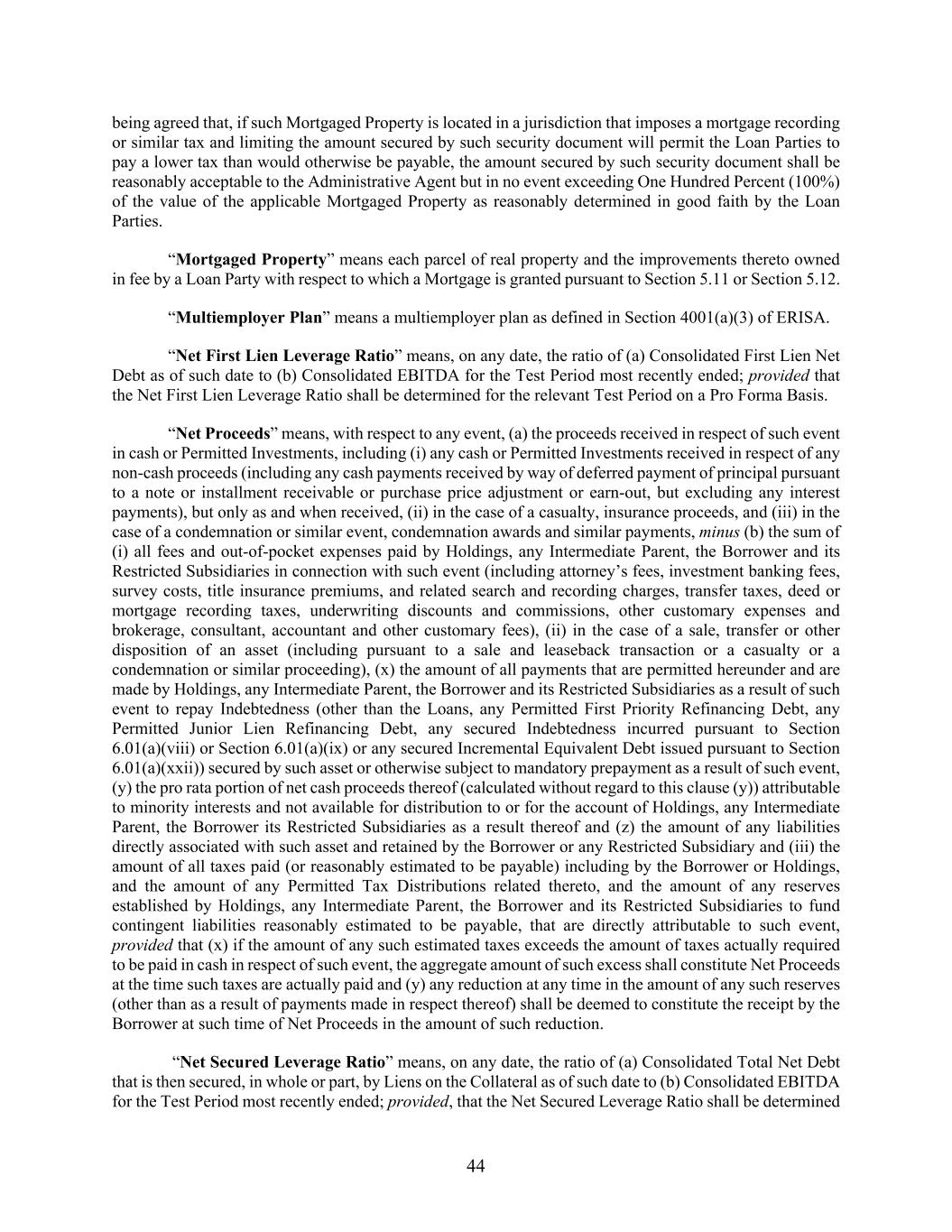 44 being agreed that, if such Mortgaged Property is located in a jurisdiction that imposes a mortgage recording or similar tax and limiting the amount secured by such security document will permit the Loan Parties to pay a lower tax than would otherwise be payable, the amount secured by such security document shall be reasonably acceptable to the Administrative Agent but in no event exceeding One Hundred Percent (100%) of the value of the applicable Mortgaged Property as reasonably determined in good faith by the Loan Parties. “Mortgaged Property” means each parcel of real property and the improvements thereto owned in fee by a Loan Party with respect to which a Mortgage is granted pursuant to Section 5.11 or Section 5.12. “Multiemployer Plan” means a multiemployer plan as defined in Section 4001(a)(3) of ERISA. “Net First Lien Leverage Ratio” means, on any date, the ratio of (a) Consolidated First Lien Net Debt as of such date to (b) Consolidated EBITDA for the Test Period most recently ended; provided that the Net First Lien Leverage Ratio shall be determined for the relevant Test Period on a Pro Forma Basis. “Net Proceeds” means, with respect to any event, (a) the proceeds received in respect of such event in cash or Permitted Investments, including (i) any cash or Permitted Investments received in respect of any non-cash proceeds (including any cash payments received by way of deferred payment of principal pursuant to a note or installment receivable or purchase price adjustment or earn-out, but excluding any interest payments), but only as and when received, (ii) in the case of a casualty, insurance proceeds, and (iii) in the case of a condemnation or similar event, condemnation awards and similar payments, minus (b) the sum of (i) all fees and out-of-pocket expenses paid by Holdings, any Intermediate Parent, the Borrower and its Restricted Subsidiaries in connection with such event (including attorney’s fees, investment banking fees, survey costs, title insurance premiums, and related search and recording charges, transfer taxes, deed or mortgage recording taxes, underwriting discounts and commissions, other customary expenses and brokerage, consultant, accountant and other customary fees), (ii) in the case of a sale, transfer or other disposition of an asset (including pursuant to a sale and leaseback transaction or a casualty or a condemnation or similar proceeding), (x) the amount of all payments that are permitted hereunder and are made by Holdings, any Intermediate Parent, the Borrower and its Restricted Subsidiaries as a result of such event to repay Indebtedness (other than the Loans, any Permitted First Priority Refinancing Debt, any Permitted Junior Lien Refinancing Debt, any secured Indebtedness incurred pursuant to Section 6.01(a)(viii) or Section 6.01(a)(ix) or any secured Incremental Equivalent Debt issued pursuant to Section 6.01(a)(xxii)) secured by such asset or otherwise subject to mandatory prepayment as a result of such event, (y) the pro rata portion of net cash proceeds thereof (calculated without regard to this clause (y)) attributable to minority interests and not available for distribution to or for the account of Holdings, any Intermediate Parent, the Borrower its Restricted Subsidiaries as a result thereof and (z) the amount of any liabilities directly associated with such asset and retained by the Borrower or any Restricted Subsidiary and (iii) the amount of all taxes paid (or reasonably estimated to be payable) including by the Borrower or Holdings, and the amount of any Permitted Tax Distributions related thereto, and the amount of any reserves established by Holdings, any Intermediate Parent, the Borrower and its Restricted Subsidiaries to fund contingent liabilities reasonably estimated to be payable, that are directly attributable to such event, provided that (x) if the amount of any such estimated taxes exceeds the amount of taxes actually required to be paid in cash in respect of such event, the aggregate amount of such excess shall constitute Net Proceeds at the time such taxes are actually paid and (y) any reduction at any time in the amount of any such reserves (other than as a result of payments made in respect thereof) shall be deemed to constitute the receipt by the Borrower at such time of Net Proceeds in the amount of such reduction. “Net Secured Leverage Ratio” means, on any date, the ratio of (a) Consolidated Total Net Debt that is then secured, in whole or part, by Liens on the Collateral as of such date to (b) Consolidated EBITDA for the Test Period most recently ended; provided, that the Net Secured Leverage Ratio shall be determined