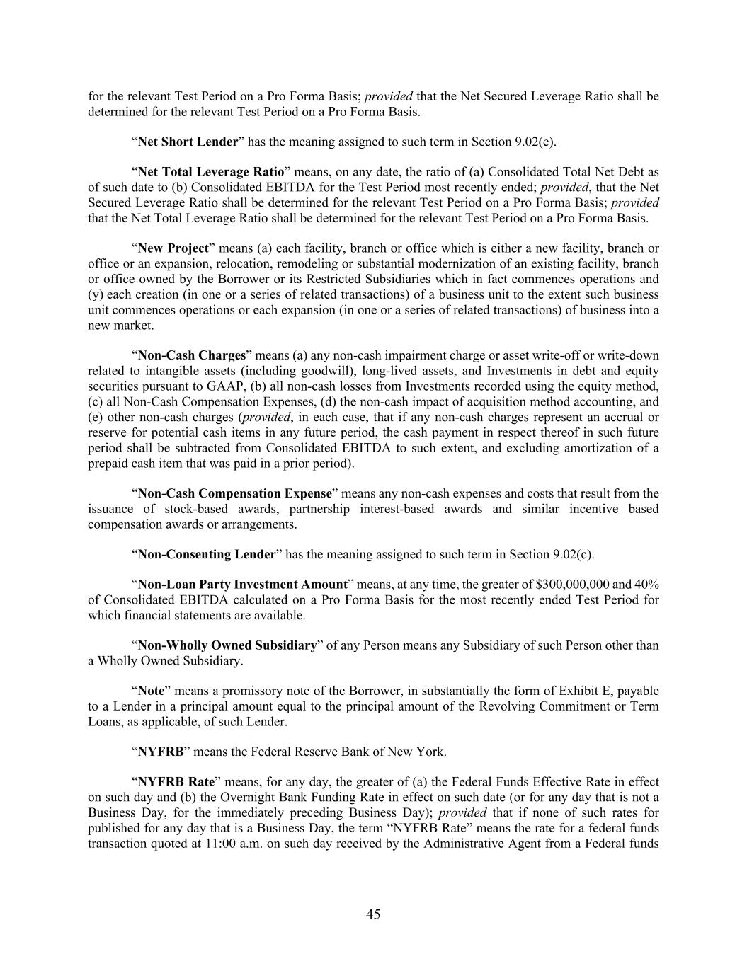 45 for the relevant Test Period on a Pro Forma Basis; provided that the Net Secured Leverage Ratio shall be determined for the relevant Test Period on a Pro Forma Basis. “Net Short Lender” has the meaning assigned to such term in Section 9.02(e). “Net Total Leverage Ratio” means, on any date, the ratio of (a) Consolidated Total Net Debt as of such date to (b) Consolidated EBITDA for the Test Period most recently ended; provided, that the Net Secured Leverage Ratio shall be determined for the relevant Test Period on a Pro Forma Basis; provided that the Net Total Leverage Ratio shall be determined for the relevant Test Period on a Pro Forma Basis. “New Project” means (a) each facility, branch or office which is either a new facility, branch or office or an expansion, relocation, remodeling or substantial modernization of an existing facility, branch or office owned by the Borrower or its Restricted Subsidiaries which in fact commences operations and (y) each creation (in one or a series of related transactions) of a business unit to the extent such business unit commences operations or each expansion (in one or a series of related transactions) of business into a new market. “Non-Cash Charges” means (a) any non-cash impairment charge or asset write-off or write-down related to intangible assets (including goodwill), long-lived assets, and Investments in debt and equity securities pursuant to GAAP, (b) all non-cash losses from Investments recorded using the equity method, (c) all Non-Cash Compensation Expenses, (d) the non-cash impact of acquisition method accounting, and (e) other non-cash charges (provided, in each case, that if any non-cash charges represent an accrual or reserve for potential cash items in any future period, the cash payment in respect thereof in such future period shall be subtracted from Consolidated EBITDA to such extent, and excluding amortization of a prepaid cash item that was paid in a prior period). “Non-Cash Compensation Expense” means any non-cash expenses and costs that result from the issuance of stock-based awards, partnership interest-based awards and similar incentive based compensation awards or arrangements. “Non-Consenting Lender” has the meaning assigned to such term in Section 9.02(c). “Non-Loan Party Investment Amount” means, at any time, the greater of $300,000,000 and 40% of Consolidated EBITDA calculated on a Pro Forma Basis for the most recently ended Test Period for which financial statements are available. “Non-Wholly Owned Subsidiary” of any Person means any Subsidiary of such Person other than a Wholly Owned Subsidiary. “Note” means a promissory note of the Borrower, in substantially the form of Exhibit E, payable to a Lender in a principal amount equal to the principal amount of the Revolving Commitment or Term Loans, as applicable, of such Lender. “NYFRB” means the Federal Reserve Bank of New York. “NYFRB Rate” means, for any day, the greater of (a) the Federal Funds Effective Rate in effect on such day and (b) the Overnight Bank Funding Rate in effect on such date (or for any day that is not a Business Day, for the immediately preceding Business Day); provided that if none of such rates for published for any day that is a Business Day, the term “NYFRB Rate” means the rate for a federal funds transaction quoted at 11:00 a.m. on such day received by the Administrative Agent from a Federal funds