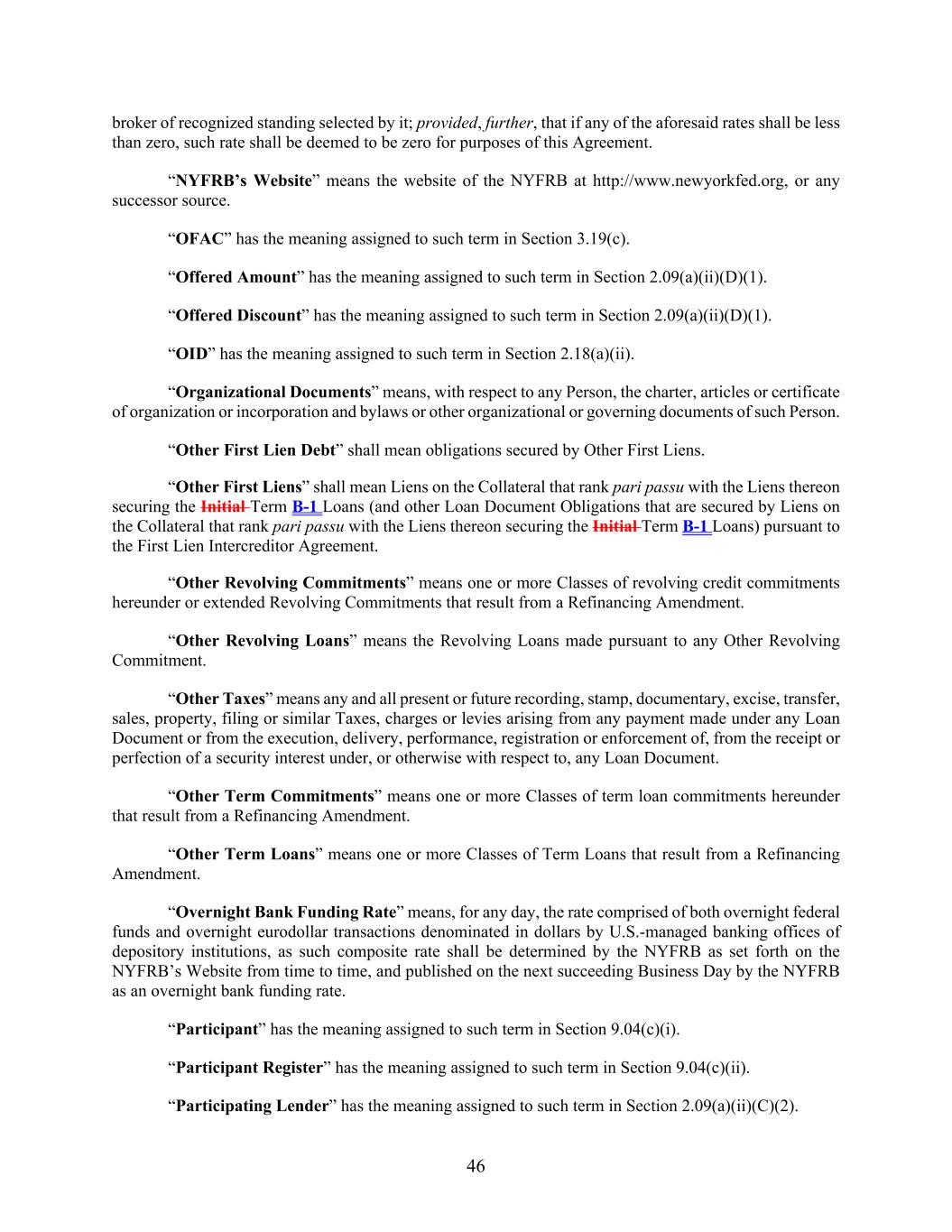 46 broker of recognized standing selected by it; provided, further, that if any of the aforesaid rates shall be less than zero, such rate shall be deemed to be zero for purposes of this Agreement. “NYFRB’s Website” means the website of the NYFRB at http://www.newyorkfed.org, or any successor source. “OFAC” has the meaning assigned to such term in Section 3.19(c). “Offered Amount” has the meaning assigned to such term in Section 2.09(a)(ii)(D)(1). “Offered Discount” has the meaning assigned to such term in Section 2.09(a)(ii)(D)(1). “OID” has the meaning assigned to such term in Section 2.18(a)(ii). “Organizational Documents” means, with respect to any Person, the charter, articles or certificate of organization or incorporation and bylaws or other organizational or governing documents of such Person. “Other First Lien Debt” shall mean obligations secured by Other First Liens. “Other First Liens” shall mean Liens on the Collateral that rank pari passu with the Liens thereon securing the Initial Term B-1 Loans (and other Loan Document Obligations that are secured by Liens on the Collateral that rank pari passu with the Liens thereon securing the Initial Term B-1 Loans) pursuant to the First Lien Intercreditor Agreement. “Other Revolving Commitments” means one or more Classes of revolving credit commitments hereunder or extended Revolving Commitments that result from a Refinancing Amendment. “Other Revolving Loans” means the Revolving Loans made pursuant to any Other Revolving Commitment. “Other Taxes” means any and all present or future recording, stamp, documentary, excise, transfer, sales, property, filing or similar Taxes, charges or levies arising from any payment made under any Loan Document or from the execution, delivery, performance, registration or enforcement of, from the receipt or perfection of a security interest under, or otherwise with respect to, any Loan Document. “Other Term Commitments” means one or more Classes of term loan commitments hereunder that result from a Refinancing Amendment. “Other Term Loans” means one or more Classes of Term Loans that result from a Refinancing Amendment. “Overnight Bank Funding Rate” means, for any day, the rate comprised of both overnight federal funds and overnight eurodollar transactions denominated in dollars by U.S.-managed banking offices of depository institutions, as such composite rate shall be determined by the NYFRB as set forth on the NYFRB’s Website from time to time, and published on the next succeeding Business Day by the NYFRB as an overnight bank funding rate. “Participant” has the meaning assigned to such term in Section 9.04(c)(i). “Participant Register” has the meaning assigned to such term in Section 9.04(c)(ii). “Participating Lender” has the meaning assigned to such term in Section 2.09(a)(ii)(C)(2).