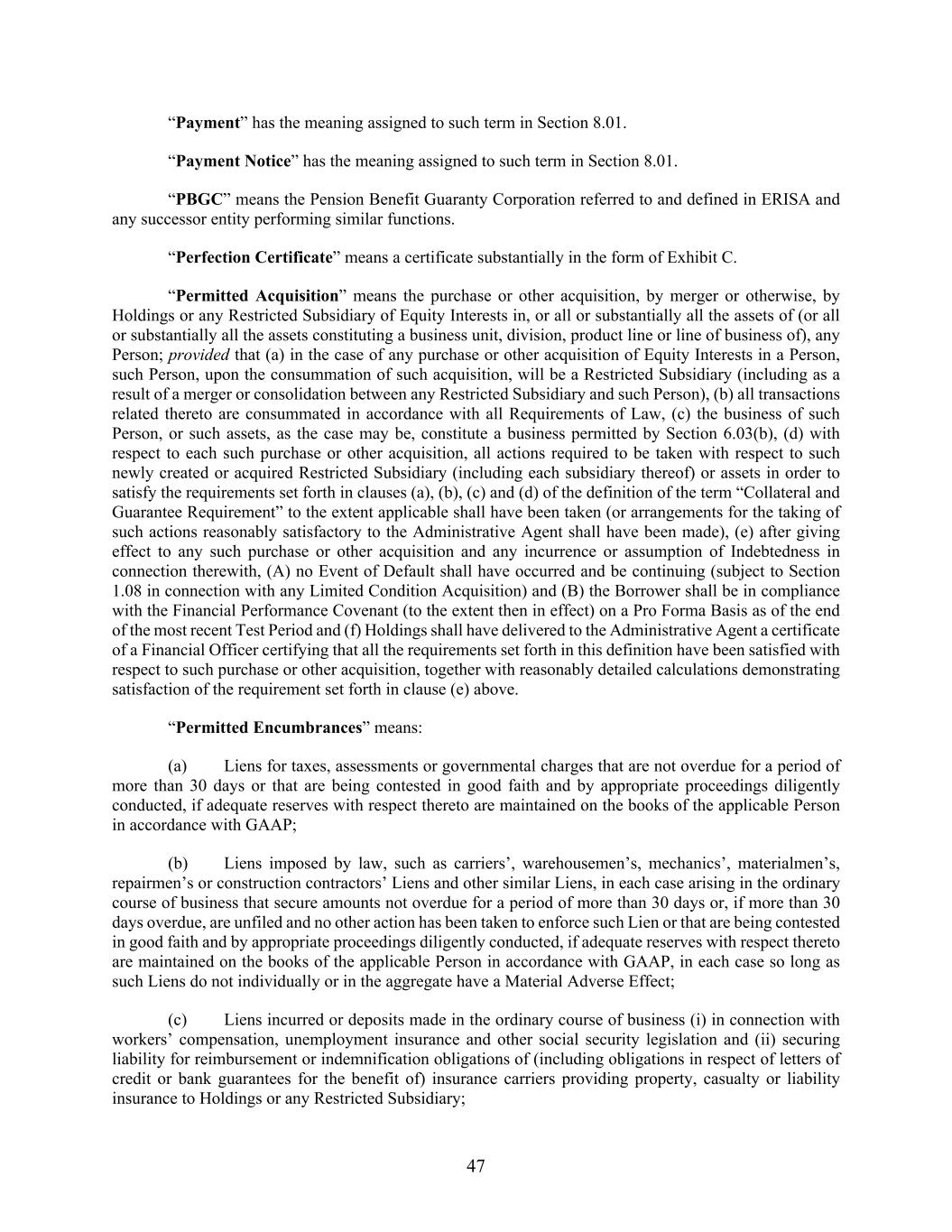 47 “Payment” has the meaning assigned to such term in Section 8.01. “Payment Notice” has the meaning assigned to such term in Section 8.01. “PBGC” means the Pension Benefit Guaranty Corporation referred to and defined in ERISA and any successor entity performing similar functions. “Perfection Certificate” means a certificate substantially in the form of Exhibit C. “Permitted Acquisition” means the purchase or other acquisition, by merger or otherwise, by Holdings or any Restricted Subsidiary of Equity Interests in, or all or substantially all the assets of (or all or substantially all the assets constituting a business unit, division, product line or line of business of), any Person; provided that (a) in the case of any purchase or other acquisition of Equity Interests in a Person, such Person, upon the consummation of such acquisition, will be a Restricted Subsidiary (including as a result of a merger or consolidation between any Restricted Subsidiary and such Person), (b) all transactions related thereto are consummated in accordance with all Requirements of Law, (c) the business of such Person, or such assets, as the case may be, constitute a business permitted by Section 6.03(b), (d) with respect to each such purchase or other acquisition, all actions required to be taken with respect to such newly created or acquired Restricted Subsidiary (including each subsidiary thereof) or assets in order to satisfy the requirements set forth in clauses (a), (b), (c) and (d) of the definition of the term “Collateral and Guarantee Requirement” to the extent applicable shall have been taken (or arrangements for the taking of such actions reasonably satisfactory to the Administrative Agent shall have been made), (e) after giving effect to any such purchase or other acquisition and any incurrence or assumption of Indebtedness in connection therewith, (A) no Event of Default shall have occurred and be continuing (subject to Section 1.08 in connection with any Limited Condition Acquisition) and (B) the Borrower shall be in compliance with the Financial Performance Covenant (to the extent then in effect) on a Pro Forma Basis as of the end of the most recent Test Period and (f) Holdings shall have delivered to the Administrative Agent a certificate of a Financial Officer certifying that all the requirements set forth in this definition have been satisfied with respect to such purchase or other acquisition, together with reasonably detailed calculations demonstrating satisfaction of the requirement set forth in clause (e) above. “Permitted Encumbrances” means: (a) Liens for taxes, assessments or governmental charges that are not overdue for a period of more than 30 days or that are being contested in good faith and by appropriate proceedings diligently conducted, if adequate reserves with respect thereto are maintained on the books of the applicable Person in accordance with GAAP; (b) Liens imposed by law, such as carriers’, warehousemen’s, mechanics’, materialmen’s, repairmen’s or construction contractors’ Liens and other similar Liens, in each case arising in the ordinary course of business that secure amounts not overdue for a period of more than 30 days or, if more than 30 days overdue, are unfiled and no other action has been taken to enforce such Lien or that are being contested in good faith and by appropriate proceedings diligently conducted, if adequate reserves with respect thereto are maintained on the books of the applicable Person in accordance with GAAP, in each case so long as such Liens do not individually or in the aggregate have a Material Adverse Effect; (c) Liens incurred or deposits made in the ordinary course of business (i) in connection with workers’ compensation, unemployment insurance and other social security legislation and (ii) securing liability for reimbursement or indemnification obligations of (including obligations in respect of letters of credit or bank guarantees for the benefit of) insurance carriers providing property, casualty or liability insurance to Holdings or any Restricted Subsidiary;