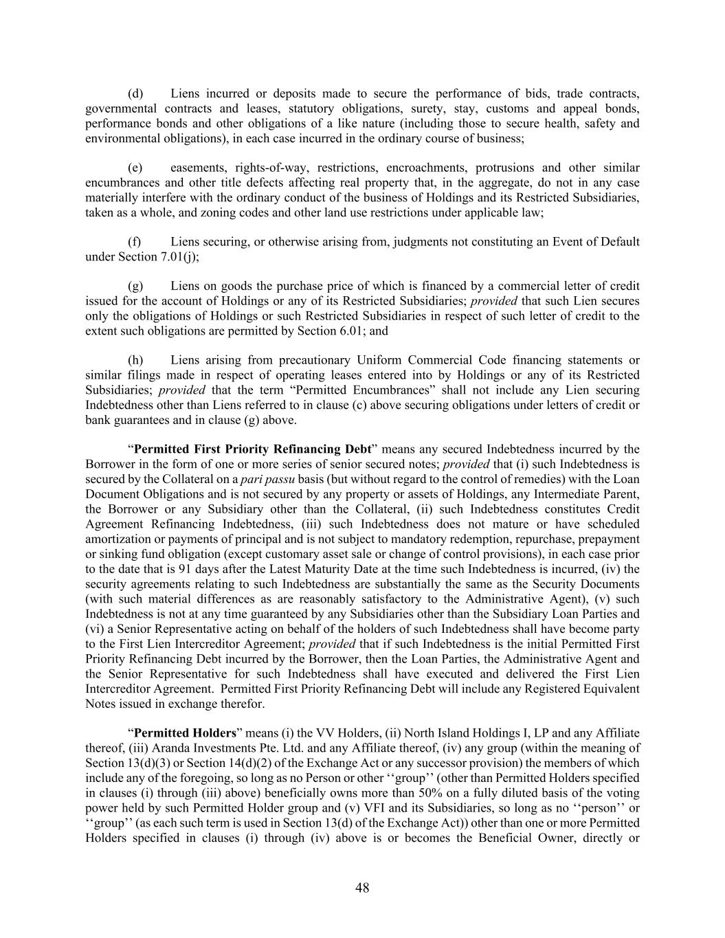 48 (d) Liens incurred or deposits made to secure the performance of bids, trade contracts, governmental contracts and leases, statutory obligations, surety, stay, customs and appeal bonds, performance bonds and other obligations of a like nature (including those to secure health, safety and environmental obligations), in each case incurred in the ordinary course of business; (e) easements, rights-of-way, restrictions, encroachments, protrusions and other similar encumbrances and other title defects affecting real property that, in the aggregate, do not in any case materially interfere with the ordinary conduct of the business of Holdings and its Restricted Subsidiaries, taken as a whole, and zoning codes and other land use restrictions under applicable law; (f) Liens securing, or otherwise arising from, judgments not constituting an Event of Default under Section 7.01(j); (g) Liens on goods the purchase price of which is financed by a commercial letter of credit issued for the account of Holdings or any of its Restricted Subsidiaries; provided that such Lien secures only the obligations of Holdings or such Restricted Subsidiaries in respect of such letter of credit to the extent such obligations are permitted by Section 6.01; and (h) Liens arising from precautionary Uniform Commercial Code financing statements or similar filings made in respect of operating leases entered into by Holdings or any of its Restricted Subsidiaries; provided that the term “Permitted Encumbrances” shall not include any Lien securing Indebtedness other than Liens referred to in clause (c) above securing obligations under letters of credit or bank guarantees and in clause (g) above. “Permitted First Priority Refinancing Debt” means any secured Indebtedness incurred by the Borrower in the form of one or more series of senior secured notes; provided that (i) such Indebtedness is secured by the Collateral on a pari passu basis (but without regard to the control of remedies) with the Loan Document Obligations and is not secured by any property or assets of Holdings, any Intermediate Parent, the Borrower or any Subsidiary other than the Collateral, (ii) such Indebtedness constitutes Credit Agreement Refinancing Indebtedness, (iii) such Indebtedness does not mature or have scheduled amortization or payments of principal and is not subject to mandatory redemption, repurchase, prepayment or sinking fund obligation (except customary asset sale or change of control provisions), in each case prior to the date that is 91 days after the Latest Maturity Date at the time such Indebtedness is incurred, (iv) the security agreements relating to such Indebtedness are substantially the same as the Security Documents (with such material differences as are reasonably satisfactory to the Administrative Agent), (v) such Indebtedness is not at any time guaranteed by any Subsidiaries other than the Subsidiary Loan Parties and (vi) a Senior Representative acting on behalf of the holders of such Indebtedness shall have become party to the First Lien Intercreditor Agreement; provided that if such Indebtedness is the initial Permitted First Priority Refinancing Debt incurred by the Borrower, then the Loan Parties, the Administrative Agent and the Senior Representative for such Indebtedness shall have executed and delivered the First Lien Intercreditor Agreement. Permitted First Priority Refinancing Debt will include any Registered Equivalent Notes issued in exchange therefor. “Permitted Holders” means (i) the VV Holders, (ii) North Island Holdings I, LP and any Affiliate thereof, (iii) Aranda Investments Pte. Ltd. and any Affiliate thereof, (iv) any group (within the meaning of Section 13(d)(3) or Section 14(d)(2) of the Exchange Act or any successor provision) the members of which include any of the foregoing, so long as no Person or other ‘‘group’’ (other than Permitted Holders specified in clauses (i) through (iii) above) beneficially owns more than 50% on a fully diluted basis of the voting power held by such Permitted Holder group and (v) VFI and its Subsidiaries, so long as no ‘‘person’’ or ‘‘group’’ (as each such term is used in Section 13(d) of the Exchange Act)) other than one or more Permitted Holders specified in clauses (i) through (iv) above is or becomes the Beneficial Owner, directly or