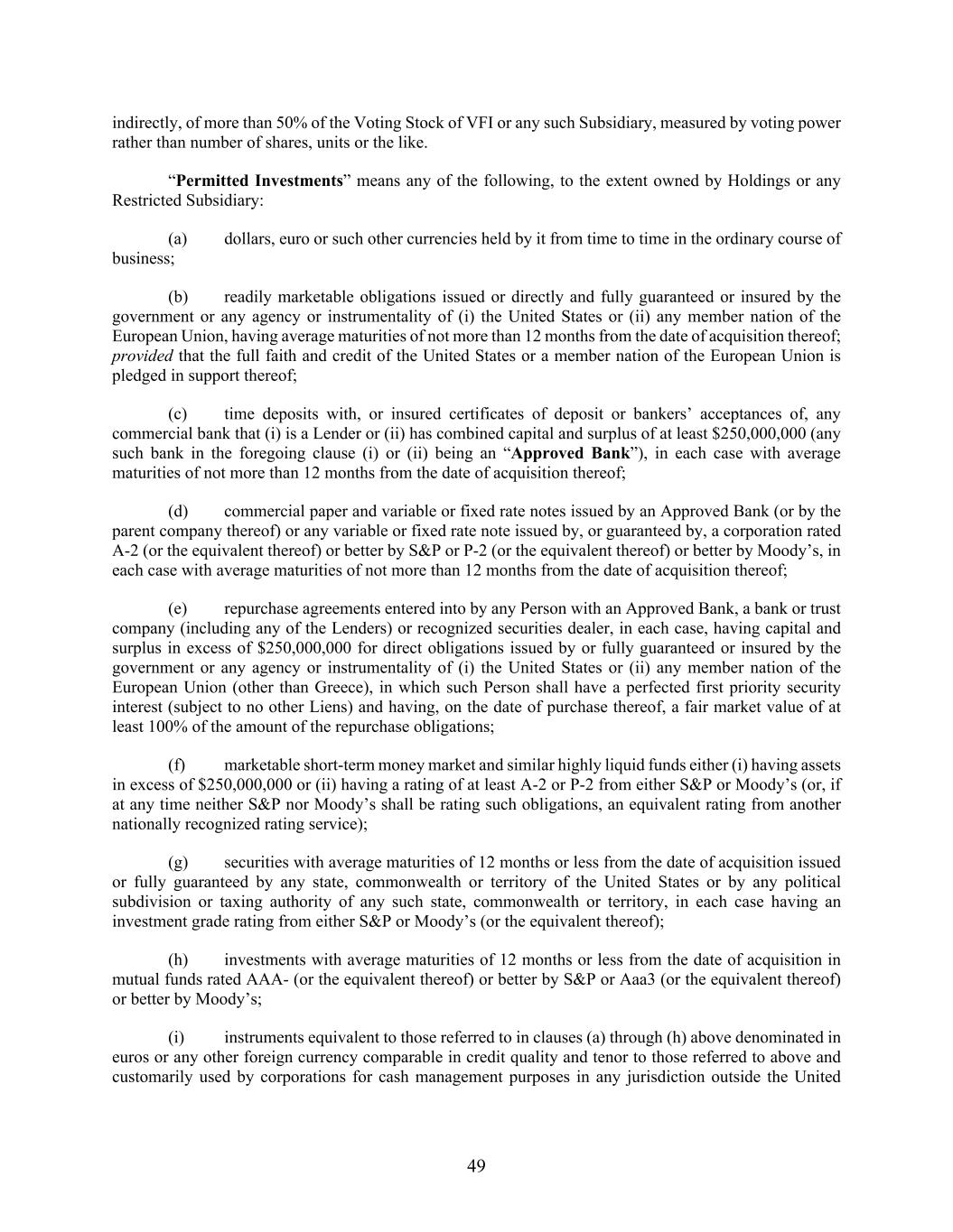 49 indirectly, of more than 50% of the Voting Stock of VFI or any such Subsidiary, measured by voting power rather than number of shares, units or the like. “Permitted Investments” means any of the following, to the extent owned by Holdings or any Restricted Subsidiary: (a) dollars, euro or such other currencies held by it from time to time in the ordinary course of business; (b) readily marketable obligations issued or directly and fully guaranteed or insured by the government or any agency or instrumentality of (i) the United States or (ii) any member nation of the European Union, having average maturities of not more than 12 months from the date of acquisition thereof; provided that the full faith and credit of the United States or a member nation of the European Union is pledged in support thereof; (c) time deposits with, or insured certificates of deposit or bankers’ acceptances of, any commercial bank that (i) is a Lender or (ii) has combined capital and surplus of at least $250,000,000 (any such bank in the foregoing clause (i) or (ii) being an “Approved Bank”), in each case with average maturities of not more than 12 months from the date of acquisition thereof; (d) commercial paper and variable or fixed rate notes issued by an Approved Bank (or by the parent company thereof) or any variable or fixed rate note issued by, or guaranteed by, a corporation rated A-2 (or the equivalent thereof) or better by S&P or P-2 (or the equivalent thereof) or better by Moody’s, in each case with average maturities of not more than 12 months from the date of acquisition thereof; (e) repurchase agreements entered into by any Person with an Approved Bank, a bank or trust company (including any of the Lenders) or recognized securities dealer, in each case, having capital and surplus in excess of $250,000,000 for direct obligations issued by or fully guaranteed or insured by the government or any agency or instrumentality of (i) the United States or (ii) any member nation of the European Union (other than Greece), in which such Person shall have a perfected first priority security interest (subject to no other Liens) and having, on the date of purchase thereof, a fair market value of at least 100% of the amount of the repurchase obligations; (f) marketable short-term money market and similar highly liquid funds either (i) having assets in excess of $250,000,000 or (ii) having a rating of at least A-2 or P-2 from either S&P or Moody’s (or, if at any time neither S&P nor Moody’s shall be rating such obligations, an equivalent rating from another nationally recognized rating service); (g) securities with average maturities of 12 months or less from the date of acquisition issued or fully guaranteed by any state, commonwealth or territory of the United States or by any political subdivision or taxing authority of any such state, commonwealth or territory, in each case having an investment grade rating from either S&P or Moody’s (or the equivalent thereof); (h) investments with average maturities of 12 months or less from the date of acquisition in mutual funds rated AAA- (or the equivalent thereof) or better by S&P or Aaa3 (or the equivalent thereof) or better by Moody’s; (i) instruments equivalent to those referred to in clauses (a) through (h) above denominated in euros or any other foreign currency comparable in credit quality and tenor to those referred to above and customarily used by corporations for cash management purposes in any jurisdiction outside the United