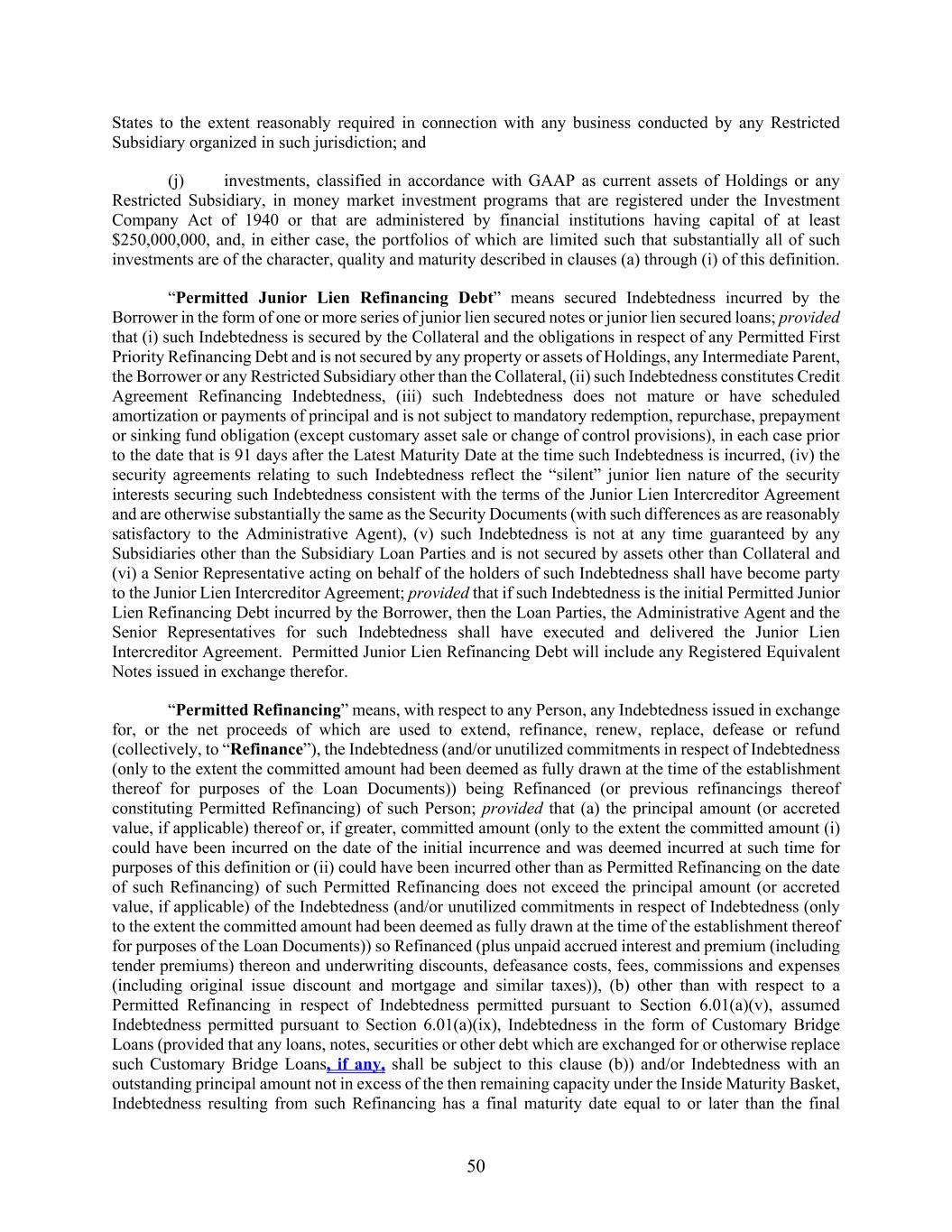 50 States to the extent reasonably required in connection with any business conducted by any Restricted Subsidiary organized in such jurisdiction; and (j) investments, classified in accordance with GAAP as current assets of Holdings or any Restricted Subsidiary, in money market investment programs that are registered under the Investment Company Act of 1940 or that are administered by financial institutions having capital of at least $250,000,000, and, in either case, the portfolios of which are limited such that substantially all of such investments are of the character, quality and maturity described in clauses (a) through (i) of this definition. “Permitted Junior Lien Refinancing Debt” means secured Indebtedness incurred by the Borrower in the form of one or more series of junior lien secured notes or junior lien secured loans; provided that (i) such Indebtedness is secured by the Collateral and the obligations in respect of any Permitted First Priority Refinancing Debt and is not secured by any property or assets of Holdings, any Intermediate Parent, the Borrower or any Restricted Subsidiary other than the Collateral, (ii) such Indebtedness constitutes Credit Agreement Refinancing Indebtedness, (iii) such Indebtedness does not mature or have scheduled amortization or payments of principal and is not subject to mandatory redemption, repurchase, prepayment or sinking fund obligation (except customary asset sale or change of control provisions), in each case prior to the date that is 91 days after the Latest Maturity Date at the time such Indebtedness is incurred, (iv) the security agreements relating to such Indebtedness reflect the “silent” junior lien nature of the security interests securing such Indebtedness consistent with the terms of the Junior Lien Intercreditor Agreement and are otherwise substantially the same as the Security Documents (with such differences as are reasonably satisfactory to the Administrative Agent), (v) such Indebtedness is not at any time guaranteed by any Subsidiaries other than the Subsidiary Loan Parties and is not secured by assets other than Collateral and (vi) a Senior Representative acting on behalf of the holders of such Indebtedness shall have become party to the Junior Lien Intercreditor Agreement; provided that if such Indebtedness is the initial Permitted Junior Lien Refinancing Debt incurred by the Borrower, then the Loan Parties, the Administrative Agent and the Senior Representatives for such Indebtedness shall have executed and delivered the Junior Lien Intercreditor Agreement. Permitted Junior Lien Refinancing Debt will include any Registered Equivalent Notes issued in exchange therefor. “Permitted Refinancing” means, with respect to any Person, any Indebtedness issued in exchange for, or the net proceeds of which are used to extend, refinance, renew, replace, defease or refund (collectively, to “Refinance”), the Indebtedness (and/or unutilized commitments in respect of Indebtedness (only to the extent the committed amount had been deemed as fully drawn at the time of the establishment thereof for purposes of the Loan Documents)) being Refinanced (or previous refinancings thereof constituting Permitted Refinancing) of such Person; provided that (a) the principal amount (or accreted value, if applicable) thereof or, if greater, committed amount (only to the extent the committed amount (i) could have been incurred on the date of the initial incurrence and was deemed incurred at such time for purposes of this definition or (ii) could have been incurred other than as Permitted Refinancing on the date of such Refinancing) of such Permitted Refinancing does not exceed the principal amount (or accreted value, if applicable) of the Indebtedness (and/or unutilized commitments in respect of Indebtedness (only to the extent the committed amount had been deemed as fully drawn at the time of the establishment thereof for purposes of the Loan Documents)) so Refinanced (plus unpaid accrued interest and premium (including tender premiums) thereon and underwriting discounts, defeasance costs, fees, commissions and expenses (including original issue discount and mortgage and similar taxes)), (b) other than with respect to a Permitted Refinancing in respect of Indebtedness permitted pursuant to Section 6.01(a)(v), assumed Indebtedness permitted pursuant to Section 6.01(a)(ix), Indebtedness in the form of Customary Bridge Loans (provided that any loans, notes, securities or other debt which are exchanged for or otherwise replace such Customary Bridge Loans, if any, shall be subject to this clause (b)) and/or Indebtedness with an outstanding principal amount not in excess of the then remaining capacity under the Inside Maturity Basket, Indebtedness resulting from such Refinancing has a final maturity date equal to or later than the final