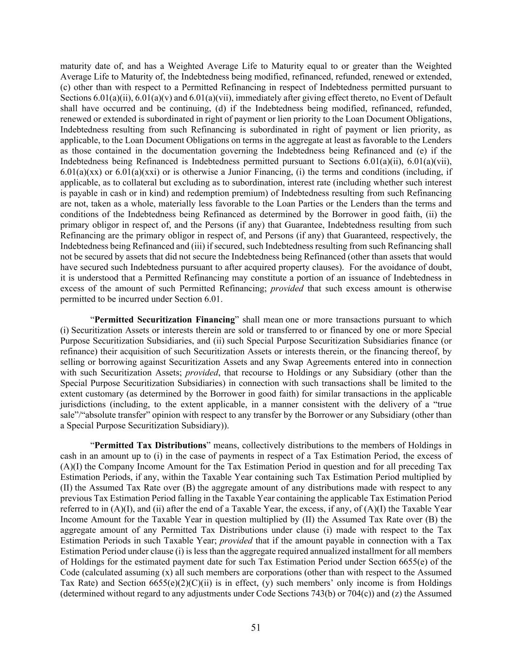 51 maturity date of, and has a Weighted Average Life to Maturity equal to or greater than the Weighted Average Life to Maturity of, the Indebtedness being modified, refinanced, refunded, renewed or extended, (c) other than with respect to a Permitted Refinancing in respect of Indebtedness permitted pursuant to Sections 6.01(a)(ii), 6.01(a)(v) and 6.01(a)(vii), immediately after giving effect thereto, no Event of Default shall have occurred and be continuing, (d) if the Indebtedness being modified, refinanced, refunded, renewed or extended is subordinated in right of payment or lien priority to the Loan Document Obligations, Indebtedness resulting from such Refinancing is subordinated in right of payment or lien priority, as applicable, to the Loan Document Obligations on terms in the aggregate at least as favorable to the Lenders as those contained in the documentation governing the Indebtedness being Refinanced and (e) if the Indebtedness being Refinanced is Indebtedness permitted pursuant to Sections 6.01(a)(ii), 6.01(a)(vii), 6.01(a)(xx) or 6.01(a)(xxi) or is otherwise a Junior Financing, (i) the terms and conditions (including, if applicable, as to collateral but excluding as to subordination, interest rate (including whether such interest is payable in cash or in kind) and redemption premium) of Indebtedness resulting from such Refinancing are not, taken as a whole, materially less favorable to the Loan Parties or the Lenders than the terms and conditions of the Indebtedness being Refinanced as determined by the Borrower in good faith, (ii) the primary obligor in respect of, and the Persons (if any) that Guarantee, Indebtedness resulting from such Refinancing are the primary obligor in respect of, and Persons (if any) that Guaranteed, respectively, the Indebtedness being Refinanced and (iii) if secured, such Indebtedness resulting from such Refinancing shall not be secured by assets that did not secure the Indebtedness being Refinanced (other than assets that would have secured such Indebtedness pursuant to after acquired property clauses). For the avoidance of doubt, it is understood that a Permitted Refinancing may constitute a portion of an issuance of Indebtedness in excess of the amount of such Permitted Refinancing; provided that such excess amount is otherwise permitted to be incurred under Section 6.01. “Permitted Securitization Financing” shall mean one or more transactions pursuant to which (i) Securitization Assets or interests therein are sold or transferred to or financed by one or more Special Purpose Securitization Subsidiaries, and (ii) such Special Purpose Securitization Subsidiaries finance (or refinance) their acquisition of such Securitization Assets or interests therein, or the financing thereof, by selling or borrowing against Securitization Assets and any Swap Agreements entered into in connection with such Securitization Assets; provided, that recourse to Holdings or any Subsidiary (other than the Special Purpose Securitization Subsidiaries) in connection with such transactions shall be limited to the extent customary (as determined by the Borrower in good faith) for similar transactions in the applicable jurisdictions (including, to the extent applicable, in a manner consistent with the delivery of a “true sale”/“absolute transfer” opinion with respect to any transfer by the Borrower or any Subsidiary (other than a Special Purpose Securitization Subsidiary)). “Permitted Tax Distributions” means, collectively distributions to the members of Holdings in cash in an amount up to (i) in the case of payments in respect of a Tax Estimation Period, the excess of (A)(I) the Company Income Amount for the Tax Estimation Period in question and for all preceding Tax Estimation Periods, if any, within the Taxable Year containing such Tax Estimation Period multiplied by (II) the Assumed Tax Rate over (B) the aggregate amount of any distributions made with respect to any previous Tax Estimation Period falling in the Taxable Year containing the applicable Tax Estimation Period referred to in (A)(I), and (ii) after the end of a Taxable Year, the excess, if any, of (A)(I) the Taxable Year Income Amount for the Taxable Year in question multiplied by (II) the Assumed Tax Rate over (B) the aggregate amount of any Permitted Tax Distributions under clause (i) made with respect to the Tax Estimation Periods in such Taxable Year; provided that if the amount payable in connection with a Tax Estimation Period under clause (i) is less than the aggregate required annualized installment for all members of Holdings for the estimated payment date for such Tax Estimation Period under Section 6655(e) of the Code (calculated assuming (x) all such members are corporations (other than with respect to the Assumed Tax Rate) and Section 6655(e)(2)(C)(ii) is in effect, (y) such members’ only income is from Holdings (determined without regard to any adjustments under Code Sections 743(b) or 704(c)) and (z) the Assumed