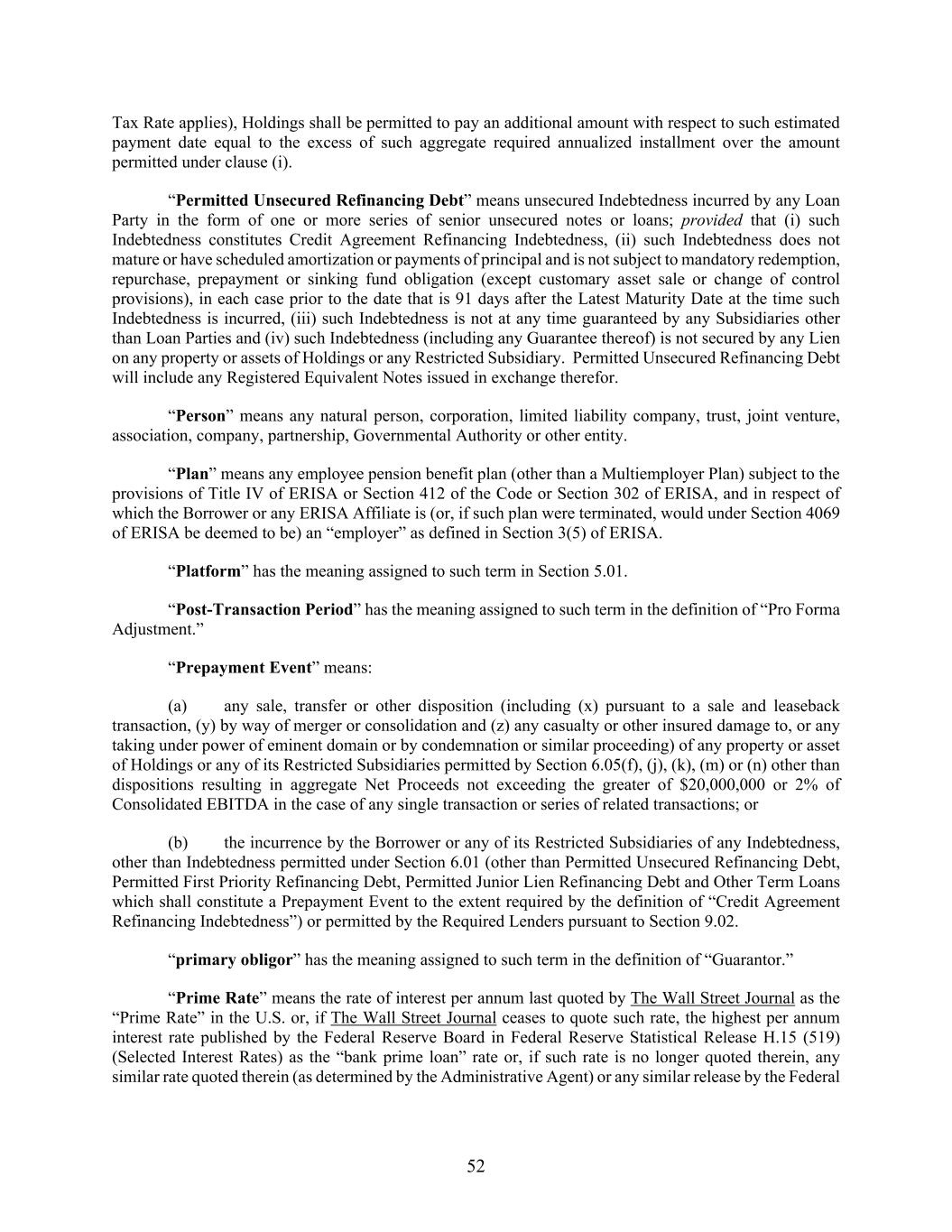 52 Tax Rate applies), Holdings shall be permitted to pay an additional amount with respect to such estimated payment date equal to the excess of such aggregate required annualized installment over the amount permitted under clause (i). “Permitted Unsecured Refinancing Debt” means unsecured Indebtedness incurred by any Loan Party in the form of one or more series of senior unsecured notes or loans; provided that (i) such Indebtedness constitutes Credit Agreement Refinancing Indebtedness, (ii) such Indebtedness does not mature or have scheduled amortization or payments of principal and is not subject to mandatory redemption, repurchase, prepayment or sinking fund obligation (except customary asset sale or change of control provisions), in each case prior to the date that is 91 days after the Latest Maturity Date at the time such Indebtedness is incurred, (iii) such Indebtedness is not at any time guaranteed by any Subsidiaries other than Loan Parties and (iv) such Indebtedness (including any Guarantee thereof) is not secured by any Lien on any property or assets of Holdings or any Restricted Subsidiary. Permitted Unsecured Refinancing Debt will include any Registered Equivalent Notes issued in exchange therefor. “Person” means any natural person, corporation, limited liability company, trust, joint venture, association, company, partnership, Governmental Authority or other entity. “Plan” means any employee pension benefit plan (other than a Multiemployer Plan) subject to the provisions of Title IV of ERISA or Section 412 of the Code or Section 302 of ERISA, and in respect of which the Borrower or any ERISA Affiliate is (or, if such plan were terminated, would under Section 4069 of ERISA be deemed to be) an “employer” as defined in Section 3(5) of ERISA. “Platform” has the meaning assigned to such term in Section 5.01. “Post-Transaction Period” has the meaning assigned to such term in the definition of “Pro Forma Adjustment.” “Prepayment Event” means: (a) any sale, transfer or other disposition (including (x) pursuant to a sale and leaseback transaction, (y) by way of merger or consolidation and (z) any casualty or other insured damage to, or any taking under power of eminent domain or by condemnation or similar proceeding) of any property or asset of Holdings or any of its Restricted Subsidiaries permitted by Section 6.05(f), (j), (k), (m) or (n) other than dispositions resulting in aggregate Net Proceeds not exceeding the greater of $20,000,000 or 2% of Consolidated EBITDA in the case of any single transaction or series of related transactions; or (b) the incurrence by the Borrower or any of its Restricted Subsidiaries of any Indebtedness, other than Indebtedness permitted under Section 6.01 (other than Permitted Unsecured Refinancing Debt, Permitted First Priority Refinancing Debt, Permitted Junior Lien Refinancing Debt and Other Term Loans which shall constitute a Prepayment Event to the extent required by the definition of “Credit Agreement Refinancing Indebtedness”) or permitted by the Required Lenders pursuant to Section 9.02. “primary obligor” has the meaning assigned to such term in the definition of “Guarantor.” “Prime Rate” means the rate of interest per annum last quoted by The Wall Street Journal as the “Prime Rate” in the U.S. or, if The Wall Street Journal ceases to quote such rate, the highest per annum interest rate published by the Federal Reserve Board in Federal Reserve Statistical Release H.15 (519) (Selected Interest Rates) as the “bank prime loan” rate or, if such rate is no longer quoted therein, any similar rate quoted therein (as determined by the Administrative Agent) or any similar release by the Federal
