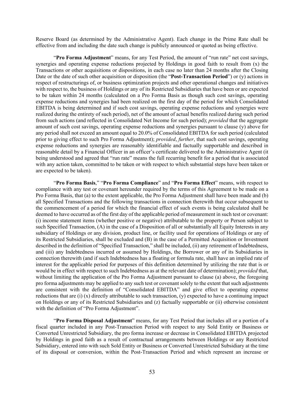 53 Reserve Board (as determined by the Administrative Agent). Each change in the Prime Rate shall be effective from and including the date such change is publicly announced or quoted as being effective. “Pro Forma Adjustment” means, for any Test Period, the amount of “run rate” net cost savings, synergies and operating expense reductions projected by Holdings in good faith to result from (x) the Transactions or other acquisitions or dispositions, in each case no later than 24 months after the Closing Date or the date of such other acquisition or disposition (the “Post-Transaction Period”) or (y) actions in respect of restructurings of, or business optimization projects and other operational changes and initiatives with respect to, the business of Holdings or any of its Restricted Subsidiaries that have been or are expected to be taken within 24 months (calculated on a Pro Forma Basis as though such cost savings, operating expense reductions and synergies had been realized on the first day of the period for which Consolidated EBITDA is being determined and if such cost savings, operating expense reductions and synergies were realized during the entirety of such period), net of the amount of actual benefits realized during such period from such actions (and reflected in Consolidated Net Income for such period); provided that the aggregate amount of such cost savings, operating expense reductions and synergies pursuant to clause (y) above for any period shall not exceed an amount equal to 20.0% of Consolidated EBITDA for such period (calculated prior to giving effect to such Pro Forma Adjustment); provided, further, that such cost savings, operating expense reductions and synergies are reasonably identifiable and factually supportable and described in reasonable detail by a Financial Officer in an officer’s certificate delivered to the Administrative Agent (it being understood and agreed that “run rate” means the full recurring benefit for a period that is associated with any action taken, committed to be taken or with respect to which substantial steps have been taken or are expected to be taken). “Pro Forma Basis,” “Pro Forma Compliance” and “Pro Forma Effect” means, with respect to compliance with any test or covenant hereunder required by the terms of this Agreement to be made on a Pro Forma Basis, that (a) to the extent applicable, the Pro Forma Adjustment shall have been made and (b) all Specified Transactions and the following transactions in connection therewith that occur subsequent to the commencement of a period for which the financial effect of such events is being calculated shall be deemed to have occurred as of the first day of the applicable period of measurement in such test or covenant: (i) income statement items (whether positive or negative) attributable to the property or Person subject to such Specified Transaction, (A) in the case of a Disposition of all or substantially all Equity Interests in any subsidiary of Holdings or any division, product line, or facility used for operations of Holdings or any of its Restricted Subsidiaries, shall be excluded and (B) in the case of a Permitted Acquisition or Investment described in the definition of “Specified Transaction,” shall be included, (ii) any retirement of Indebtedness, and (iii) any Indebtedness incurred or assumed by Holdings, the Borrower or any of its Subsidiaries in connection therewith (and if such Indebtedness has a floating or formula rate, shall have an implied rate of interest for the applicable period for purposes of this definition determined by utilizing the rate that is or would be in effect with respect to such Indebtedness as at the relevant date of determination); provided that, without limiting the application of the Pro Forma Adjustment pursuant to clause (a) above, the foregoing pro forma adjustments may be applied to any such test or covenant solely to the extent that such adjustments are consistent with the definition of “Consolidated EBITDA” and give effect to operating expense reductions that are (i) (x) directly attributable to such transaction, (y) expected to have a continuing impact on Holdings or any of its Restricted Subsidiaries and (z) factually supportable or (ii) otherwise consistent with the definition of “Pro Forma Adjustment”. “Pro Forma Disposal Adjustment” means, for any Test Period that includes all or a portion of a fiscal quarter included in any Post-Transaction Period with respect to any Sold Entity or Business or Converted Unrestricted Subsidiary, the pro forma increase or decrease in Consolidated EBITDA projected by Holdings in good faith as a result of contractual arrangements between Holdings or any Restricted Subsidiary, entered into with such Sold Entity or Business or Converted Unrestricted Subsidiary at the time of its disposal or conversion, within the Post-Transaction Period and which represent an increase or