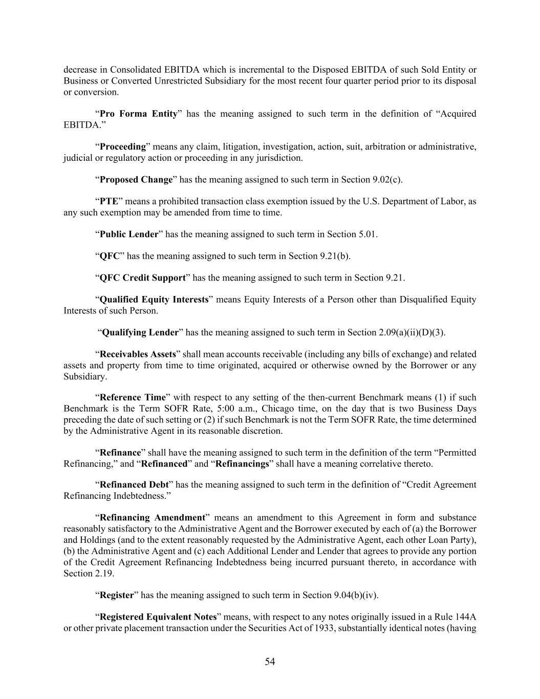 54 decrease in Consolidated EBITDA which is incremental to the Disposed EBITDA of such Sold Entity or Business or Converted Unrestricted Subsidiary for the most recent four quarter period prior to its disposal or conversion. “Pro Forma Entity” has the meaning assigned to such term in the definition of “Acquired EBITDA.” “Proceeding” means any claim, litigation, investigation, action, suit, arbitration or administrative, judicial or regulatory action or proceeding in any jurisdiction. “Proposed Change” has the meaning assigned to such term in Section 9.02(c). “PTE” means a prohibited transaction class exemption issued by the U.S. Department of Labor, as any such exemption may be amended from time to time. “Public Lender” has the meaning assigned to such term in Section 5.01. “QFC” has the meaning assigned to such term in Section 9.21(b). “QFC Credit Support” has the meaning assigned to such term in Section 9.21. “Qualified Equity Interests” means Equity Interests of a Person other than Disqualified Equity Interests of such Person. “Qualifying Lender” has the meaning assigned to such term in Section 2.09(a)(ii)(D)(3). “Receivables Assets” shall mean accounts receivable (including any bills of exchange) and related assets and property from time to time originated, acquired or otherwise owned by the Borrower or any Subsidiary. “Reference Time” with respect to any setting of the then-current Benchmark means (1) if such Benchmark is the Term SOFR Rate, 5:00 a.m., Chicago time, on the day that is two Business Days preceding the date of such setting or (2) if such Benchmark is not the Term SOFR Rate, the time determined by the Administrative Agent in its reasonable discretion. “Refinance” shall have the meaning assigned to such term in the definition of the term “Permitted Refinancing,” and “Refinanced” and “Refinancings” shall have a meaning correlative thereto. “Refinanced Debt” has the meaning assigned to such term in the definition of “Credit Agreement Refinancing Indebtedness.” “Refinancing Amendment” means an amendment to this Agreement in form and substance reasonably satisfactory to the Administrative Agent and the Borrower executed by each of (a) the Borrower and Holdings (and to the extent reasonably requested by the Administrative Agent, each other Loan Party), (b) the Administrative Agent and (c) each Additional Lender and Lender that agrees to provide any portion of the Credit Agreement Refinancing Indebtedness being incurred pursuant thereto, in accordance with Section 2.19. “Register” has the meaning assigned to such term in Section 9.04(b)(iv). “Registered Equivalent Notes” means, with respect to any notes originally issued in a Rule 144A or other private placement transaction under the Securities Act of 1933, substantially identical notes (having
