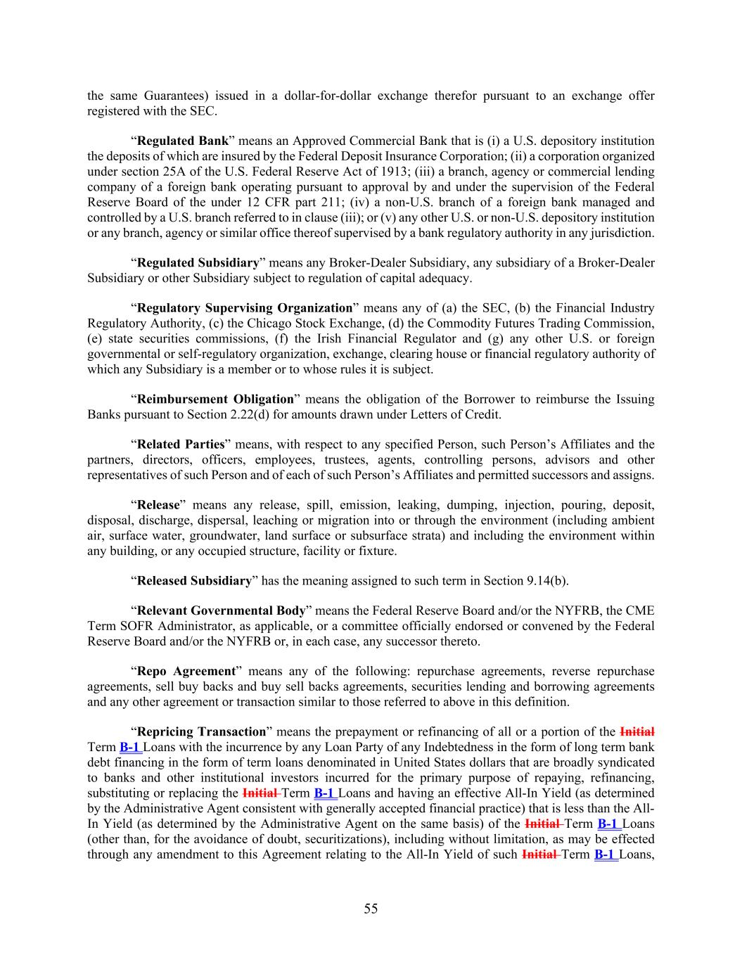 55 the same Guarantees) issued in a dollar-for-dollar exchange therefor pursuant to an exchange offer registered with the SEC. “Regulated Bank” means an Approved Commercial Bank that is (i) a U.S. depository institution the deposits of which are insured by the Federal Deposit Insurance Corporation; (ii) a corporation organized under section 25A of the U.S. Federal Reserve Act of 1913; (iii) a branch, agency or commercial lending company of a foreign bank operating pursuant to approval by and under the supervision of the Federal Reserve Board of the under 12 CFR part 211; (iv) a non-U.S. branch of a foreign bank managed and controlled by a U.S. branch referred to in clause (iii); or (v) any other U.S. or non-U.S. depository institution or any branch, agency or similar office thereof supervised by a bank regulatory authority in any jurisdiction. “Regulated Subsidiary” means any Broker-Dealer Subsidiary, any subsidiary of a Broker-Dealer Subsidiary or other Subsidiary subject to regulation of capital adequacy. “Regulatory Supervising Organization” means any of (a) the SEC, (b) the Financial Industry Regulatory Authority, (c) the Chicago Stock Exchange, (d) the Commodity Futures Trading Commission, (e) state securities commissions, (f) the Irish Financial Regulator and (g) any other U.S. or foreign governmental or self-regulatory organization, exchange, clearing house or financial regulatory authority of which any Subsidiary is a member or to whose rules it is subject. “Reimbursement Obligation” means the obligation of the Borrower to reimburse the Issuing Banks pursuant to Section 2.22(d) for amounts drawn under Letters of Credit. “Related Parties” means, with respect to any specified Person, such Person’s Affiliates and the partners, directors, officers, employees, trustees, agents, controlling persons, advisors and other representatives of such Person and of each of such Person’s Affiliates and permitted successors and assigns. “Release” means any release, spill, emission, leaking, dumping, injection, pouring, deposit, disposal, discharge, dispersal, leaching or migration into or through the environment (including ambient air, surface water, groundwater, land surface or subsurface strata) and including the environment within any building, or any occupied structure, facility or fixture. “Released Subsidiary” has the meaning assigned to such term in Section 9.14(b). “Relevant Governmental Body” means the Federal Reserve Board and/or the NYFRB, the CME Term SOFR Administrator, as applicable, or a committee officially endorsed or convened by the Federal Reserve Board and/or the NYFRB or, in each case, any successor thereto. “Repo Agreement” means any of the following: repurchase agreements, reverse repurchase agreements, sell buy backs and buy sell backs agreements, securities lending and borrowing agreements and any other agreement or transaction similar to those referred to above in this definition. “Repricing Transaction” means the prepayment or refinancing of all or a portion of the Initial Term B-1 Loans with the incurrence by any Loan Party of any Indebtedness in the form of long term bank debt financing in the form of term loans denominated in United States dollars that are broadly syndicated to banks and other institutional investors incurred for the primary purpose of repaying, refinancing, substituting or replacing the Initial Term B-1 Loans and having an effective All-In Yield (as determined by the Administrative Agent consistent with generally accepted financial practice) that is less than the All- In Yield (as determined by the Administrative Agent on the same basis) of the Initial Term B-1 Loans (other than, for the avoidance of doubt, securitizations), including without limitation, as may be effected through any amendment to this Agreement relating to the All-In Yield of such Initial Term B-1 Loans,