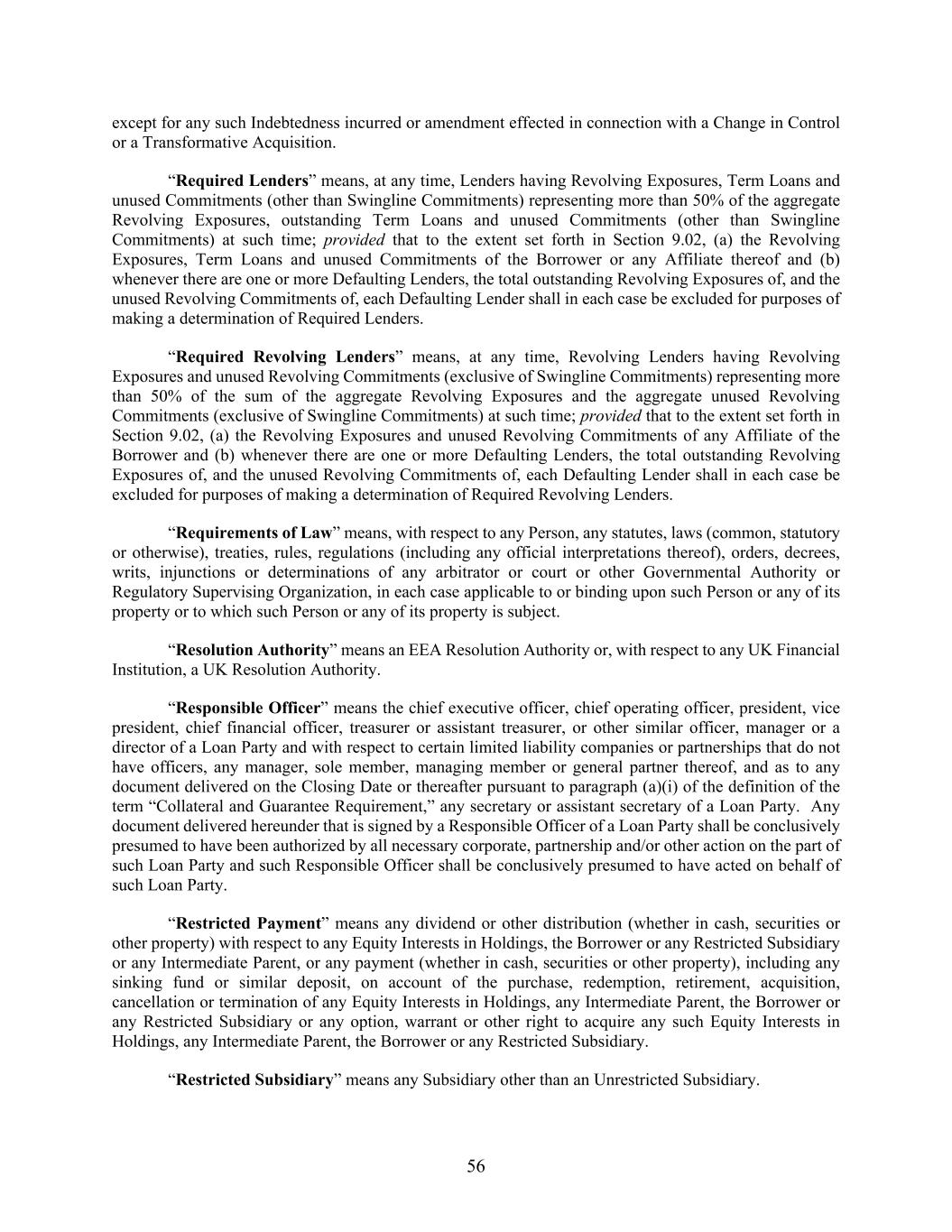 56 except for any such Indebtedness incurred or amendment effected in connection with a Change in Control or a Transformative Acquisition. “Required Lenders” means, at any time, Lenders having Revolving Exposures, Term Loans and unused Commitments (other than Swingline Commitments) representing more than 50% of the aggregate Revolving Exposures, outstanding Term Loans and unused Commitments (other than Swingline Commitments) at such time; provided that to the extent set forth in Section 9.02, (a) the Revolving Exposures, Term Loans and unused Commitments of the Borrower or any Affiliate thereof and (b) whenever there are one or more Defaulting Lenders, the total outstanding Revolving Exposures of, and the unused Revolving Commitments of, each Defaulting Lender shall in each case be excluded for purposes of making a determination of Required Lenders. “Required Revolving Lenders” means, at any time, Revolving Lenders having Revolving Exposures and unused Revolving Commitments (exclusive of Swingline Commitments) representing more than 50% of the sum of the aggregate Revolving Exposures and the aggregate unused Revolving Commitments (exclusive of Swingline Commitments) at such time; provided that to the extent set forth in Section 9.02, (a) the Revolving Exposures and unused Revolving Commitments of any Affiliate of the Borrower and (b) whenever there are one or more Defaulting Lenders, the total outstanding Revolving Exposures of, and the unused Revolving Commitments of, each Defaulting Lender shall in each case be excluded for purposes of making a determination of Required Revolving Lenders. “Requirements of Law” means, with respect to any Person, any statutes, laws (common, statutory or otherwise), treaties, rules, regulations (including any official interpretations thereof), orders, decrees, writs, injunctions or determinations of any arbitrator or court or other Governmental Authority or Regulatory Supervising Organization, in each case applicable to or binding upon such Person or any of its property or to which such Person or any of its property is subject. “Resolution Authority” means an EEA Resolution Authority or, with respect to any UK Financial Institution, a UK Resolution Authority. “Responsible Officer” means the chief executive officer, chief operating officer, president, vice president, chief financial officer, treasurer or assistant treasurer, or other similar officer, manager or a director of a Loan Party and with respect to certain limited liability companies or partnerships that do not have officers, any manager, sole member, managing member or general partner thereof, and as to any document delivered on the Closing Date or thereafter pursuant to paragraph (a)(i) of the definition of the term “Collateral and Guarantee Requirement,” any secretary or assistant secretary of a Loan Party. Any document delivered hereunder that is signed by a Responsible Officer of a Loan Party shall be conclusively presumed to have been authorized by all necessary corporate, partnership and/or other action on the part of such Loan Party and such Responsible Officer shall be conclusively presumed to have acted on behalf of such Loan Party. “Restricted Payment” means any dividend or other distribution (whether in cash, securities or other property) with respect to any Equity Interests in Holdings, the Borrower or any Restricted Subsidiary or any Intermediate Parent, or any payment (whether in cash, securities or other property), including any sinking fund or similar deposit, on account of the purchase, redemption, retirement, acquisition, cancellation or termination of any Equity Interests in Holdings, any Intermediate Parent, the Borrower or any Restricted Subsidiary or any option, warrant or other right to acquire any such Equity Interests in Holdings, any Intermediate Parent, the Borrower or any Restricted Subsidiary. “Restricted Subsidiary” means any Subsidiary other than an Unrestricted Subsidiary.