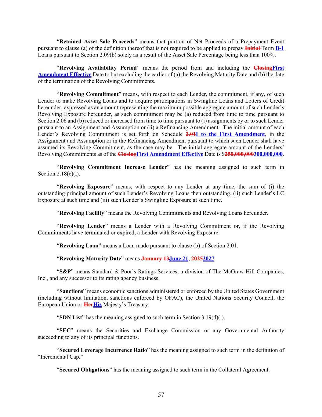 57 “Retained Asset Sale Proceeds” means that portion of Net Proceeds of a Prepayment Event pursuant to clause (a) of the definition thereof that is not required to be applied to prepay Initial Term B-1 Loans pursuant to Section 2.09(b) solely as a result of the Asset Sale Percentage being less than 100%. “Revolving Availability Period” means the period from and including the ClosingFirst Amendment Effective Date to but excluding the earlier of (a) the Revolving Maturity Date and (b) the date of the termination of the Revolving Commitments. “Revolving Commitment” means, with respect to each Lender, the commitment, if any, of such Lender to make Revolving Loans and to acquire participations in Swingline Loans and Letters of Credit hereunder, expressed as an amount representing the maximum possible aggregate amount of such Lender’s Revolving Exposure hereunder, as such commitment may be (a) reduced from time to time pursuant to Section 2.06 and (b) reduced or increased from time to time pursuant to (i) assignments by or to such Lender pursuant to an Assignment and Assumption or (ii) a Refinancing Amendment. The initial amount of each Lender’s Revolving Commitment is set forth on Schedule 2.01I to the First Amendment, in the Assignment and Assumption or in the Refinancing Amendment pursuant to which such Lender shall have assumed its Revolving Commitment, as the case may be. The initial aggregate amount of the Lenders’ Revolving Commitments as of the ClosingFirst Amendment Effective Date is $250,000,000300,000,000. “Revolving Commitment Increase Lender” has the meaning assigned to such term in Section 2.18(c)(i). “Revolving Exposure” means, with respect to any Lender at any time, the sum of (i) the outstanding principal amount of such Lender’s Revolving Loans then outstanding, (ii) such Lender’s LC Exposure at such time and (iii) such Lender’s Swingline Exposure at such time. “Revolving Facility” means the Revolving Commitments and Revolving Loans hereunder. “Revolving Lender” means a Lender with a Revolving Commitment or, if the Revolving Commitments have terminated or expired, a Lender with Revolving Exposure. “Revolving Loan” means a Loan made pursuant to clause (b) of Section 2.01. “Revolving Maturity Date” means January 13June 21, 20252027. “S&P” means Standard & Poor’s Ratings Services, a division of The McGraw-Hill Companies, Inc., and any successor to its rating agency business. “Sanctions” means economic sanctions administered or enforced by the United States Government (including without limitation, sanctions enforced by OFAC), the United Nations Security Council, the European Union or HerHis Majesty’s Treasury. “SDN List” has the meaning assigned to such term in Section 3.19(d)(i). “SEC” means the Securities and Exchange Commission or any Governmental Authority succeeding to any of its principal functions. “Secured Leverage Incurrence Ratio” has the meaning assigned to such term in the definition of “Incremental Cap.” “Secured Obligations” has the meaning assigned to such term in the Collateral Agreement.