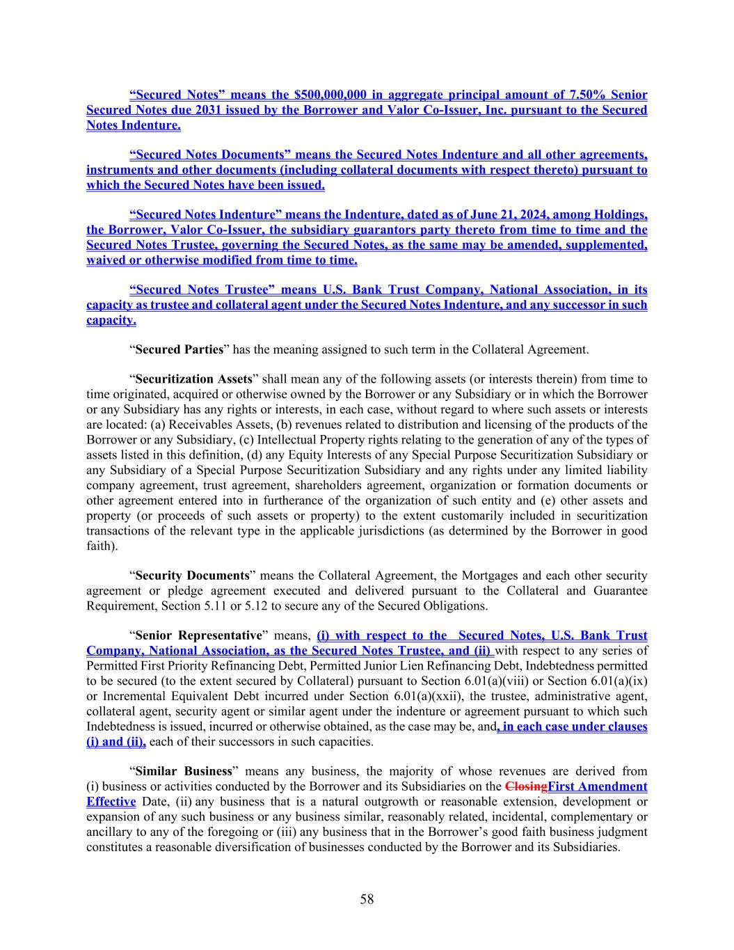 58 “Secured Notes” means the $500,000,000 in aggregate principal amount of 7.50% Senior Secured Notes due 2031 issued by the Borrower and Valor Co-Issuer, Inc. pursuant to the Secured Notes Indenture. “Secured Notes Documents” means the Secured Notes Indenture and all other agreements, instruments and other documents (including collateral documents with respect thereto) pursuant to which the Secured Notes have been issued. “Secured Notes Indenture” means the Indenture, dated as of June 21, 2024, among Holdings, the Borrower, Valor Co-Issuer, the subsidiary guarantors party thereto from time to time and the Secured Notes Trustee, governing the Secured Notes, as the same may be amended, supplemented, waived or otherwise modified from time to time. “Secured Notes Trustee” means U.S. Bank Trust Company, National Association, in its capacity as trustee and collateral agent under the Secured Notes Indenture, and any successor in such capacity. “Secured Parties” has the meaning assigned to such term in the Collateral Agreement. “Securitization Assets” shall mean any of the following assets (or interests therein) from time to time originated, acquired or otherwise owned by the Borrower or any Subsidiary or in which the Borrower or any Subsidiary has any rights or interests, in each case, without regard to where such assets or interests are located: (a) Receivables Assets, (b) revenues related to distribution and licensing of the products of the Borrower or any Subsidiary, (c) Intellectual Property rights relating to the generation of any of the types of assets listed in this definition, (d) any Equity Interests of any Special Purpose Securitization Subsidiary or any Subsidiary of a Special Purpose Securitization Subsidiary and any rights under any limited liability company agreement, trust agreement, shareholders agreement, organization or formation documents or other agreement entered into in furtherance of the organization of such entity and (e) other assets and property (or proceeds of such assets or property) to the extent customarily included in securitization transactions of the relevant type in the applicable jurisdictions (as determined by the Borrower in good faith). “Security Documents” means the Collateral Agreement, the Mortgages and each other security agreement or pledge agreement executed and delivered pursuant to the Collateral and Guarantee Requirement, Section 5.11 or 5.12 to secure any of the Secured Obligations. “Senior Representative” means, (i) with respect to the Secured Notes, U.S. Bank Trust Company, National Association, as the Secured Notes Trustee, and (ii) with respect to any series of Permitted First Priority Refinancing Debt, Permitted Junior Lien Refinancing Debt, Indebtedness permitted to be secured (to the extent secured by Collateral) pursuant to Section 6.01(a)(viii) or Section 6.01(a)(ix) or Incremental Equivalent Debt incurred under Section 6.01(a)(xxii), the trustee, administrative agent, collateral agent, security agent or similar agent under the indenture or agreement pursuant to which such Indebtedness is issued, incurred or otherwise obtained, as the case may be, and, in each case under clauses (i) and (ii), each of their successors in such capacities. “Similar Business” means any business, the majority of whose revenues are derived from (i) business or activities conducted by the Borrower and its Subsidiaries on the ClosingFirst Amendment Effective Date, (ii) any business that is a natural outgrowth or reasonable extension, development or expansion of any such business or any business similar, reasonably related, incidental, complementary or ancillary to any of the foregoing or (iii) any business that in the Borrower’s good faith business judgment constitutes a reasonable diversification of businesses conducted by the Borrower and its Subsidiaries.