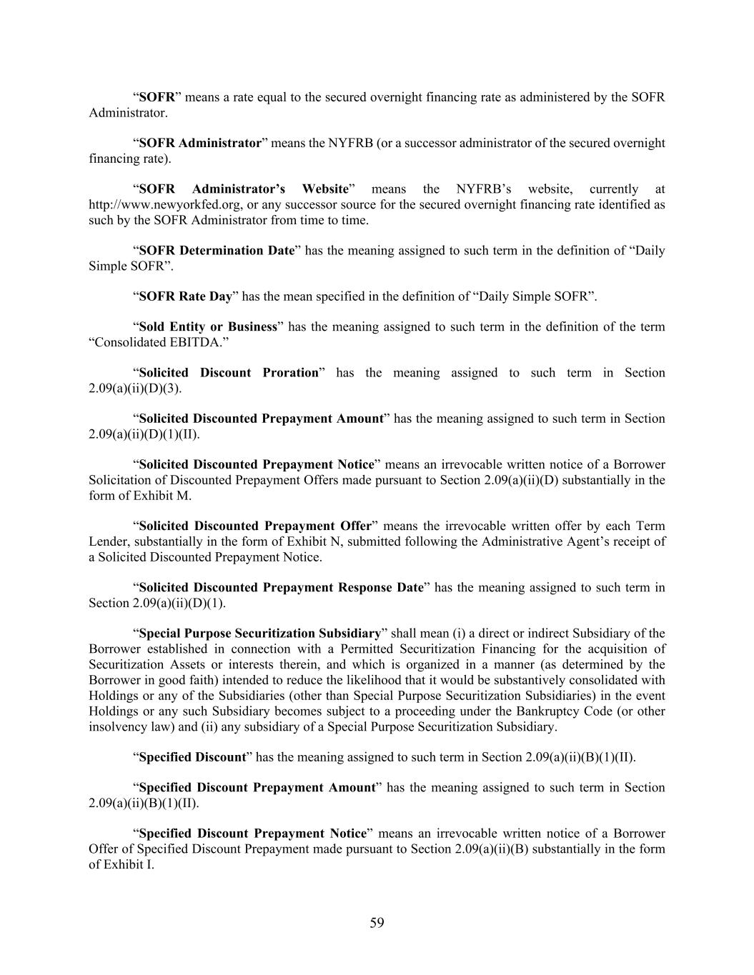 59 “SOFR” means a rate equal to the secured overnight financing rate as administered by the SOFR Administrator. “SOFR Administrator” means the NYFRB (or a successor administrator of the secured overnight financing rate). “SOFR Administrator’s Website” means the NYFRB’s website, currently at http://www.newyorkfed.org, or any successor source for the secured overnight financing rate identified as such by the SOFR Administrator from time to time. “SOFR Determination Date” has the meaning assigned to such term in the definition of “Daily Simple SOFR”. “SOFR Rate Day” has the mean specified in the definition of “Daily Simple SOFR”. “Sold Entity or Business” has the meaning assigned to such term in the definition of the term “Consolidated EBITDA.” “Solicited Discount Proration” has the meaning assigned to such term in Section 2.09(a)(ii)(D)(3). “Solicited Discounted Prepayment Amount” has the meaning assigned to such term in Section 2.09(a)(ii)(D)(1)(II). “Solicited Discounted Prepayment Notice” means an irrevocable written notice of a Borrower Solicitation of Discounted Prepayment Offers made pursuant to Section 2.09(a)(ii)(D) substantially in the form of Exhibit M. “Solicited Discounted Prepayment Offer” means the irrevocable written offer by each Term Lender, substantially in the form of Exhibit N, submitted following the Administrative Agent’s receipt of a Solicited Discounted Prepayment Notice. “Solicited Discounted Prepayment Response Date” has the meaning assigned to such term in Section 2.09(a)(ii)(D)(1). “Special Purpose Securitization Subsidiary” shall mean (i) a direct or indirect Subsidiary of the Borrower established in connection with a Permitted Securitization Financing for the acquisition of Securitization Assets or interests therein, and which is organized in a manner (as determined by the Borrower in good faith) intended to reduce the likelihood that it would be substantively consolidated with Holdings or any of the Subsidiaries (other than Special Purpose Securitization Subsidiaries) in the event Holdings or any such Subsidiary becomes subject to a proceeding under the Bankruptcy Code (or other insolvency law) and (ii) any subsidiary of a Special Purpose Securitization Subsidiary. “Specified Discount” has the meaning assigned to such term in Section 2.09(a)(ii)(B)(1)(II). “Specified Discount Prepayment Amount” has the meaning assigned to such term in Section 2.09(a)(ii)(B)(1)(II). “Specified Discount Prepayment Notice” means an irrevocable written notice of a Borrower Offer of Specified Discount Prepayment made pursuant to Section 2.09(a)(ii)(B) substantially in the form of Exhibit I.