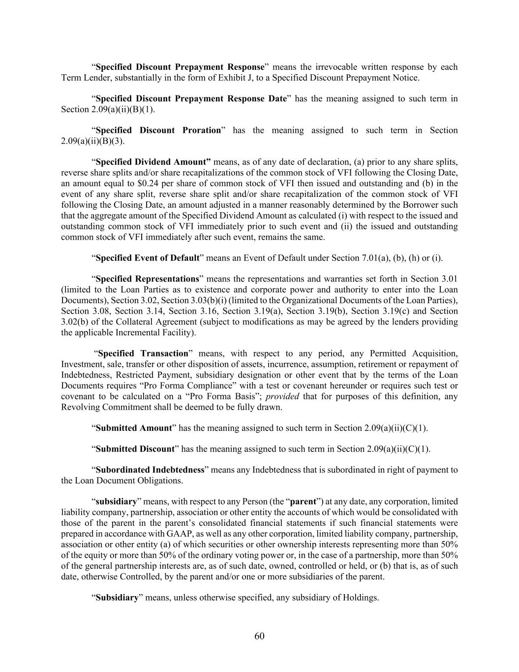 60 “Specified Discount Prepayment Response” means the irrevocable written response by each Term Lender, substantially in the form of Exhibit J, to a Specified Discount Prepayment Notice. “Specified Discount Prepayment Response Date” has the meaning assigned to such term in Section 2.09(a)(ii)(B)(1). “Specified Discount Proration” has the meaning assigned to such term in Section 2.09(a)(ii)(B)(3). “Specified Dividend Amount” means, as of any date of declaration, (a) prior to any share splits, reverse share splits and/or share recapitalizations of the common stock of VFI following the Closing Date, an amount equal to $0.24 per share of common stock of VFI then issued and outstanding and (b) in the event of any share split, reverse share split and/or share recapitalization of the common stock of VFI following the Closing Date, an amount adjusted in a manner reasonably determined by the Borrower such that the aggregate amount of the Specified Dividend Amount as calculated (i) with respect to the issued and outstanding common stock of VFI immediately prior to such event and (ii) the issued and outstanding common stock of VFI immediately after such event, remains the same. “Specified Event of Default” means an Event of Default under Section 7.01(a), (b), (h) or (i). “Specified Representations” means the representations and warranties set forth in Section 3.01 (limited to the Loan Parties as to existence and corporate power and authority to enter into the Loan Documents), Section 3.02, Section 3.03(b)(i) (limited to the Organizational Documents of the Loan Parties), Section 3.08, Section 3.14, Section 3.16, Section 3.19(a), Section 3.19(b), Section 3.19(c) and Section 3.02(b) of the Collateral Agreement (subject to modifications as may be agreed by the lenders providing the applicable Incremental Facility). “Specified Transaction” means, with respect to any period, any Permitted Acquisition, Investment, sale, transfer or other disposition of assets, incurrence, assumption, retirement or repayment of Indebtedness, Restricted Payment, subsidiary designation or other event that by the terms of the Loan Documents requires “Pro Forma Compliance” with a test or covenant hereunder or requires such test or covenant to be calculated on a “Pro Forma Basis”; provided that for purposes of this definition, any Revolving Commitment shall be deemed to be fully drawn. “Submitted Amount” has the meaning assigned to such term in Section 2.09(a)(ii)(C)(1). “Submitted Discount” has the meaning assigned to such term in Section 2.09(a)(ii)(C)(1). “Subordinated Indebtedness” means any Indebtedness that is subordinated in right of payment to the Loan Document Obligations. “subsidiary” means, with respect to any Person (the “parent”) at any date, any corporation, limited liability company, partnership, association or other entity the accounts of which would be consolidated with those of the parent in the parent’s consolidated financial statements if such financial statements were prepared in accordance with GAAP, as well as any other corporation, limited liability company, partnership, association or other entity (a) of which securities or other ownership interests representing more than 50% of the equity or more than 50% of the ordinary voting power or, in the case of a partnership, more than 50% of the general partnership interests are, as of such date, owned, controlled or held, or (b) that is, as of such date, otherwise Controlled, by the parent and/or one or more subsidiaries of the parent. “Subsidiary” means, unless otherwise specified, any subsidiary of Holdings.