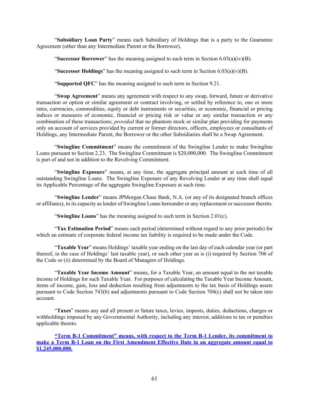 61 “Subsidiary Loan Party” means each Subsidiary of Holdings that is a party to the Guarantee Agreement (other than any Intermediate Parent or the Borrower). “Successor Borrower” has the meaning assigned to such term in Section 6.03(a)(iv)(B). “Successor Holdings” has the meaning assigned to such term in Section 6.03(a)(v)(B). “Supported QFC” has the meaning assigned to such term in Section 9.21. “Swap Agreement” means any agreement with respect to any swap, forward, future or derivative transaction or option or similar agreement or contract involving, or settled by reference to, one or more rates, currencies, commodities, equity or debt instruments or securities, or economic, financial or pricing indices or measures of economic, financial or pricing risk or value or any similar transaction or any combination of these transactions; provided that no phantom stock or similar plan providing for payments only on account of services provided by current or former directors, officers, employees or consultants of Holdings, any Intermediate Parent, the Borrower or the other Subsidiaries shall be a Swap Agreement. “Swingline Commitment” means the commitment of the Swingline Lender to make Swingline Loans pursuant to Section 2.23. The Swingline Commitment is $20,000,000. The Swingline Commitment is part of and not in addition to the Revolving Commitment. “Swingline Exposure” means, at any time, the aggregate principal amount at such time of all outstanding Swingline Loans. The Swingline Exposure of any Revolving Lender at any time shall equal its Applicable Percentage of the aggregate Swingline Exposure at such time. “Swingline Lender” means JPMorgan Chase Bank, N.A. (or any of its designated branch offices or affiliates), in its capacity as lender of Swingline Loans hereunder or any replacement or successor thereto. “Swingline Loans” has the meaning assigned to such term in Section 2.01(c). “Tax Estimation Period” means each period (determined without regard to any prior periods) for which an estimate of corporate federal income tax liability is required to be made under the Code. “Taxable Year” means Holdings’ taxable year ending on the last day of each calendar year (or part thereof, in the case of Holdings’ last taxable year), or such other year as is (i) required by Section 706 of the Code or (ii) determined by the Board of Managers of Holdings. “Taxable Year Income Amount” means, for a Taxable Year, an amount equal to the net taxable income of Holdings for such Taxable Year. For purposes of calculating the Taxable Year Income Amount, items of income, gain, loss and deduction resulting from adjustments to the tax basis of Holdings assets pursuant to Code Section 743(b) and adjustments pursuant to Code Section 704(c) shall not be taken into account. “Taxes” means any and all present or future taxes, levies, imposts, duties, deductions, charges or withholdings imposed by any Governmental Authority, including any interest, additions to tax or penalties applicable thereto. “Term B-1 Commitment” means, with respect to the Term B-1 Lender, its commitment to make a Term B-1 Loan on the First Amendment Effective Date in an aggregate amount equal to $1,245,000,000.