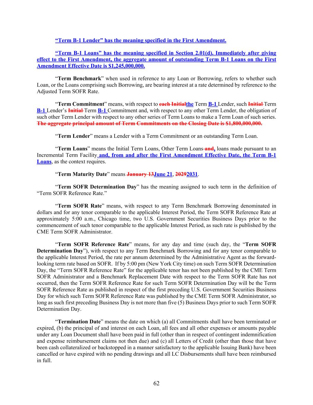 62 “Term B-1 Lender” has the meaning specified in the First Amendment. “Term B-1 Loans” has the meaning specified in Section 2.01(d). Immediately after giving effect to the First Amendment, the aggregate amount of outstanding Term B-1 Loans on the First Amendment Effective Date is $1,245,000,000. “Term Benchmark” when used in reference to any Loan or Borrowing, refers to whether such Loan, or the Loans comprising such Borrowing, are bearing interest at a rate determined by reference to the Adjusted Term SOFR Rate. “Term Commitment” means, with respect to each Initialthe Term B-1 Lender, such Initial Term B-1 Lender’s Initial Term B-1 Commitment and, with respect to any other Term Lender, the obligation of such other Term Lender with respect to any other series of Term Loans to make a Term Loan of such series. The aggregate principal amount of Term Commitments on the Closing Date is $1,800,000,000. “Term Lender” means a Lender with a Term Commitment or an outstanding Term Loan. “Term Loans” means the Initial Term Loans, Other Term Loans and, loans made pursuant to an Incremental Term Facility and, from and after the First Amendment Effective Date, the Term B-1 Loans, as the context requires. “Term Maturity Date” means January 13June 21, 20292031. “Term SOFR Determination Day” has the meaning assigned to such term in the definition of “Term SOFR Reference Rate.” “Term SOFR Rate” means, with respect to any Term Benchmark Borrowing denominated in dollars and for any tenor comparable to the applicable Interest Period, the Term SOFR Reference Rate at approximately 5:00 a.m., Chicago time, two U.S. Government Securities Business Days prior to the commencement of such tenor comparable to the applicable Interest Period, as such rate is published by the CME Term SOFR Administrator. “Term SOFR Reference Rate” means, for any day and time (such day, the “Term SOFR Determination Day”), with respect to any Term Benchmark Borrowing and for any tenor comparable to the applicable Interest Period, the rate per annum determined by the Administrative Agent as the forward- looking term rate based on SOFR. If by 5:00 pm (New York City time) on such Term SOFR Determination Day, the “Term SOFR Reference Rate” for the applicable tenor has not been published by the CME Term SOFR Administrator and a Benchmark Replacement Date with respect to the Term SOFR Rate has not occurred, then the Term SOFR Reference Rate for such Term SOFR Determination Day will be the Term SOFR Reference Rate as published in respect of the first preceding U.S. Government Securities Business Day for which such Term SOFR Reference Rate was published by the CME Term SOFR Administrator, so long as such first preceding Business Day is not more than five (5) Business Days prior to such Term SOFR Determination Day. “Termination Date” means the date on which (a) all Commitments shall have been terminated or expired, (b) the principal of and interest on each Loan, all fees and all other expenses or amounts payable under any Loan Document shall have been paid in full (other than in respect of contingent indemnification and expense reimbursement claims not then due) and (c) all Letters of Credit (other than those that have been cash collateralized or backstopped in a manner satisfactory to the applicable Issuing Bank) have been cancelled or have expired with no pending drawings and all LC Disbursements shall have been reimbursed in full.