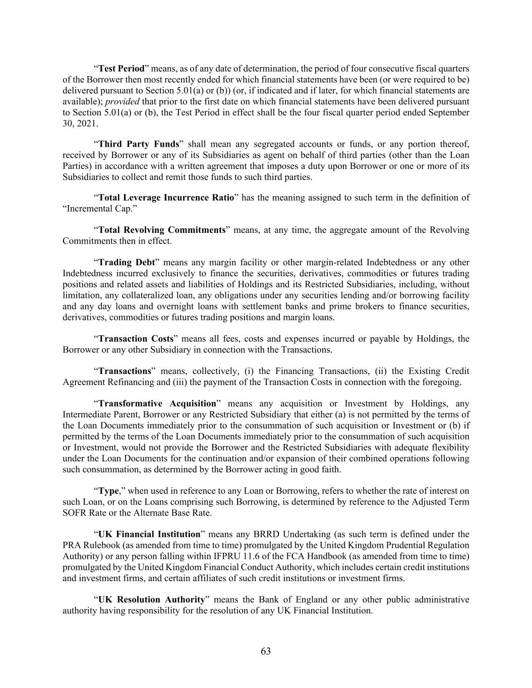 63 “Test Period” means, as of any date of determination, the period of four consecutive fiscal quarters of the Borrower then most recently ended for which financial statements have been (or were required to be) delivered pursuant to Section 5.01(a) or (b)) (or, if indicated and if later, for which financial statements are available); provided that prior to the first date on which financial statements have been delivered pursuant to Section 5.01(a) or (b), the Test Period in effect shall be the four fiscal quarter period ended September 30, 2021. “Third Party Funds” shall mean any segregated accounts or funds, or any portion thereof, received by Borrower or any of its Subsidiaries as agent on behalf of third parties (other than the Loan Parties) in accordance with a written agreement that imposes a duty upon Borrower or one or more of its Subsidiaries to collect and remit those funds to such third parties. “Total Leverage Incurrence Ratio” has the meaning assigned to such term in the definition of “Incremental Cap.” “Total Revolving Commitments” means, at any time, the aggregate amount of the Revolving Commitments then in effect. “Trading Debt” means any margin facility or other margin-related Indebtedness or any other Indebtedness incurred exclusively to finance the securities, derivatives, commodities or futures trading positions and related assets and liabilities of Holdings and its Restricted Subsidiaries, including, without limitation, any collateralized loan, any obligations under any securities lending and/or borrowing facility and any day loans and overnight loans with settlement banks and prime brokers to finance securities, derivatives, commodities or futures trading positions and margin loans. “Transaction Costs” means all fees, costs and expenses incurred or payable by Holdings, the Borrower or any other Subsidiary in connection with the Transactions. “Transactions” means, collectively, (i) the Financing Transactions, (ii) the Existing Credit Agreement Refinancing and (iii) the payment of the Transaction Costs in connection with the foregoing. “Transformative Acquisition” means any acquisition or Investment by Holdings, any Intermediate Parent, Borrower or any Restricted Subsidiary that either (a) is not permitted by the terms of the Loan Documents immediately prior to the consummation of such acquisition or Investment or (b) if permitted by the terms of the Loan Documents immediately prior to the consummation of such acquisition or Investment, would not provide the Borrower and the Restricted Subsidiaries with adequate flexibility under the Loan Documents for the continuation and/or expansion of their combined operations following such consummation, as determined by the Borrower acting in good faith. “Type,” when used in reference to any Loan or Borrowing, refers to whether the rate of interest on such Loan, or on the Loans comprising such Borrowing, is determined by reference to the Adjusted Term SOFR Rate or the Alternate Base Rate. “UK Financial Institution” means any BRRD Undertaking (as such term is defined under the PRA Rulebook (as amended from time to time) promulgated by the United Kingdom Prudential Regulation Authority) or any person falling within IFPRU 11.6 of the FCA Handbook (as amended from time to time) promulgated by the United Kingdom Financial Conduct Authority, which includes certain credit institutions and investment firms, and certain affiliates of such credit institutions or investment firms. “UK Resolution Authority” means the Bank of England or any other public administrative authority having responsibility for the resolution of any UK Financial Institution.