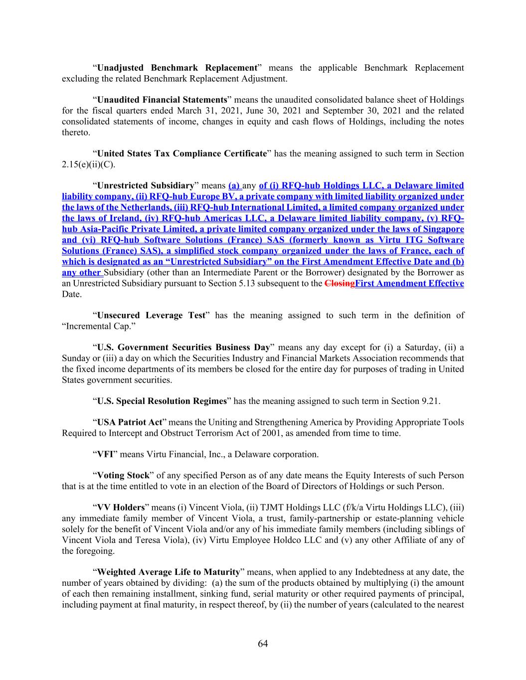 64 “Unadjusted Benchmark Replacement” means the applicable Benchmark Replacement excluding the related Benchmark Replacement Adjustment. “Unaudited Financial Statements” means the unaudited consolidated balance sheet of Holdings for the fiscal quarters ended March 31, 2021, June 30, 2021 and September 30, 2021 and the related consolidated statements of income, changes in equity and cash flows of Holdings, including the notes thereto. “United States Tax Compliance Certificate” has the meaning assigned to such term in Section 2.15(e)(ii)(C). “Unrestricted Subsidiary” means (a) any of (i) RFQ-hub Holdings LLC, a Delaware limited liability company, (ii) RFQ-hub Europe BV, a private company with limited liability organized under the laws of the Netherlands, (iii) RFQ-hub International Limited, a limited company organized under the laws of Ireland, (iv) RFQ-hub Americas LLC, a Delaware limited liability company, (v) RFQ- hub Asia-Pacific Private Limited, a private limited company organized under the laws of Singapore and (vi) RFQ-hub Software Solutions (France) SAS (formerly known as Virtu ITG Software Solutions (France) SAS), a simplified stock company organized under the laws of France, each of which is designated as an “Unrestricted Subsidiary” on the First Amendment Effective Date and (b) any other Subsidiary (other than an Intermediate Parent or the Borrower) designated by the Borrower as an Unrestricted Subsidiary pursuant to Section 5.13 subsequent to the ClosingFirst Amendment Effective Date. “Unsecured Leverage Test” has the meaning assigned to such term in the definition of “Incremental Cap.” “U.S. Government Securities Business Day” means any day except for (i) a Saturday, (ii) a Sunday or (iii) a day on which the Securities Industry and Financial Markets Association recommends that the fixed income departments of its members be closed for the entire day for purposes of trading in United States government securities. “U.S. Special Resolution Regimes” has the meaning assigned to such term in Section 9.21. “USA Patriot Act” means the Uniting and Strengthening America by Providing Appropriate Tools Required to Intercept and Obstruct Terrorism Act of 2001, as amended from time to time. “VFI” means Virtu Financial, Inc., a Delaware corporation. “Voting Stock” of any specified Person as of any date means the Equity Interests of such Person that is at the time entitled to vote in an election of the Board of Directors of Holdings or such Person. “VV Holders” means (i) Vincent Viola, (ii) TJMT Holdings LLC (f/k/a Virtu Holdings LLC), (iii) any immediate family member of Vincent Viola, a trust, family-partnership or estate-planning vehicle solely for the benefit of Vincent Viola and/or any of his immediate family members (including siblings of Vincent Viola and Teresa Viola), (iv) Virtu Employee Holdco LLC and (v) any other Affiliate of any of the foregoing. “Weighted Average Life to Maturity” means, when applied to any Indebtedness at any date, the number of years obtained by dividing: (a) the sum of the products obtained by multiplying (i) the amount of each then remaining installment, sinking fund, serial maturity or other required payments of principal, including payment at final maturity, in respect thereof, by (ii) the number of years (calculated to the nearest