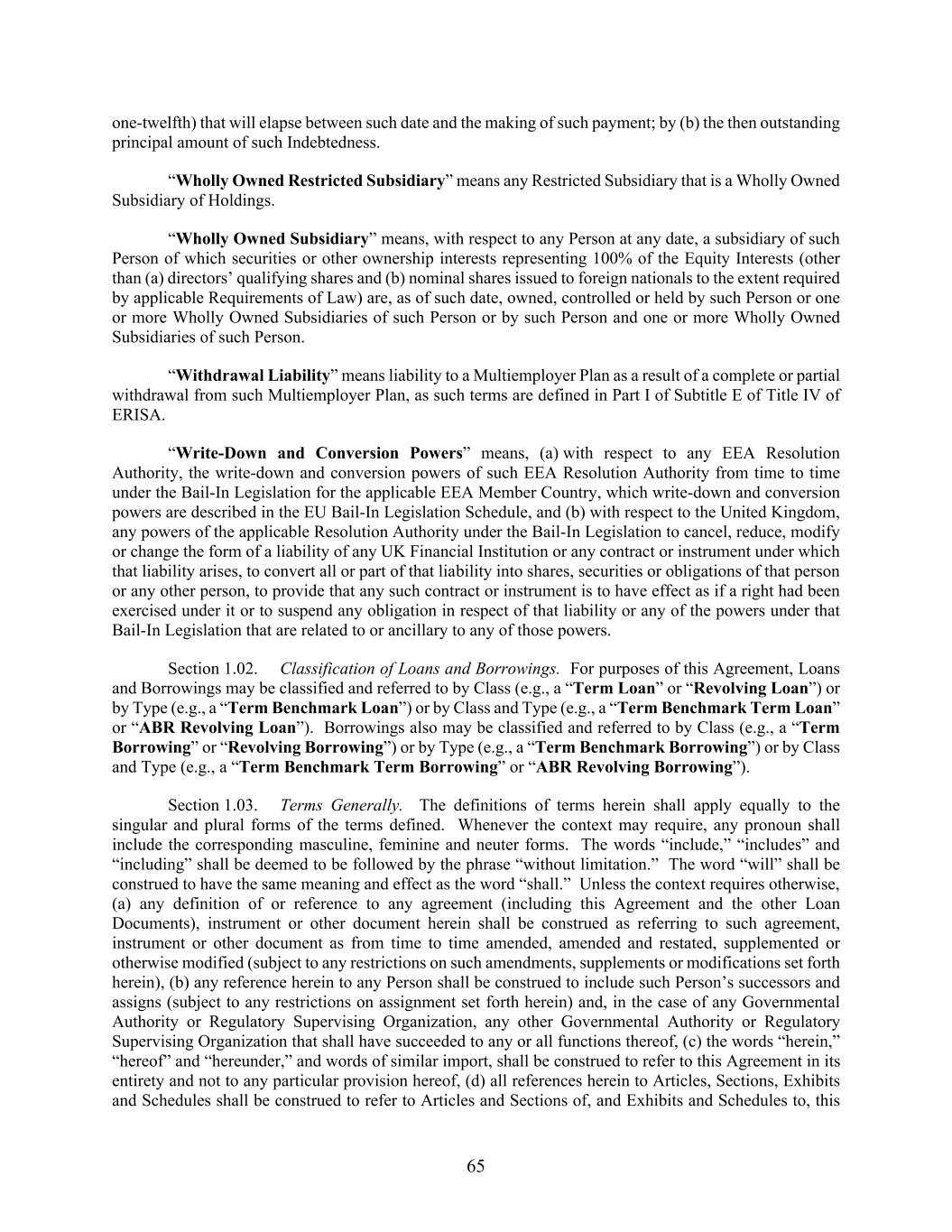 65 one-twelfth) that will elapse between such date and the making of such payment; by (b) the then outstanding principal amount of such Indebtedness. “Wholly Owned Restricted Subsidiary” means any Restricted Subsidiary that is a Wholly Owned Subsidiary of Holdings. “Wholly Owned Subsidiary” means, with respect to any Person at any date, a subsidiary of such Person of which securities or other ownership interests representing 100% of the Equity Interests (other than (a) directors’ qualifying shares and (b) nominal shares issued to foreign nationals to the extent required by applicable Requirements of Law) are, as of such date, owned, controlled or held by such Person or one or more Wholly Owned Subsidiaries of such Person or by such Person and one or more Wholly Owned Subsidiaries of such Person. “Withdrawal Liability” means liability to a Multiemployer Plan as a result of a complete or partial withdrawal from such Multiemployer Plan, as such terms are defined in Part I of Subtitle E of Title IV of ERISA. “Write-Down and Conversion Powers” means, (a) with respect to any EEA Resolution Authority, the write-down and conversion powers of such EEA Resolution Authority from time to time under the Bail-In Legislation for the applicable EEA Member Country, which write-down and conversion powers are described in the EU Bail-In Legislation Schedule, and (b) with respect to the United Kingdom, any powers of the applicable Resolution Authority under the Bail-In Legislation to cancel, reduce, modify or change the form of a liability of any UK Financial Institution or any contract or instrument under which that liability arises, to convert all or part of that liability into shares, securities or obligations of that person or any other person, to provide that any such contract or instrument is to have effect as if a right had been exercised under it or to suspend any obligation in respect of that liability or any of the powers under that Bail-In Legislation that are related to or ancillary to any of those powers. Section 1.02. Classification of Loans and Borrowings. For purposes of this Agreement, Loans and Borrowings may be classified and referred to by Class (e.g., a “Term Loan” or “Revolving Loan”) or by Type (e.g., a “Term Benchmark Loan”) or by Class and Type (e.g., a “Term Benchmark Term Loan” or “ABR Revolving Loan”). Borrowings also may be classified and referred to by Class (e.g., a “Term Borrowing” or “Revolving Borrowing”) or by Type (e.g., a “Term Benchmark Borrowing”) or by Class and Type (e.g., a “Term Benchmark Term Borrowing” or “ABR Revolving Borrowing”). Section 1.03. Terms Generally. The definitions of terms herein shall apply equally to the singular and plural forms of the terms defined. Whenever the context may require, any pronoun shall include the corresponding masculine, feminine and neuter forms. The words “include,” “includes” and “including” shall be deemed to be followed by the phrase “without limitation.” The word “will” shall be construed to have the same meaning and effect as the word “shall.” Unless the context requires otherwise, (a) any definition of or reference to any agreement (including this Agreement and the other Loan Documents), instrument or other document herein shall be construed as referring to such agreement, instrument or other document as from time to time amended, amended and restated, supplemented or otherwise modified (subject to any restrictions on such amendments, supplements or modifications set forth herein), (b) any reference herein to any Person shall be construed to include such Person’s successors and assigns (subject to any restrictions on assignment set forth herein) and, in the case of any Governmental Authority or Regulatory Supervising Organization, any other Governmental Authority or Regulatory Supervising Organization that shall have succeeded to any or all functions thereof, (c) the words “herein,” “hereof” and “hereunder,” and words of similar import, shall be construed to refer to this Agreement in its entirety and not to any particular provision hereof, (d) all references herein to Articles, Sections, Exhibits and Schedules shall be construed to refer to Articles and Sections of, and Exhibits and Schedules to, this